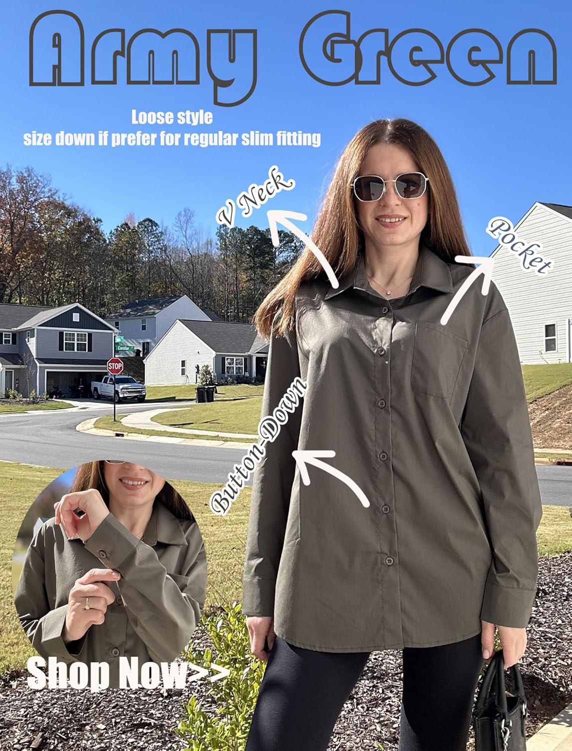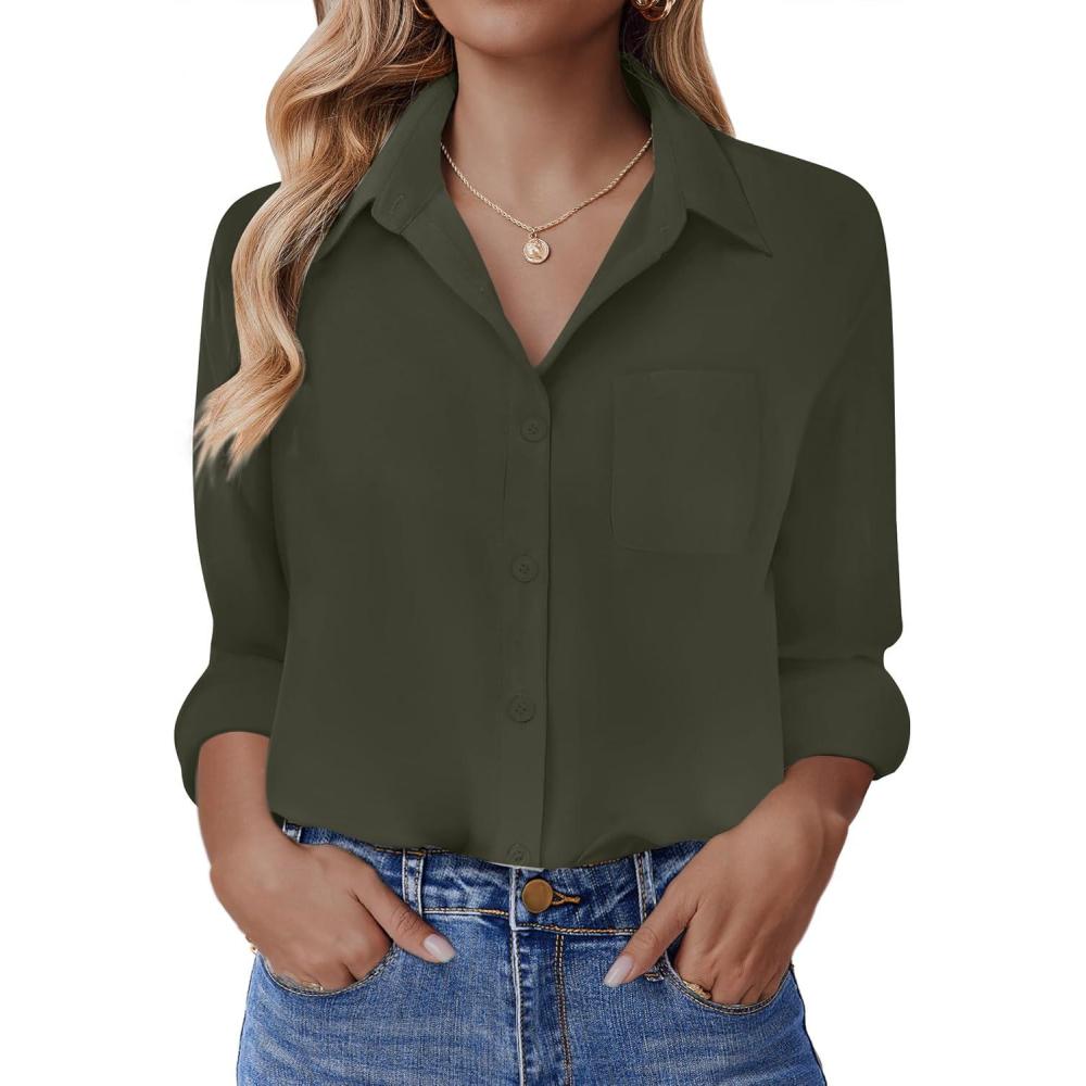 HOTOUCH Button Down Shirt for Women Basic Work Office Drop Shoulder Blouse Casual Loose Long Sleeve Tops with Pocket(Army Green)