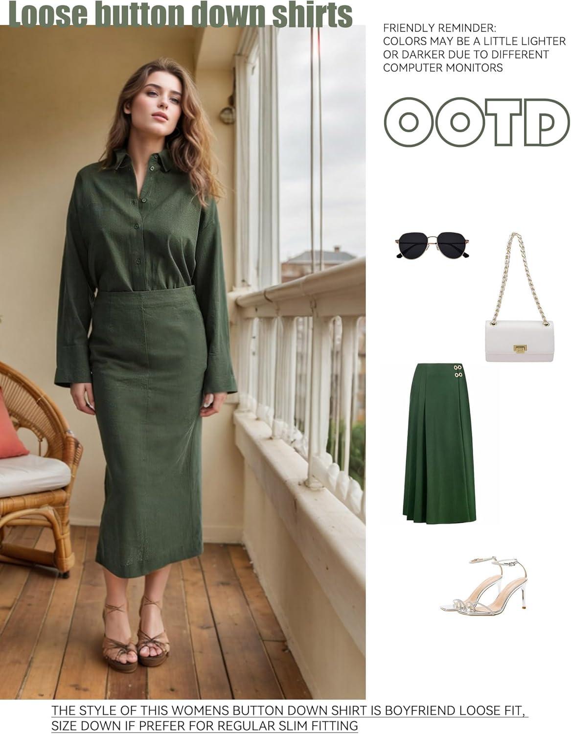 imageHOTOUCH Button Down Shirt for Women Basic Work Office Drop Shoulder Blouse Casual Loose Long Sleeve Tops with PocketArmy Green