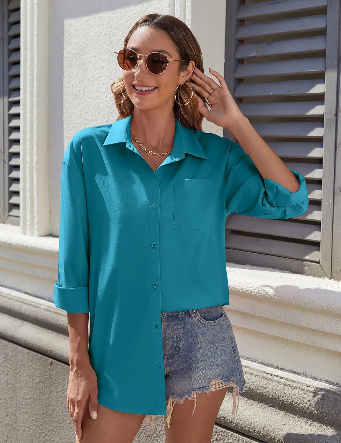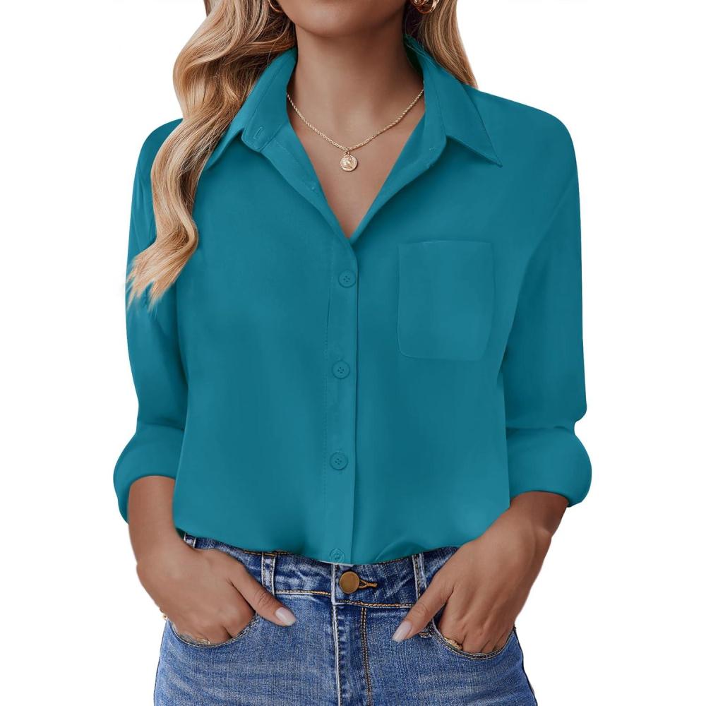 HOTOUCH Button Down Shirt for Women Basic Work Office Drop Shoulder Blouse Casual Loose Long Sleeve Tops with Pocket(Peacock Blue)