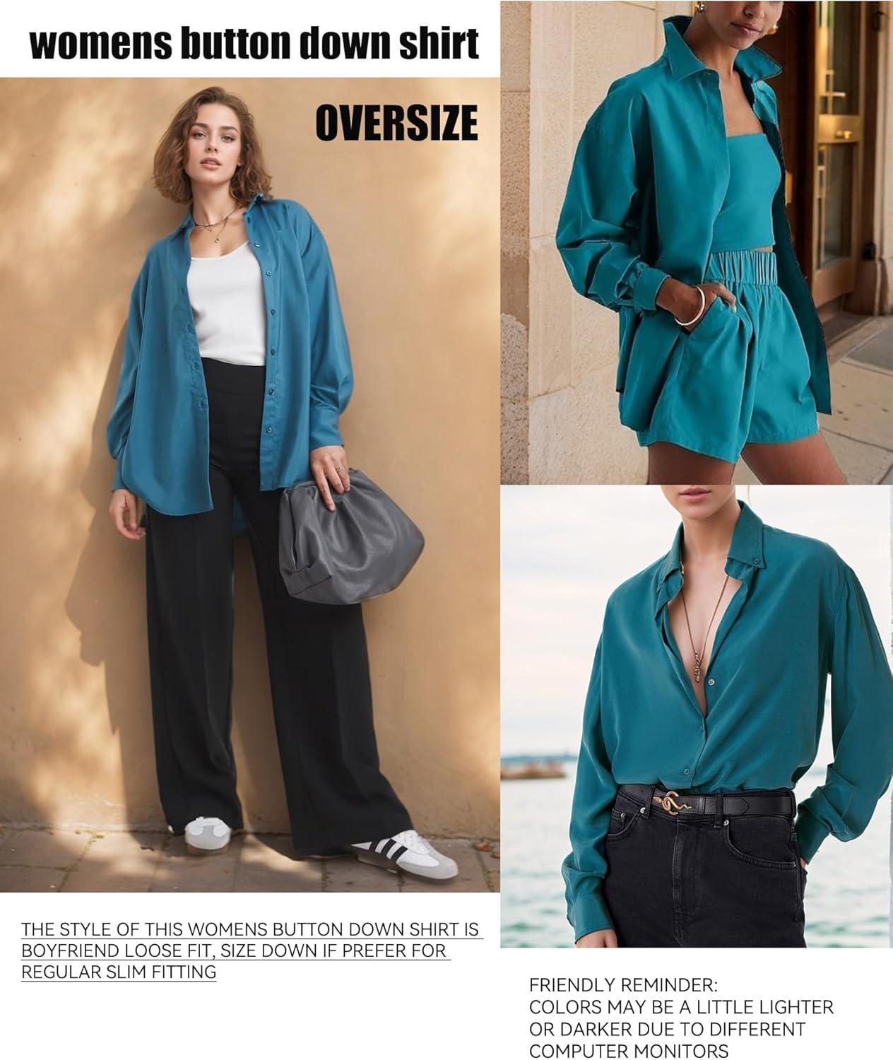 imageHOTOUCH Button Down Shirt for Women Basic Work Office Drop Shoulder Blouse Casual Loose Long Sleeve Tops with PocketPeacock Blue