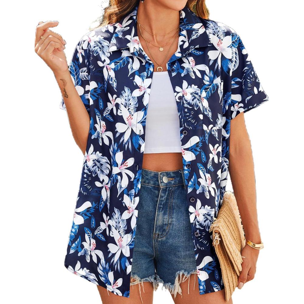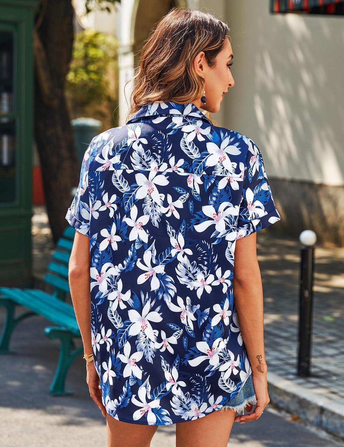 HOTOUCH Hawaiian Shirts for Women Summer Cool Hawaii Floral Tropic Print Blouses Beach Short Sleeve Button Up Tops(Blue Floral)