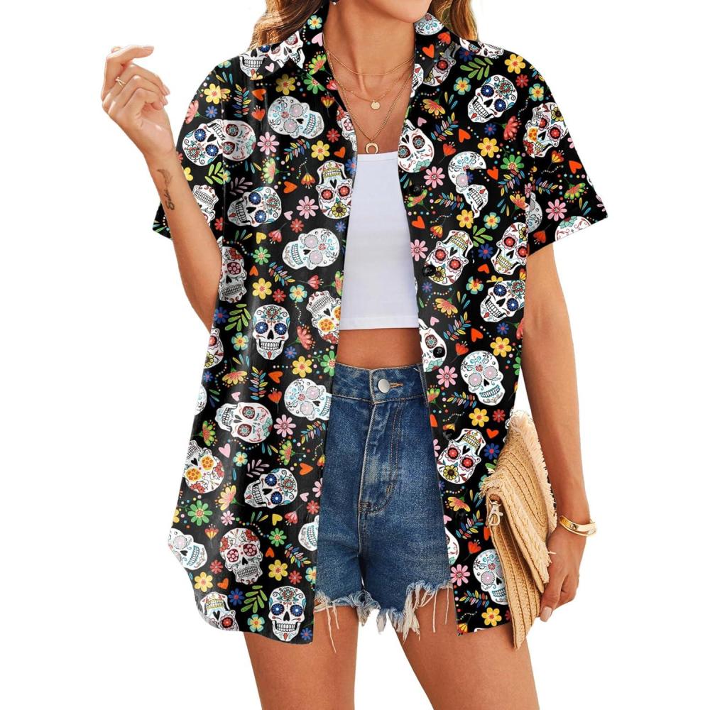 HOTOUCH Hawaiian Shirts for Women Summer Cool Hawaii Floral Tropic Print Blouses Beach Short Sleeve Button Up Tops(Halloween Skulls)