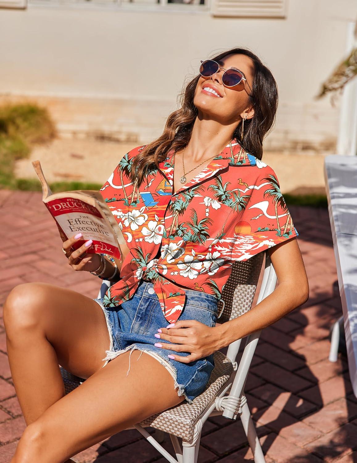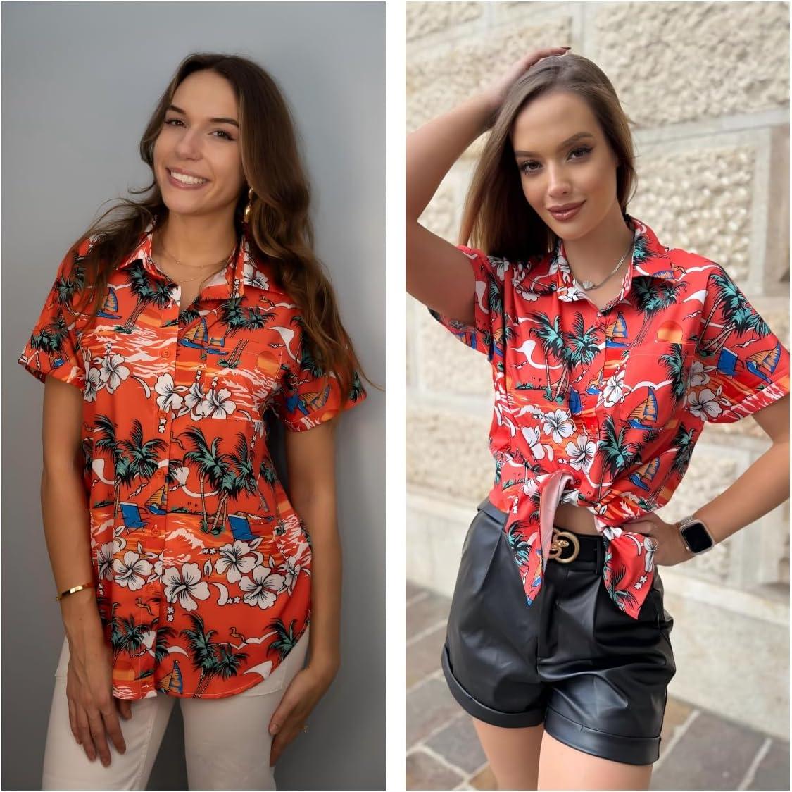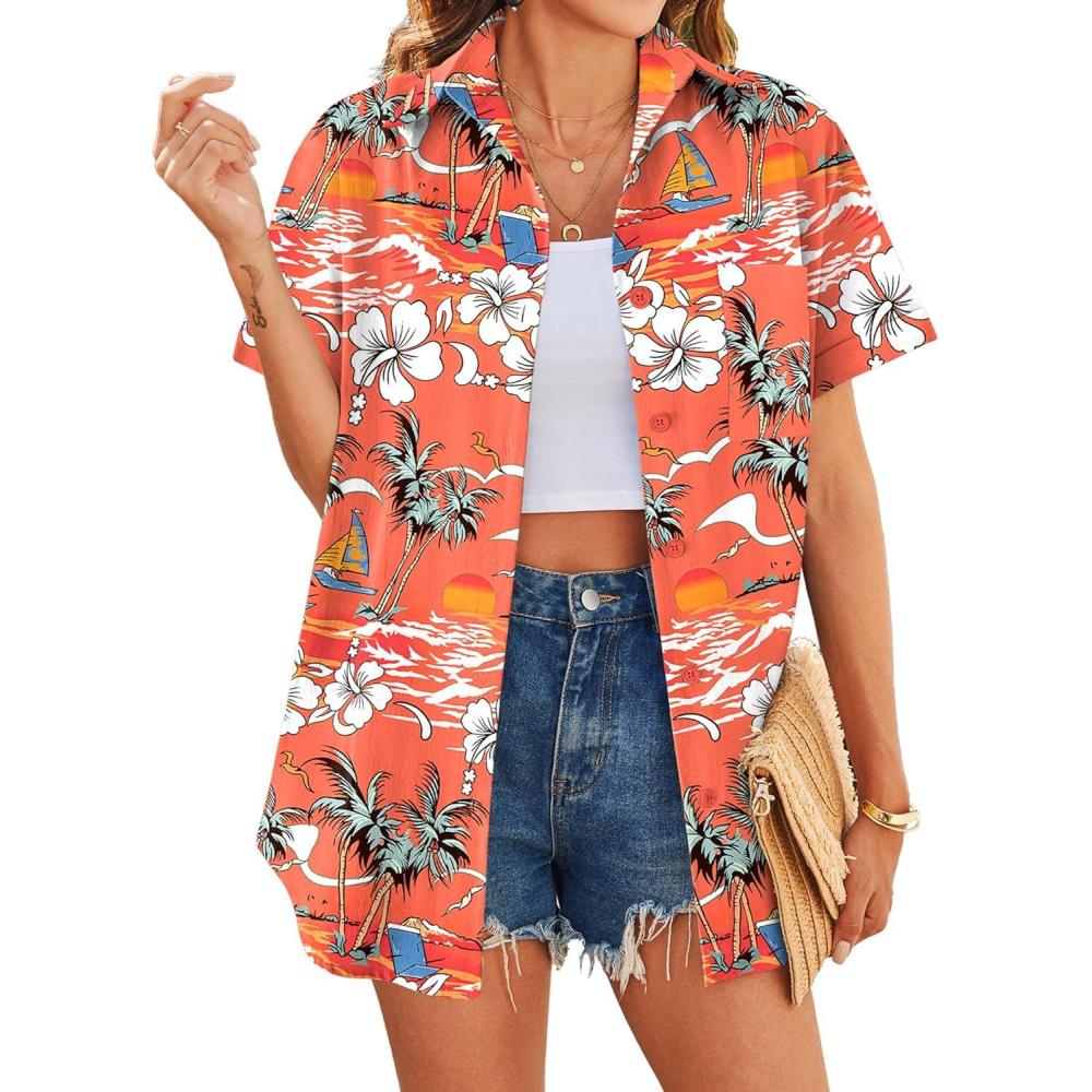 HOTOUCH Hawaiian Shirts for Women Summer Cool Hawaii Floral Tropic Print Blouses Beach Short Sleeve Button Up Tops(Orange Hawaii)