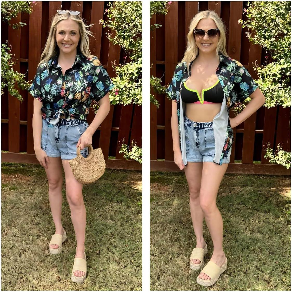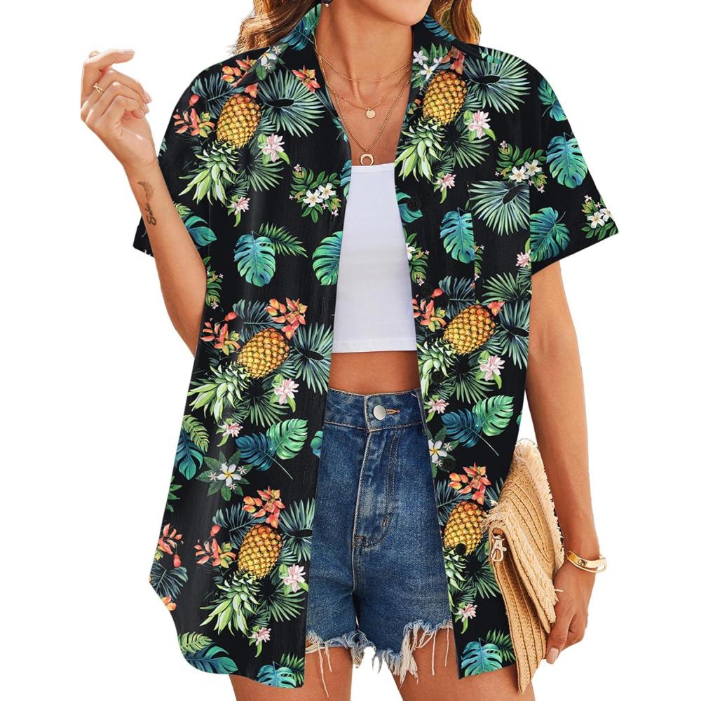 HOTOUCH Hawaiian Shirts for Women Summer Cool Hawaii Floral Tropic Print Blouses Beach Short Sleeve Button Up Tops(Pineapple Tropical)
