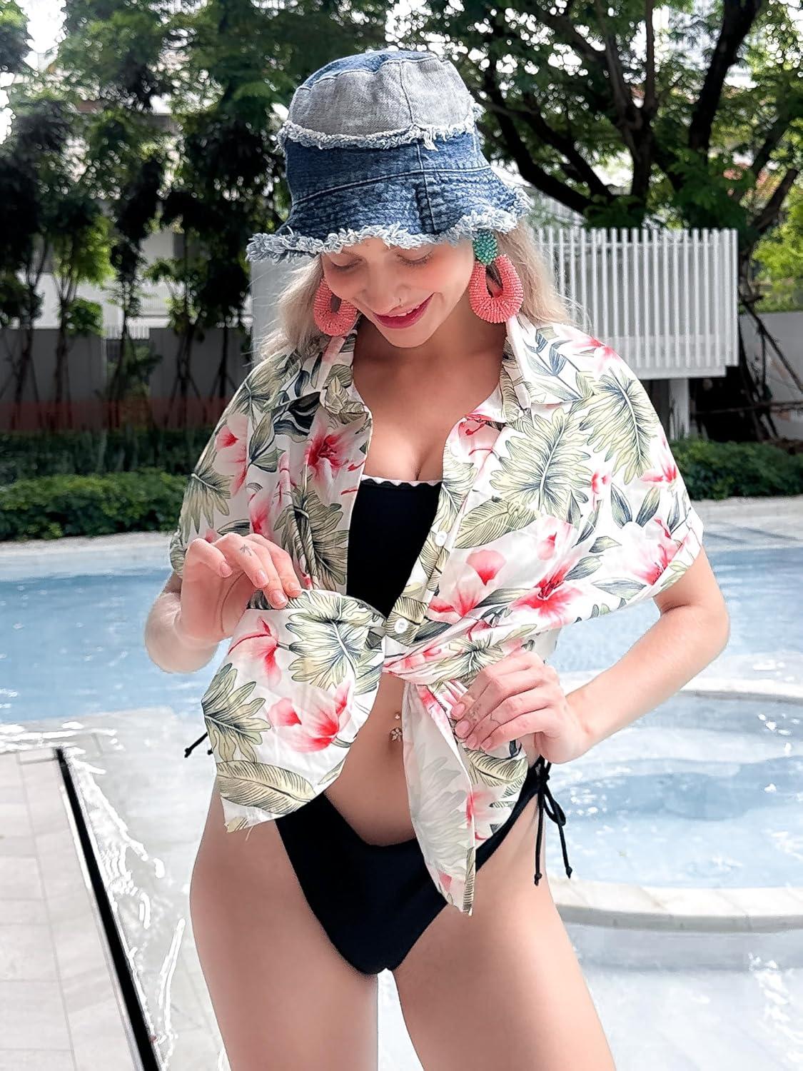 HOTOUCH Hawaiian Shirts for Women Summer Cool Hawaii Floral Tropic Print Blouses Beach Short Sleeve Button Up Tops(Cyan Hawaii)