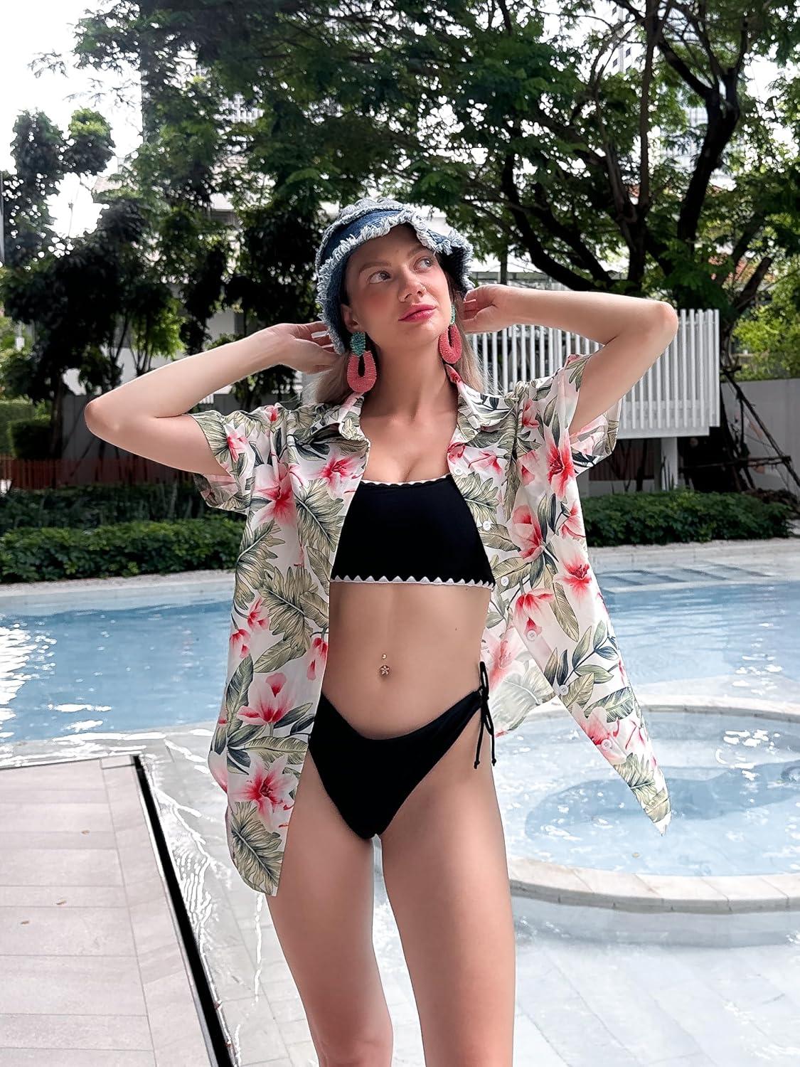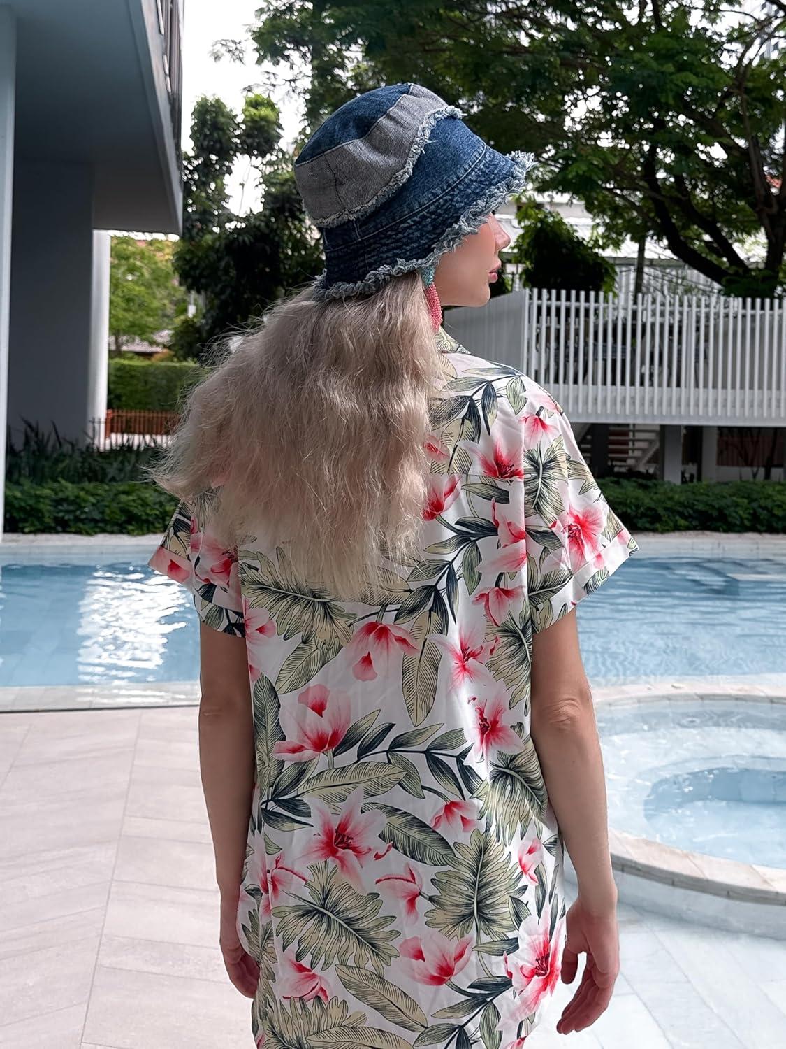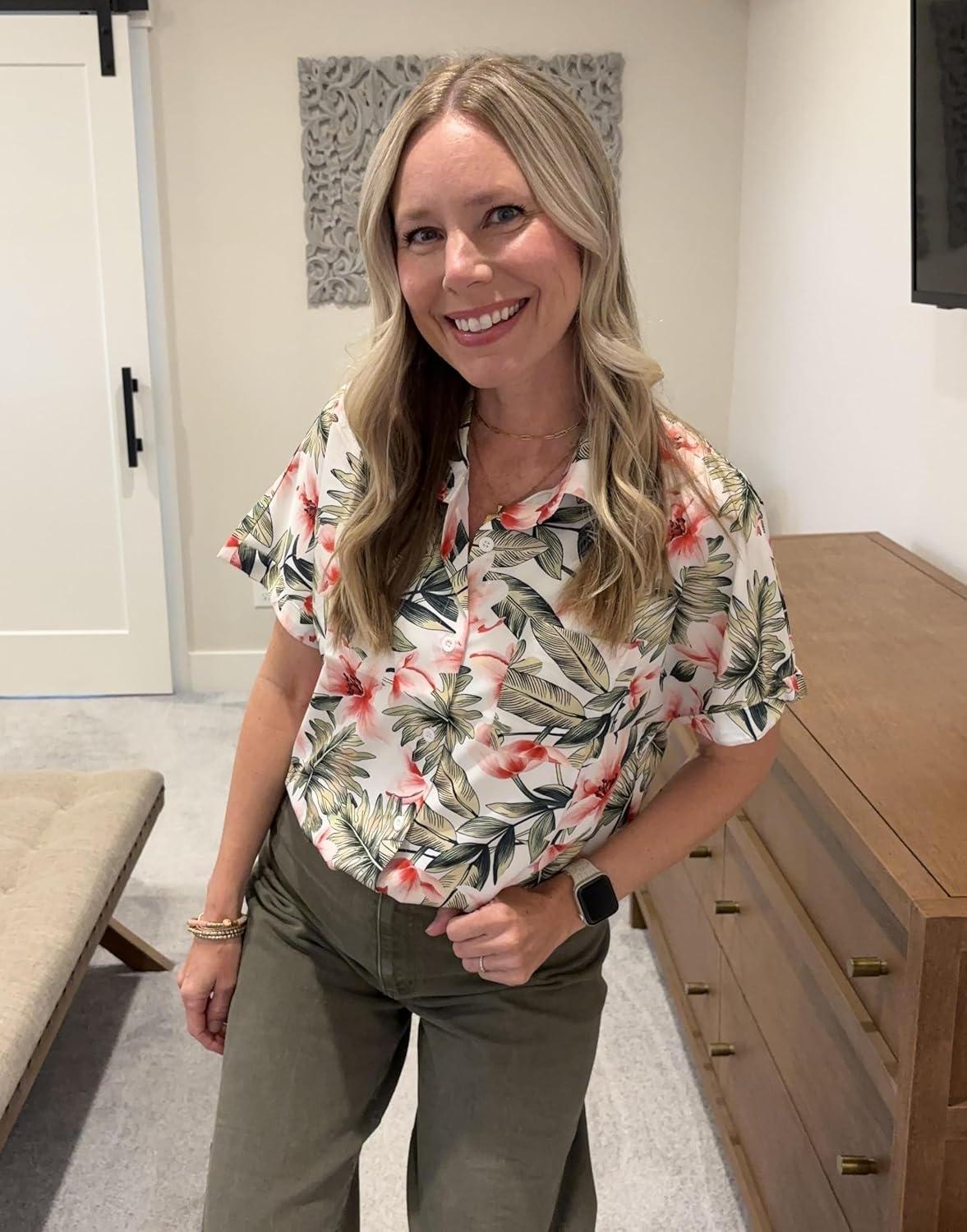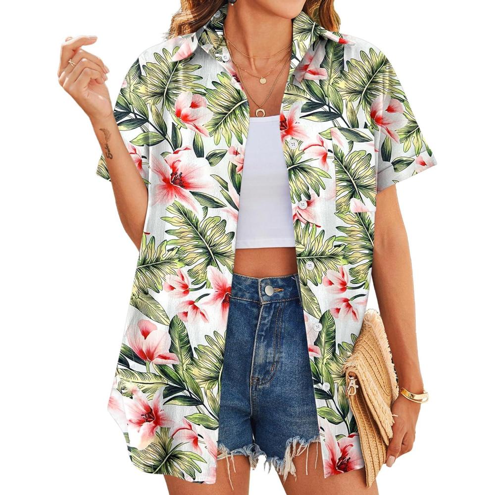 HOTOUCH Hawaiian Shirts for Women Summer Cool Hawaii Floral Tropic Print Blouses Beach Short Sleeve Button Up Tops(White Floral Tropical)