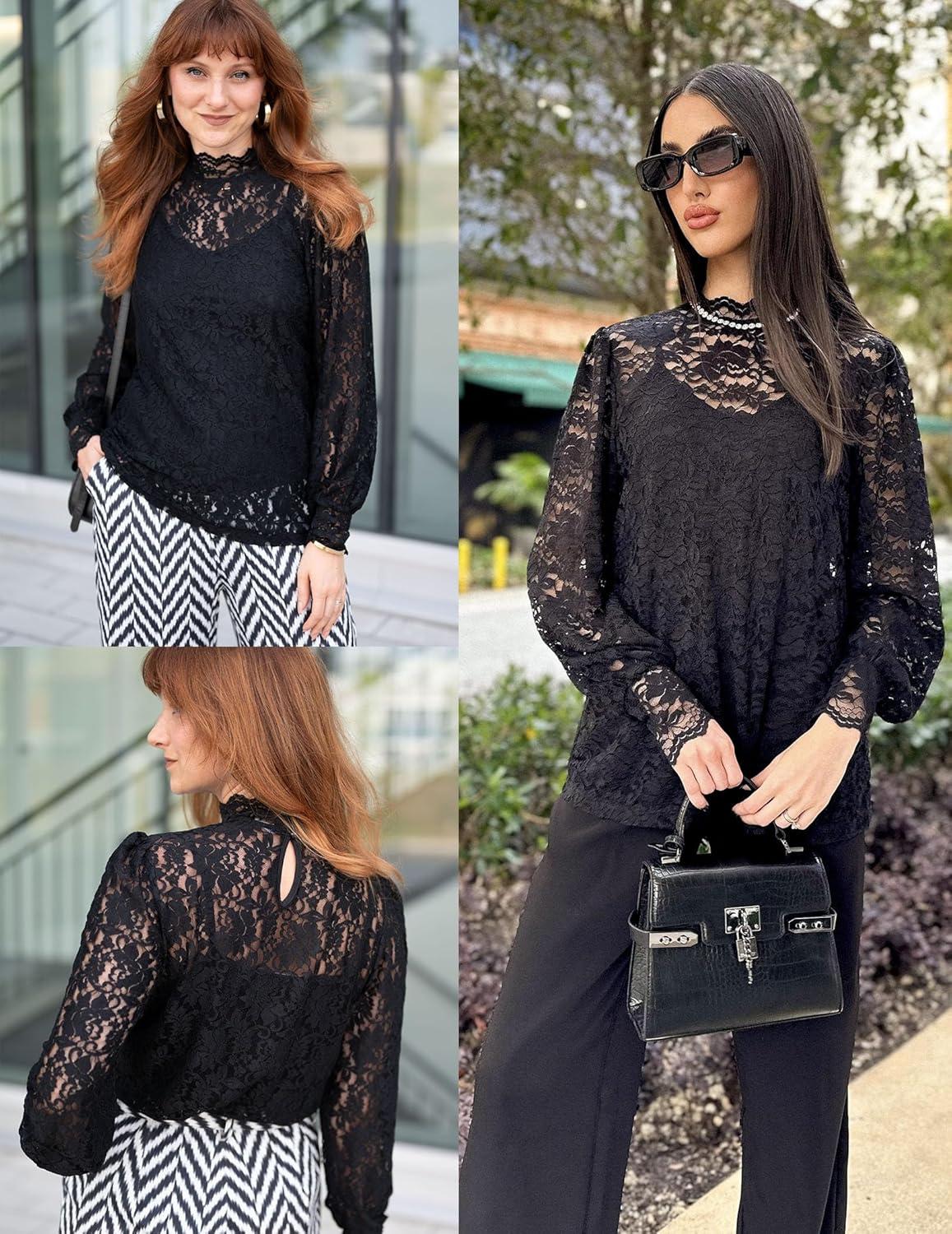 HOTOUCH Lace Tops for Women Sheer Long Sleeve Blouses Dressy Casual Shirt with Camisole 2 PCS Set S-XXL(Black)