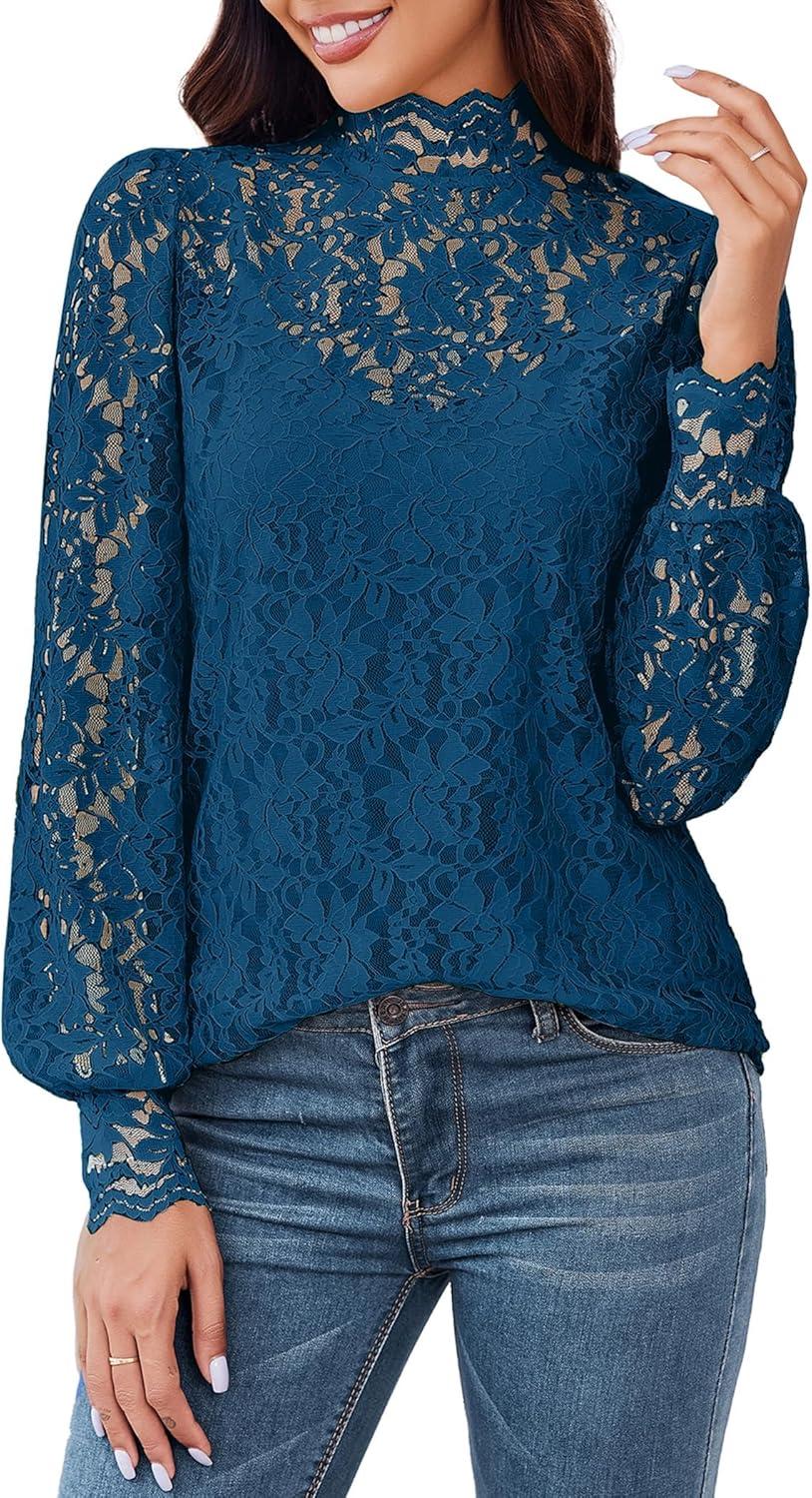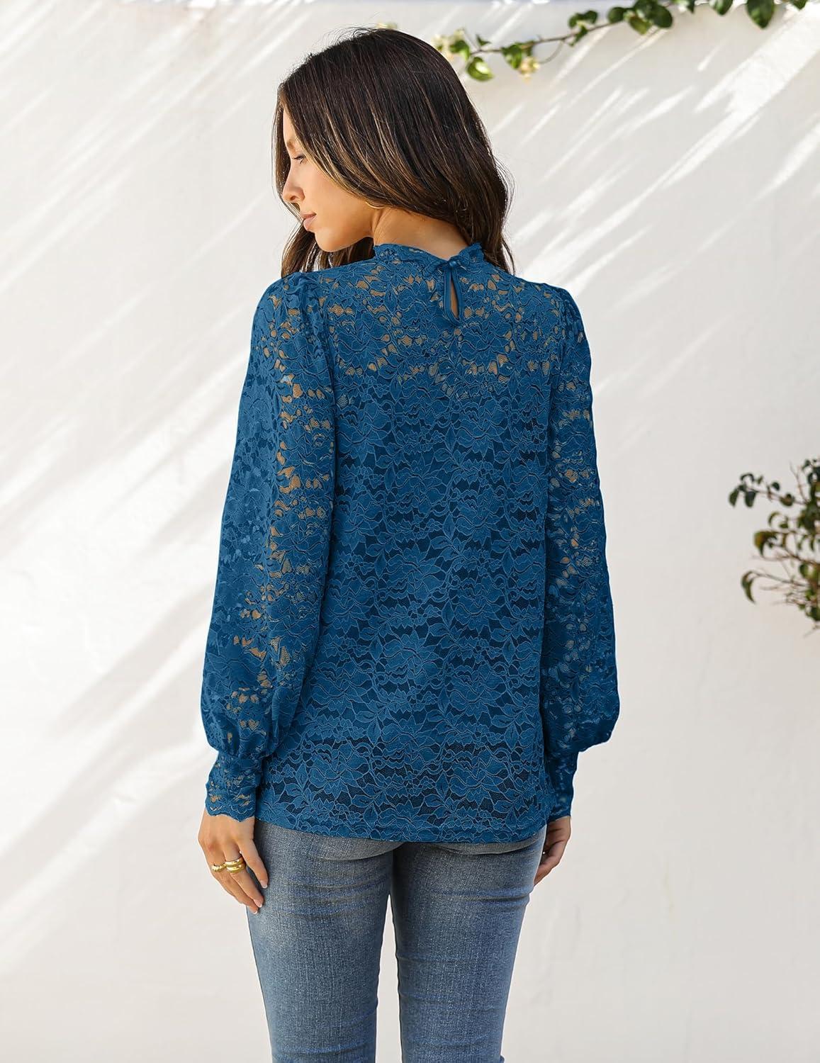 HOTOUCH Lace Tops for Women Sheer Long Sleeve Blouses Dressy Casual Shirt with Camisole 2 PCS Set S-XXL(Dusty Blue)