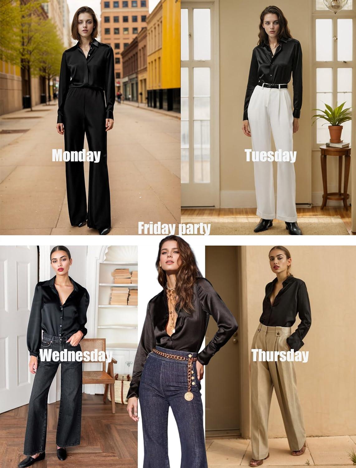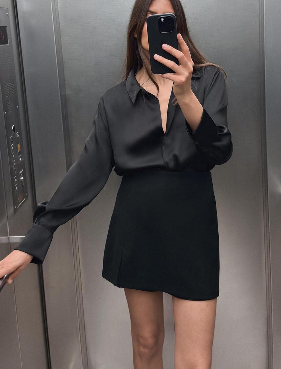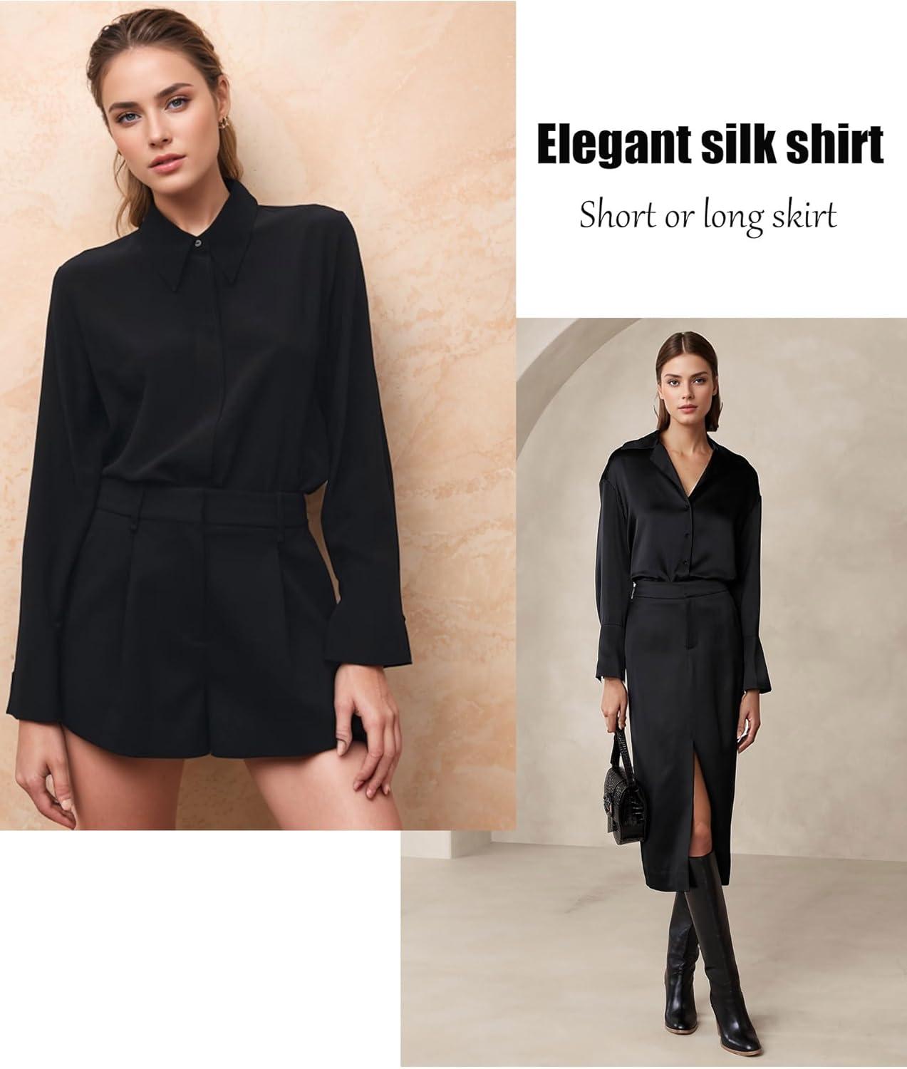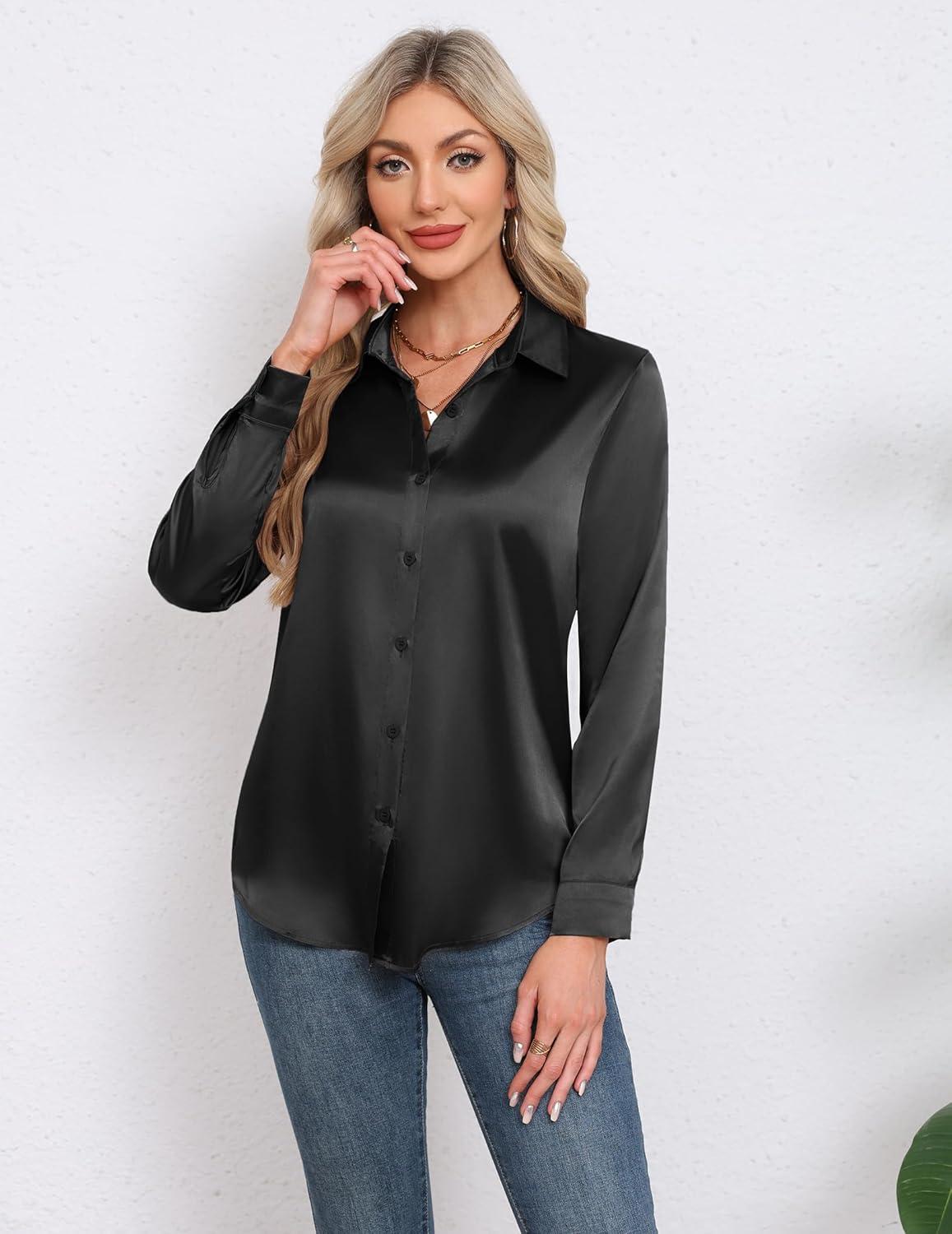 HOTOUCH Satin Shirts for Women Silk Button Down V Neck Dressy Casual Blouse Loose Long Sleeve Office Work Tunic Tops(Black)