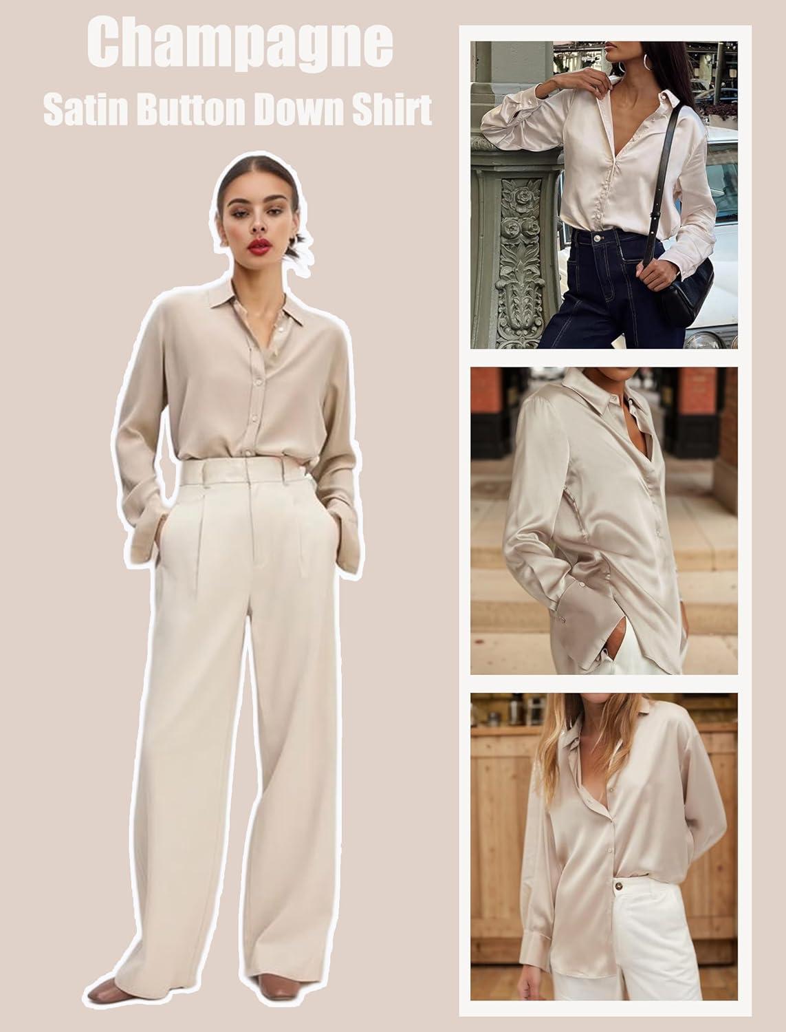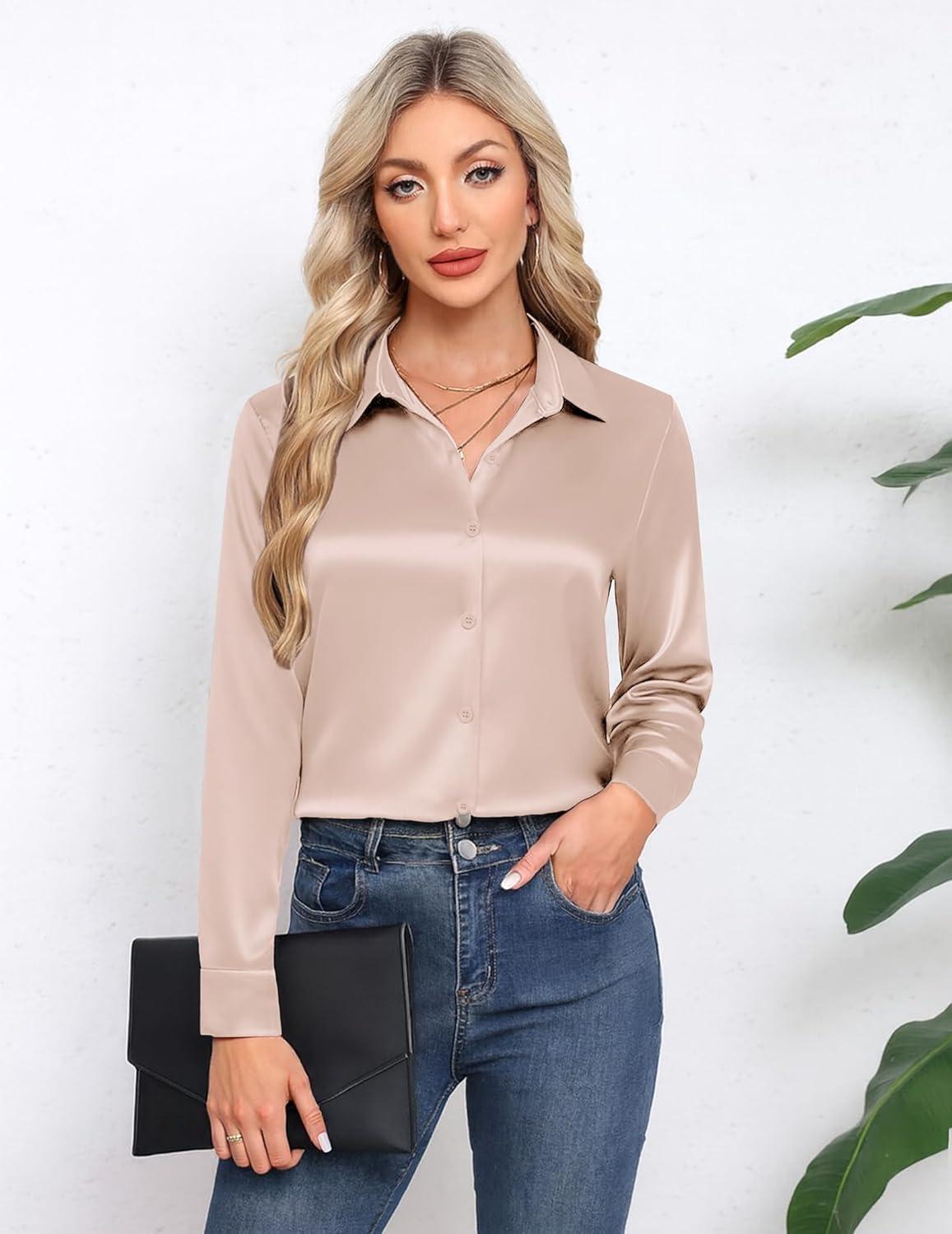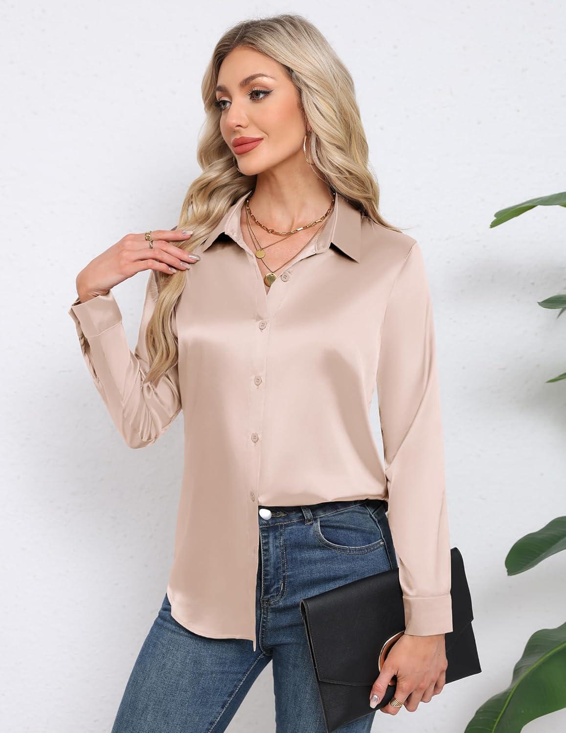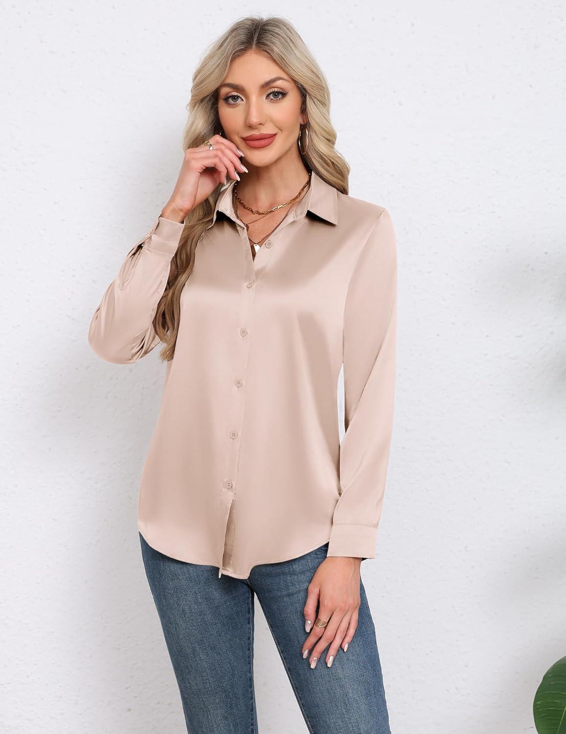 HOTOUCH Satin Shirts for Women Silk Button Down V Neck Dressy Casual Blouse Loose Long Sleeve Office Work Tunic Tops(Champagne)