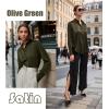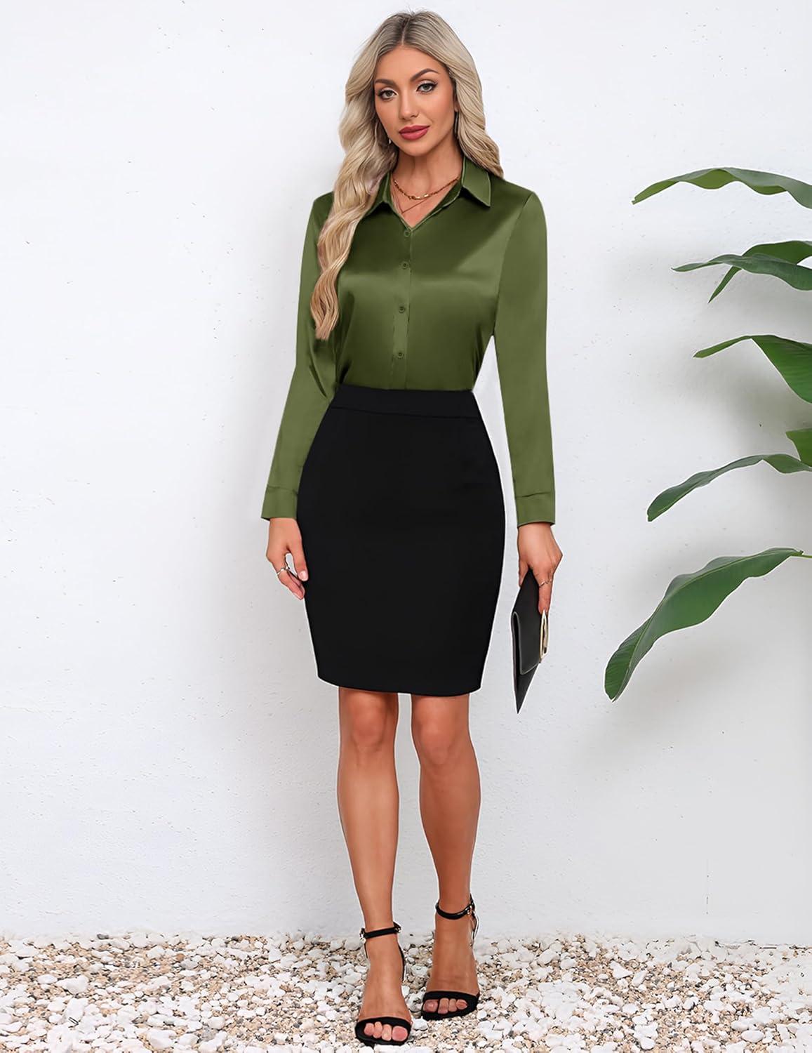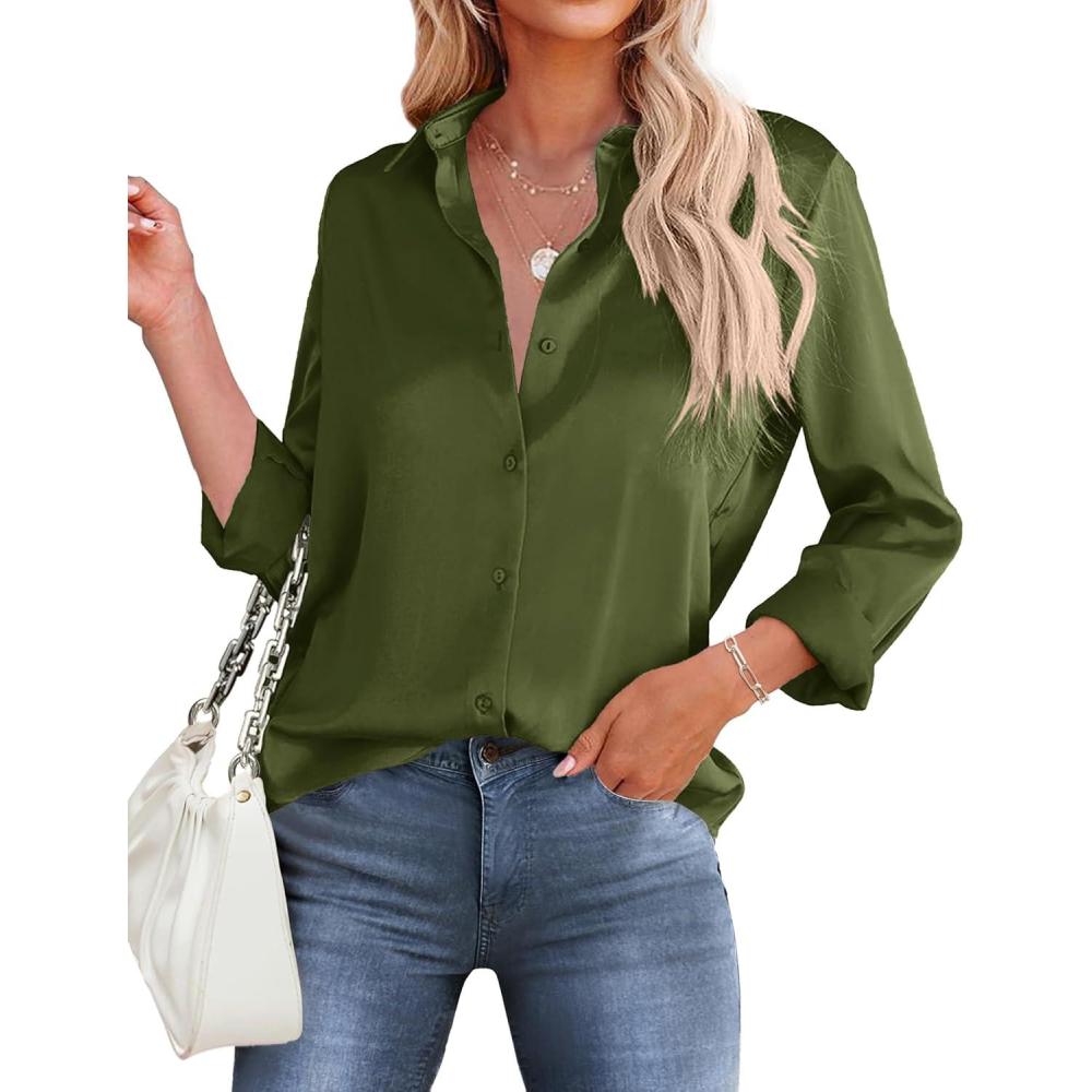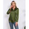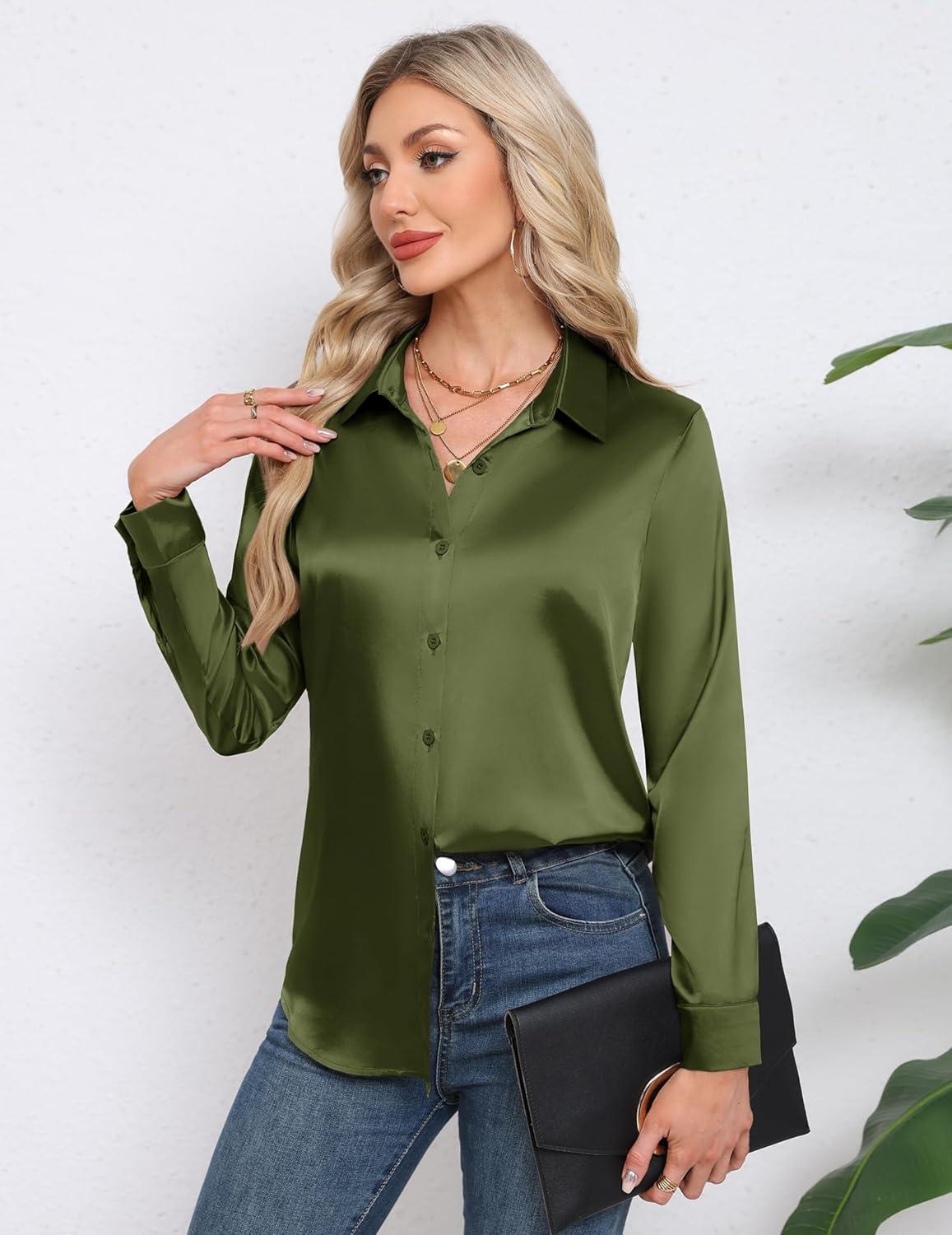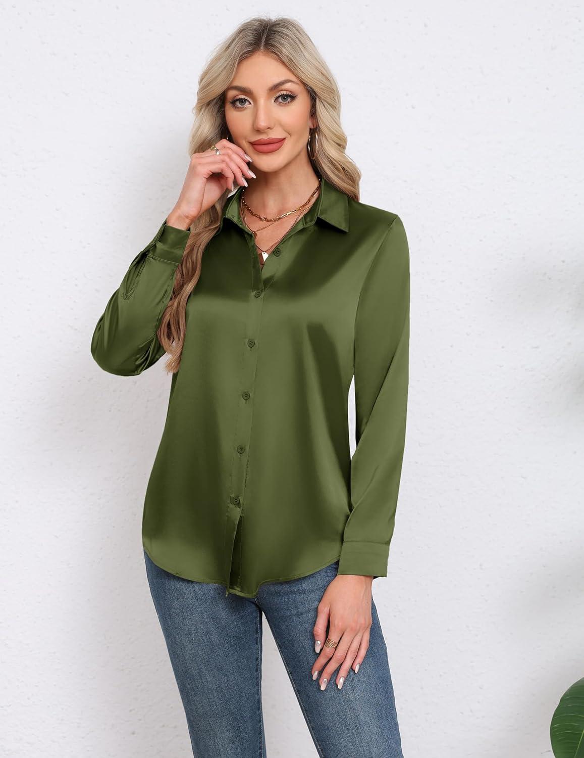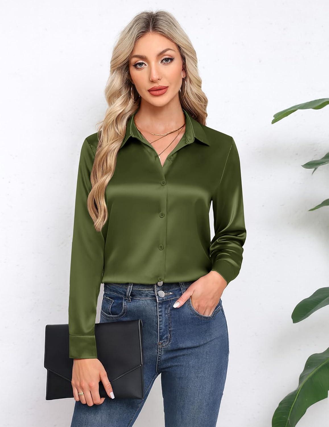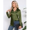 HOTOUCH Satin Shirts for Women Silk Button Down V Neck Dressy Casual Blouse Loose Long Sleeve Office Work Tunic Tops(Olive Green)