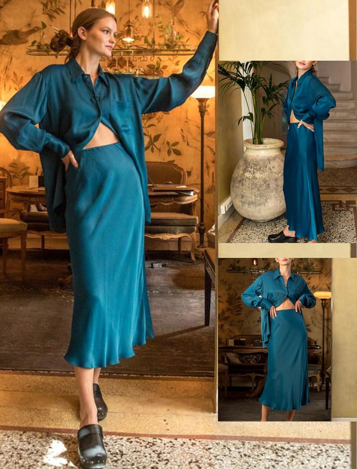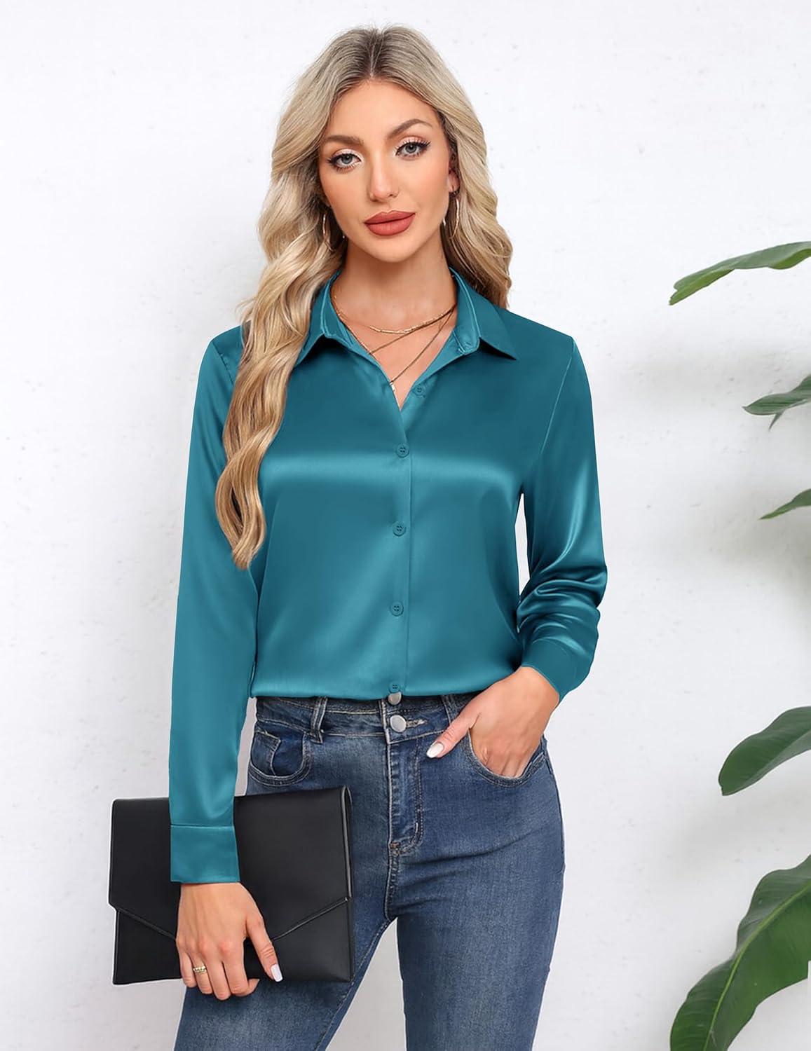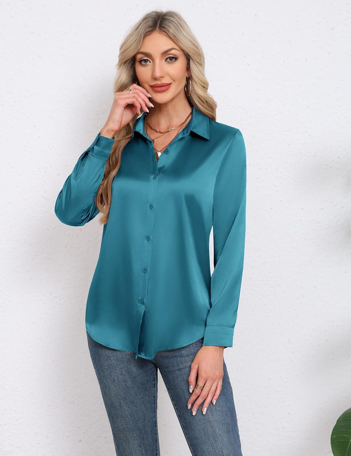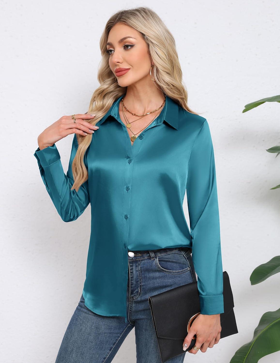 HOTOUCH Satin Shirts for Women Silk Button Down V Neck Dressy Casual Blouse Loose Long Sleeve Office Work Tunic Tops(Peacock Blue)