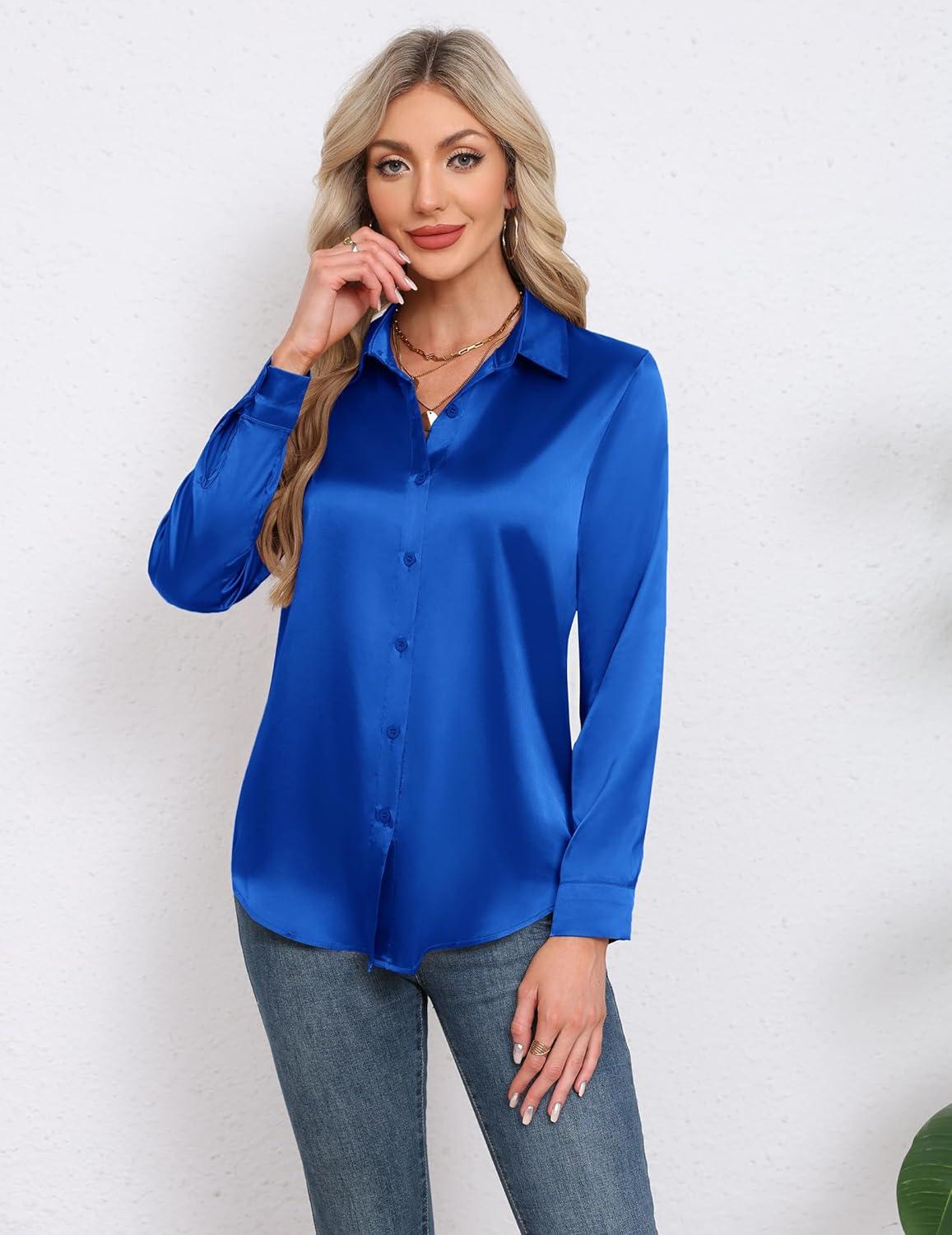 HOTOUCH Satin Shirts for Women Silk Button Down V Neck Dressy Casual Blouse Loose Long Sleeve Office Work Tunic Tops(Royal Blue)
