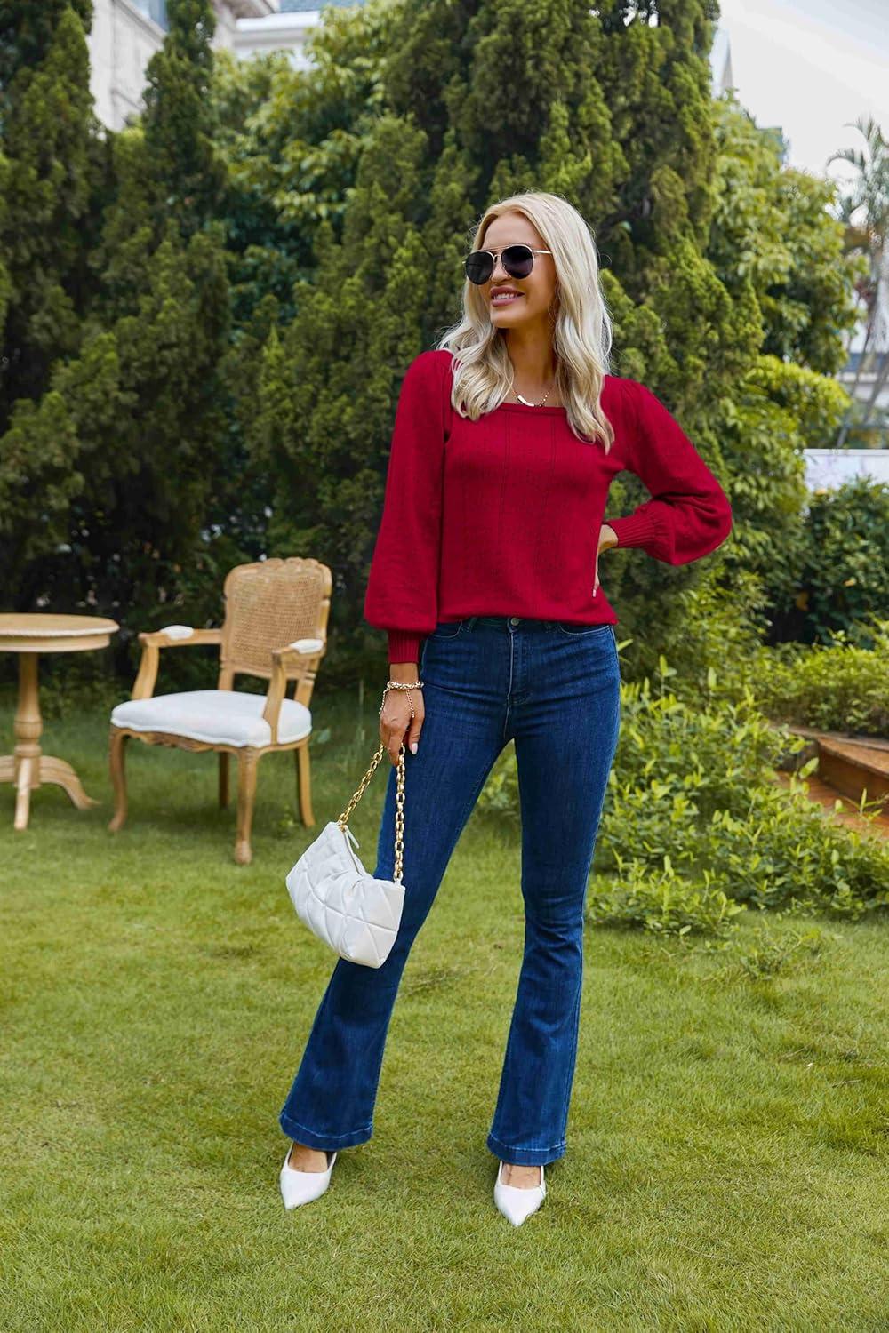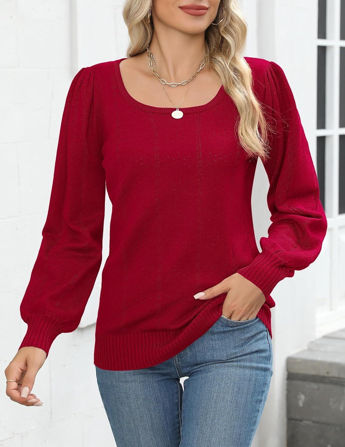 HOTOUCH Sweaters for Women 2025 Fall Trendy Tops Casual Puff Sleeve Square Neck Cute Tunic Pullover Blouses XS-XXL(02-dark Red)