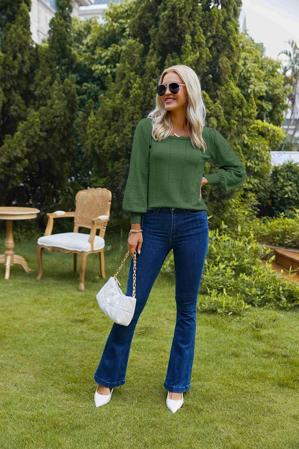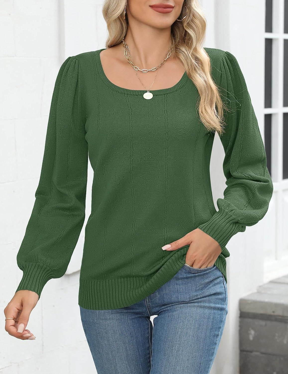 HOTOUCH Sweaters for Women 2025 Fall Trendy Tops Casual Puff Sleeve Square Neck Cute Tunic Pullover Blouses XS-XXL(Army Green)
