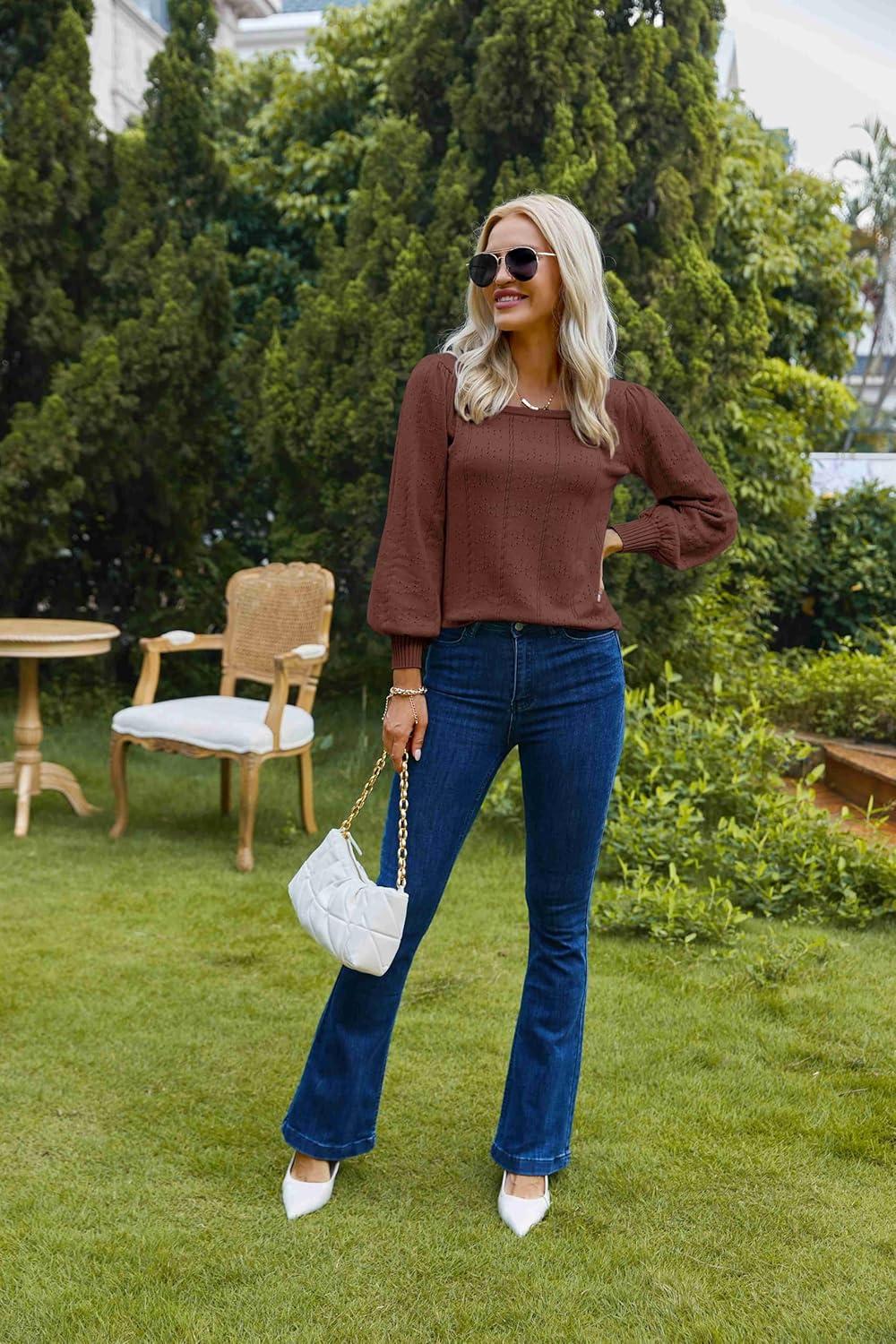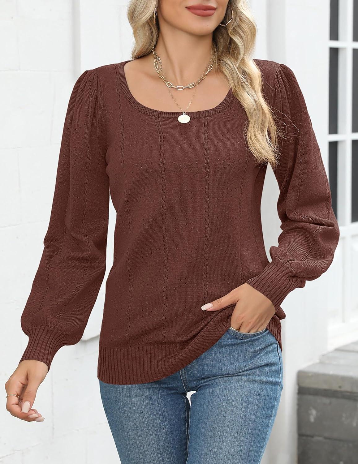 HOTOUCH Sweaters for Women 2025 Fall Trendy Tops Casual Puff Sleeve Square Neck Cute Tunic Pullover Blouses XS-XXL(Brown)