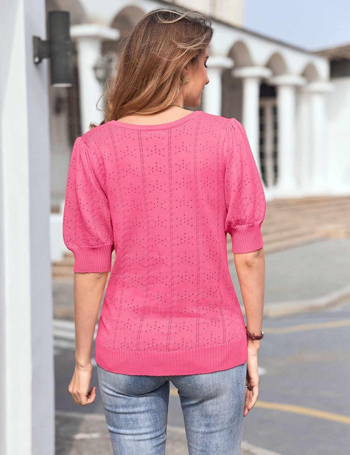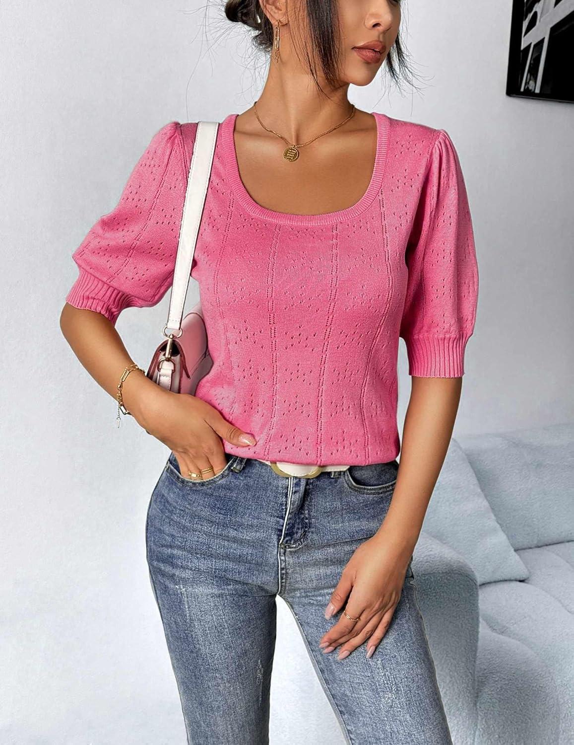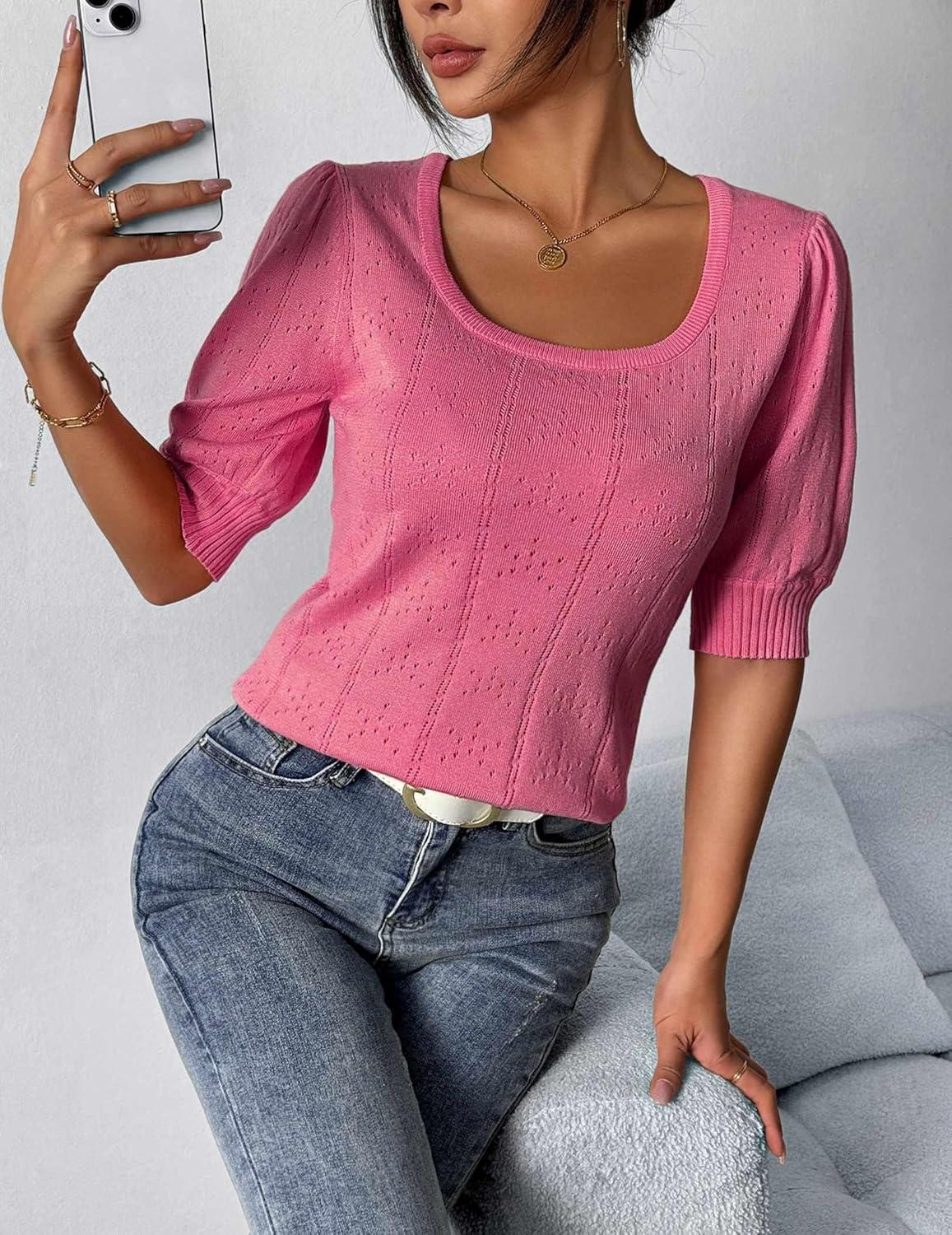 HOTOUCH Sweaters for Women 2025 Fall Trendy Tops Casual Puff Sleeve Square Neck Cute Tunic Pullover Blouses XS-XXL(Watermelon Red)