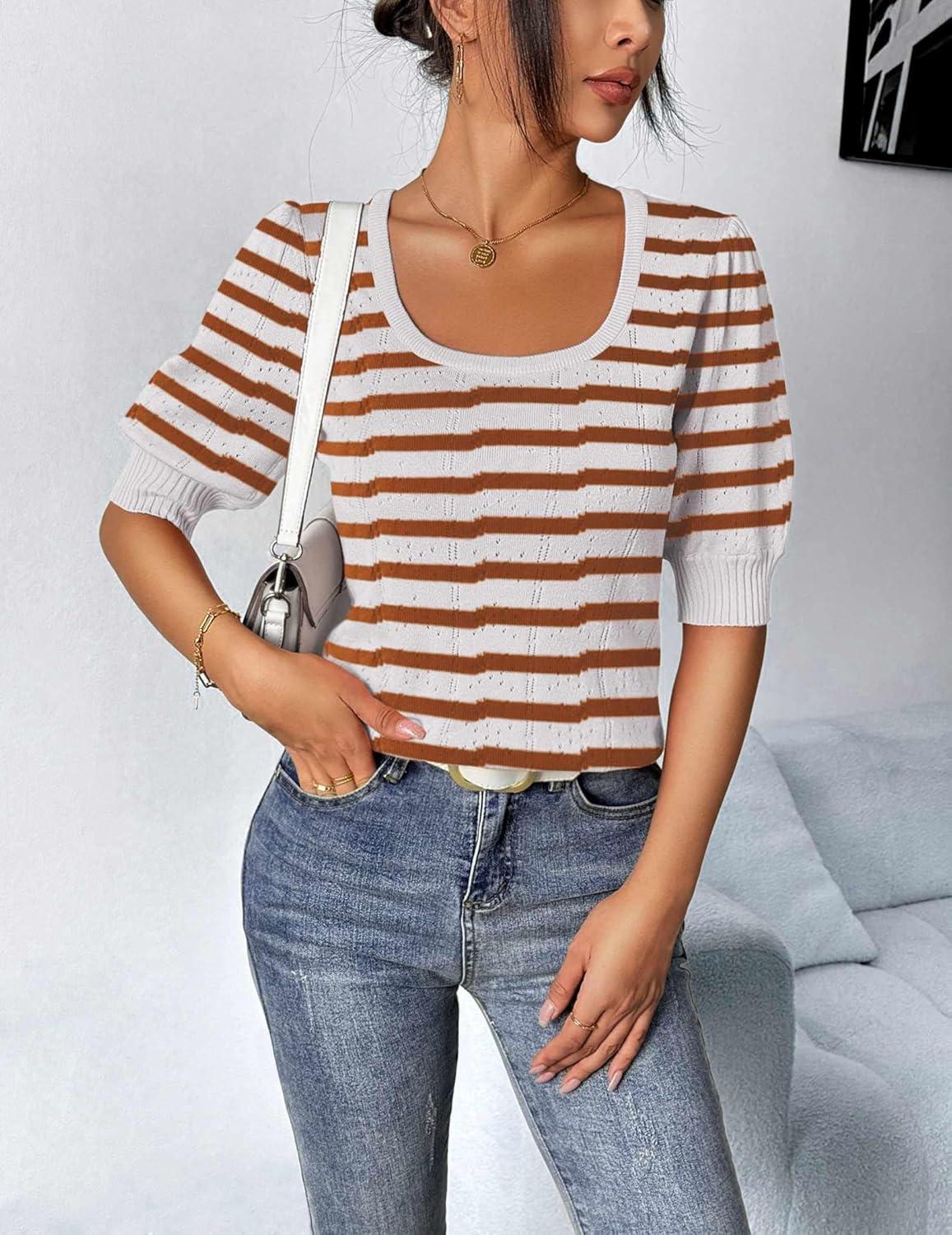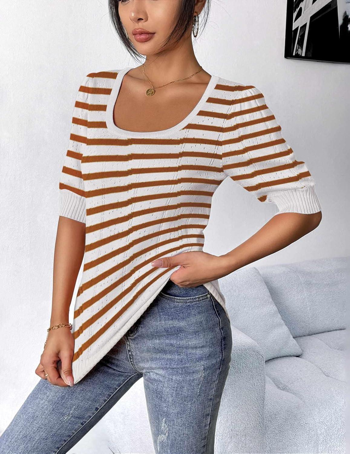 HOTOUCH Sweaters for Women 2025 Fall Trendy Tops Casual Puff Sleeve Square Neck Cute Tunic Pullover Blouses XS-XXL(White Coffee Stripe)