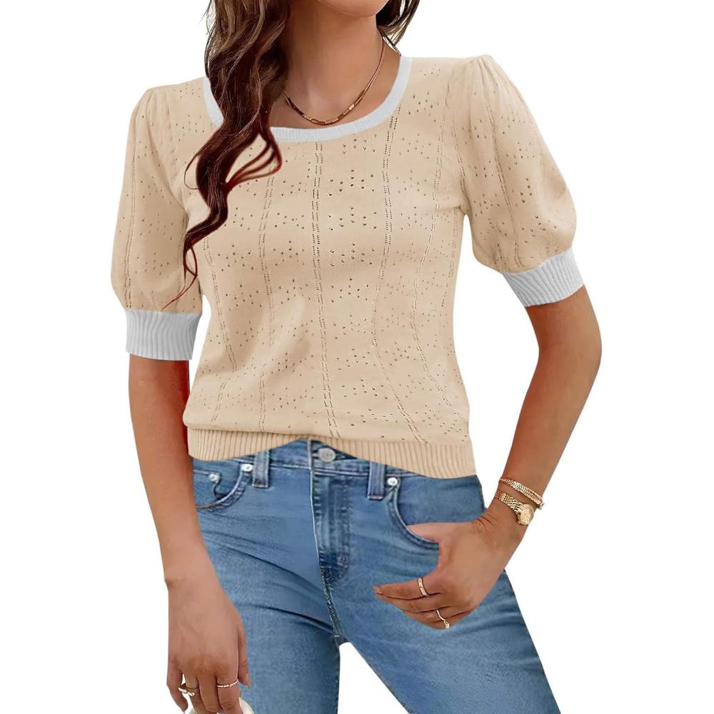 Hotouch Sweaters for Women 2026 Fall Trendy Tops Casual Puff Sleeve Square Neck Cute Tunic Pullover Blouses XS-XXL(Beige White Colorblock)