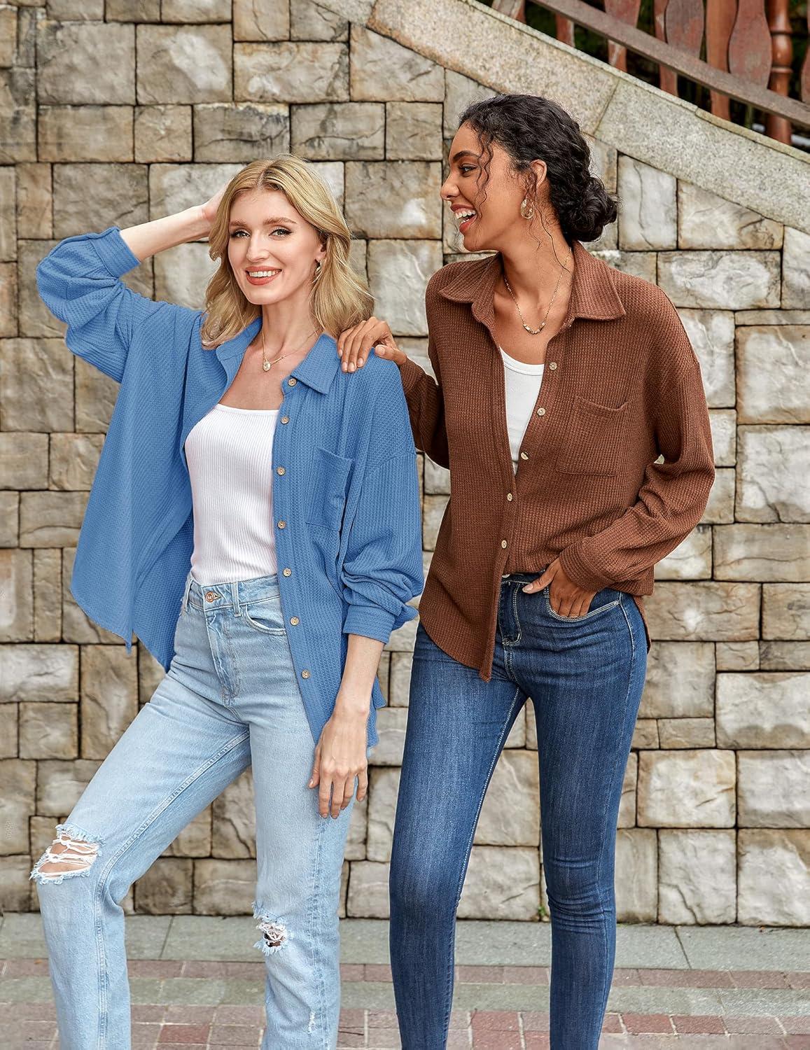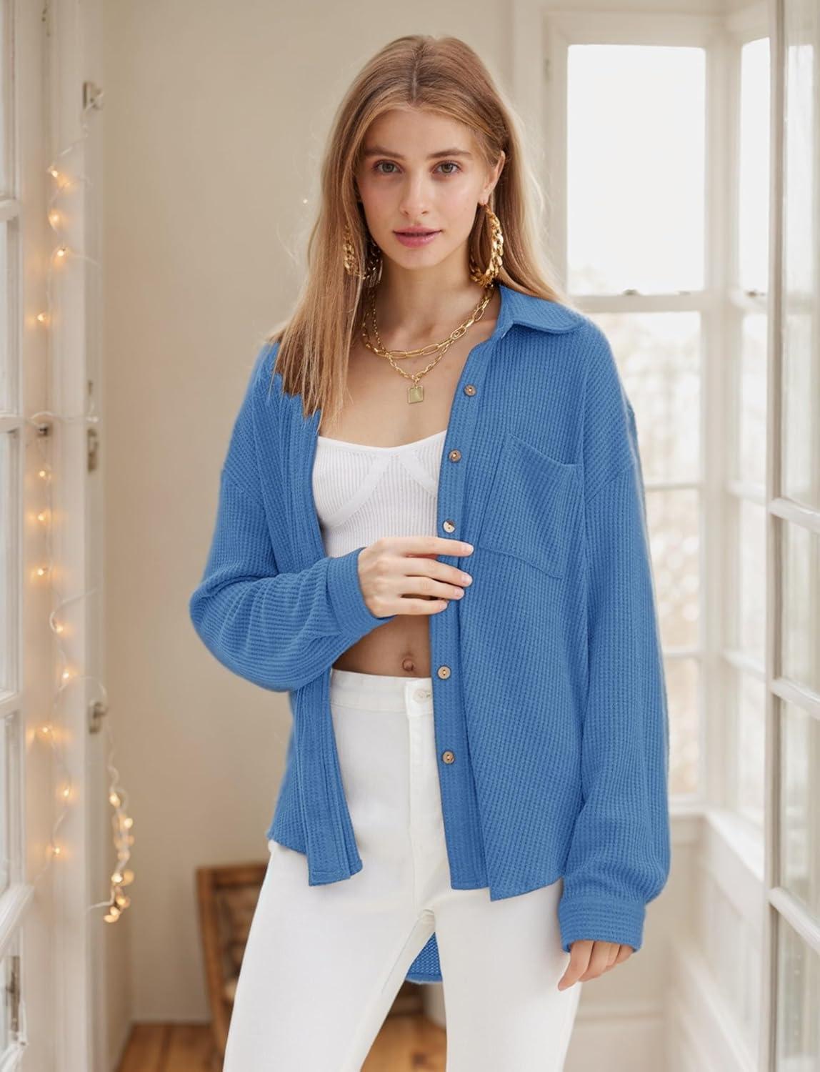 HOTOUCH Waffle Button Down Shirts for Women Dressy Casual Work Shacket V Neck Long Sleeve Lightweight Tops with Pocket(Clear Blue)