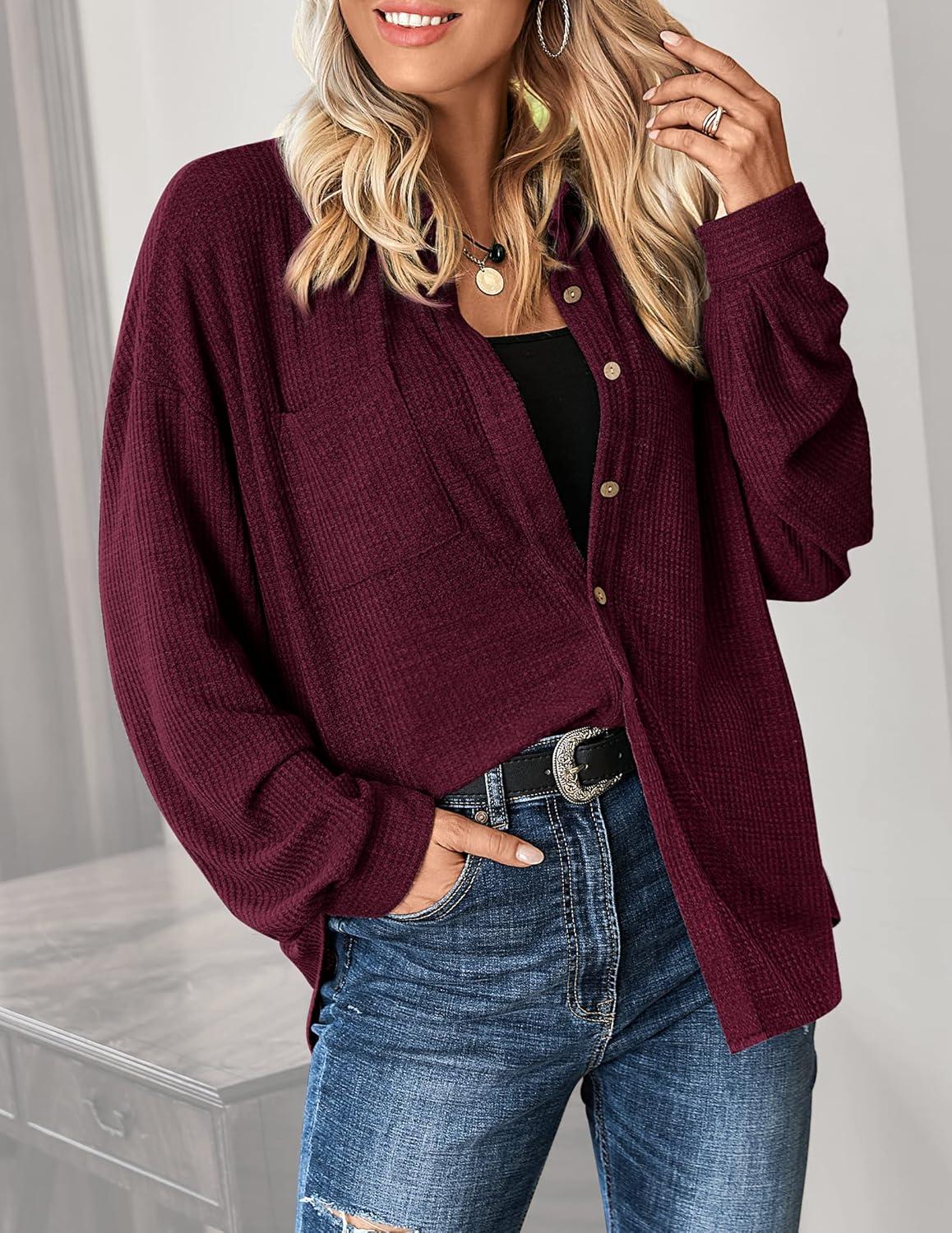 HOTOUCH Waffle Button Down Shirts for Women Dressy Casual Work Shacket V Neck Long Sleeve Lightweight Tops with Pocket(Wine Red)