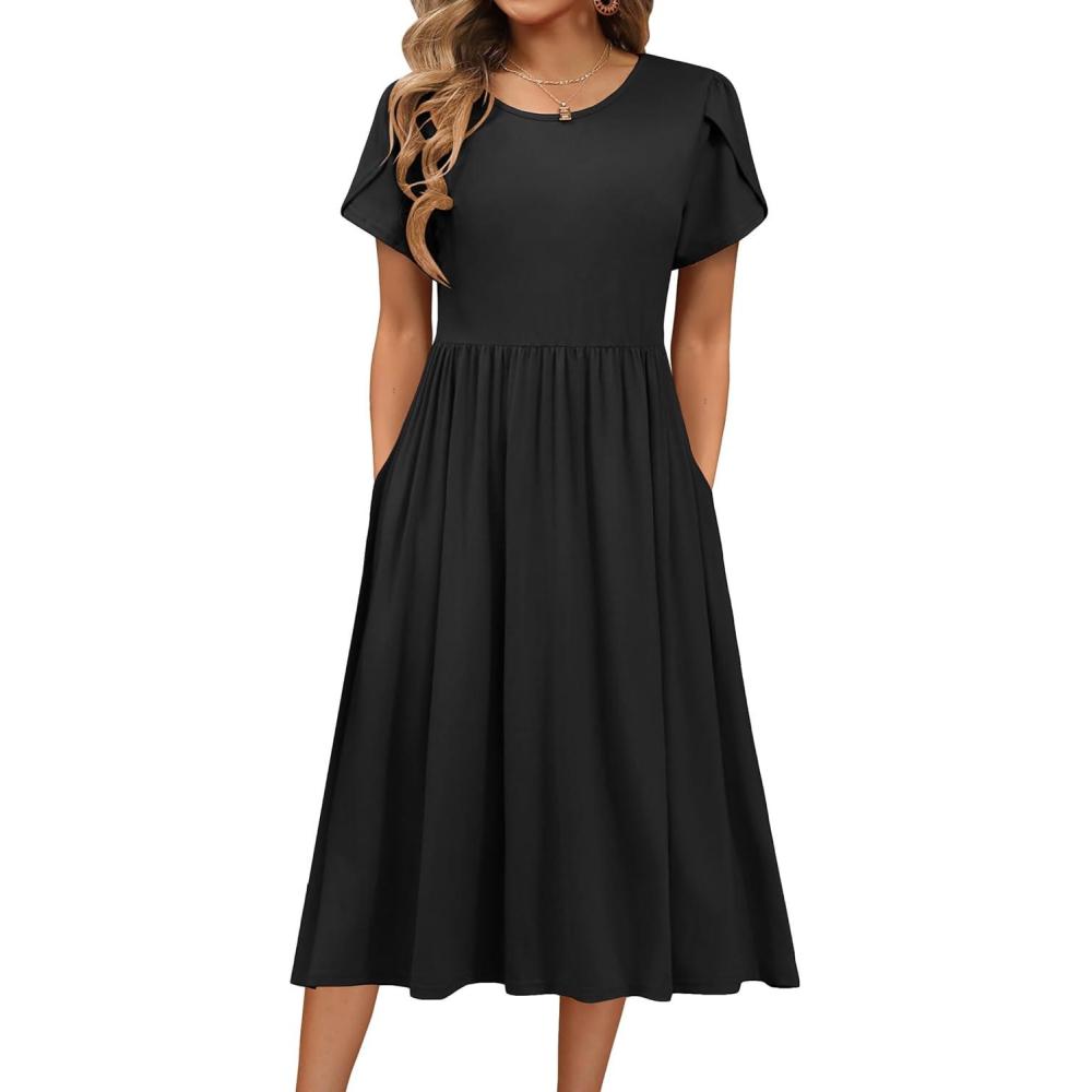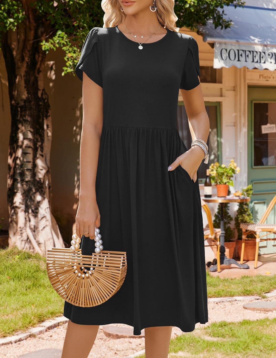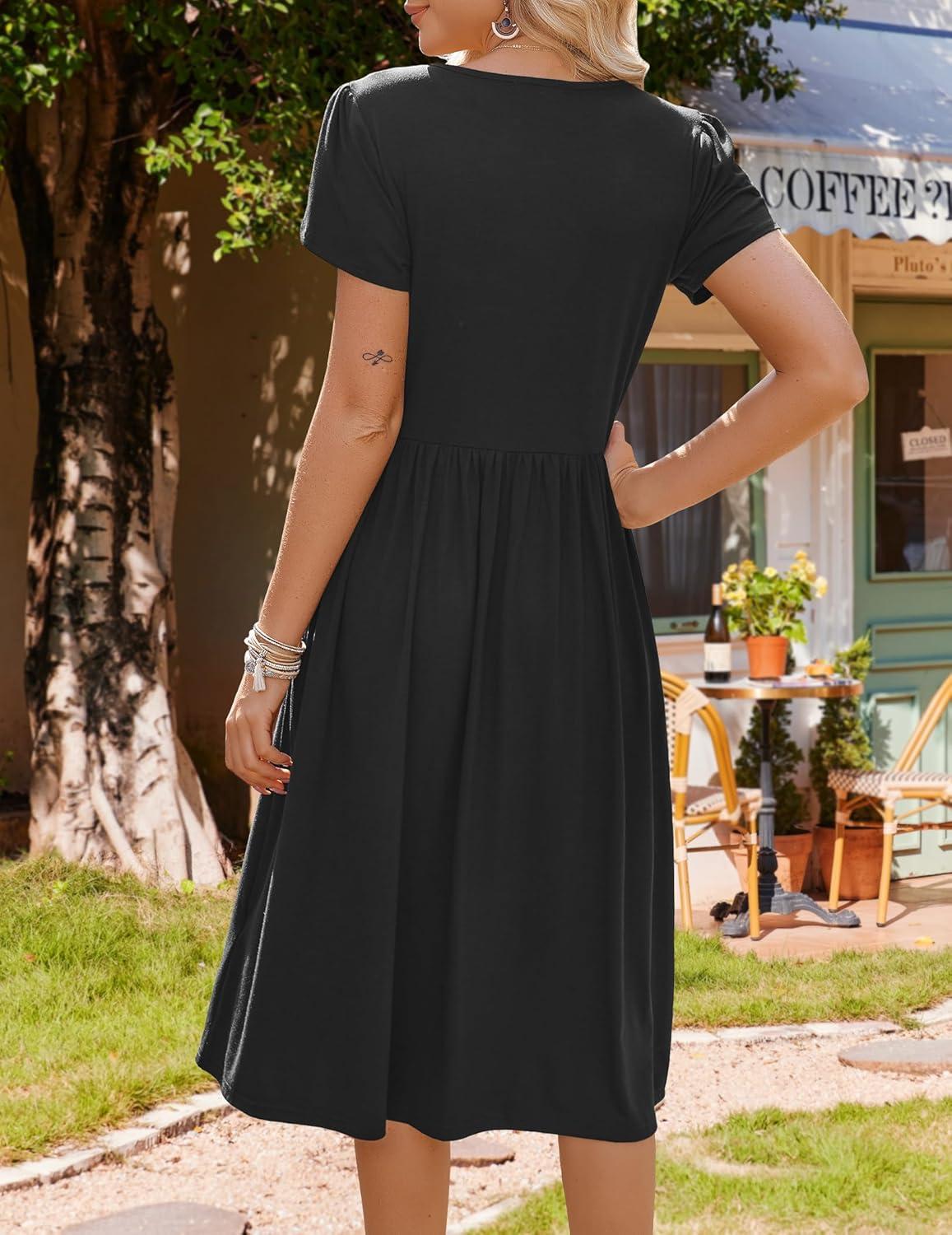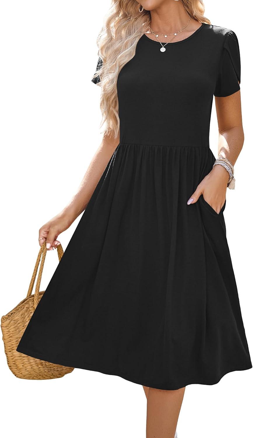HOTOUCH Women Dress 2025 Short Sleeve Floral Midi Loose Tshirt Dresses Aline Flowy Swing Beach Sundress with Pockets(Black)
