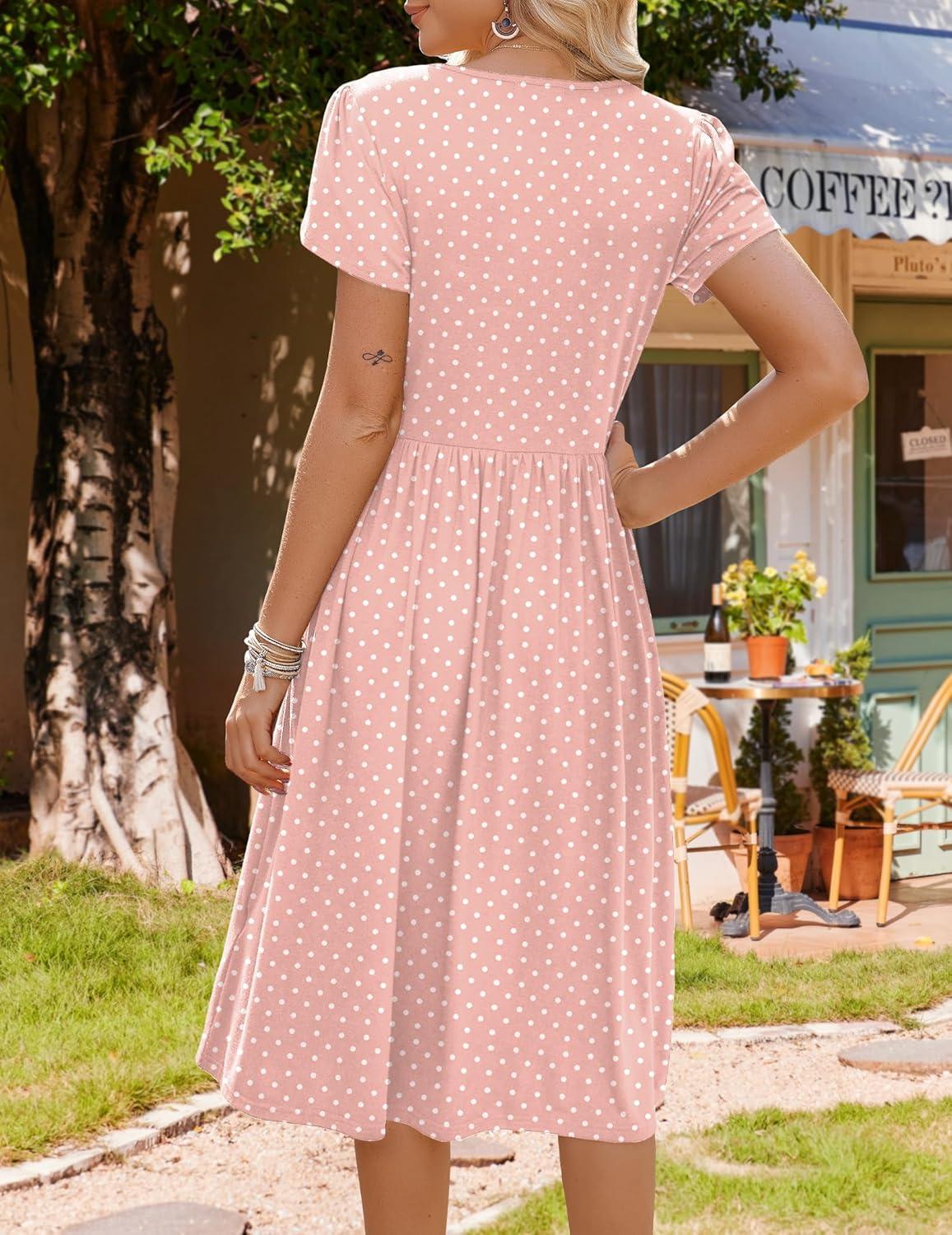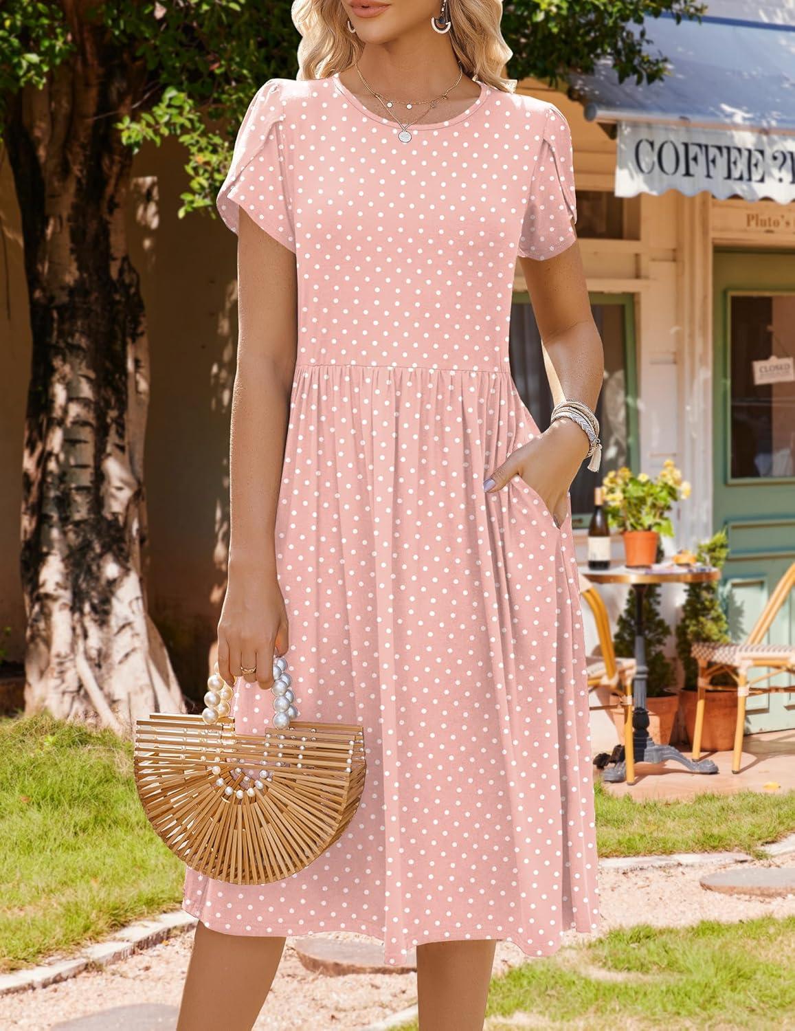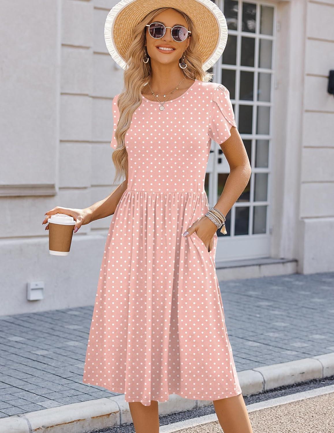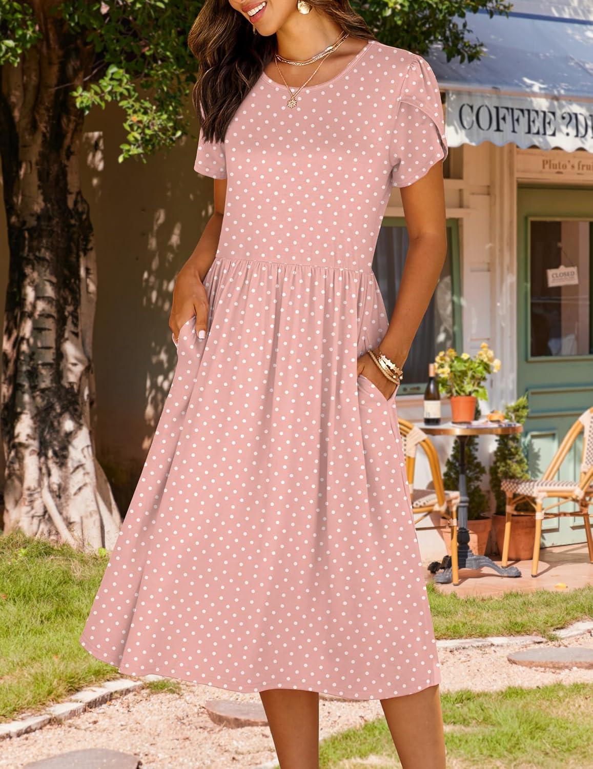HOTOUCH Women Dress 2025 Short Sleeve Floral Midi Loose Tshirt Dresses Aline Flowy Swing Beach Sundress with Pockets(Pink Round Dot)