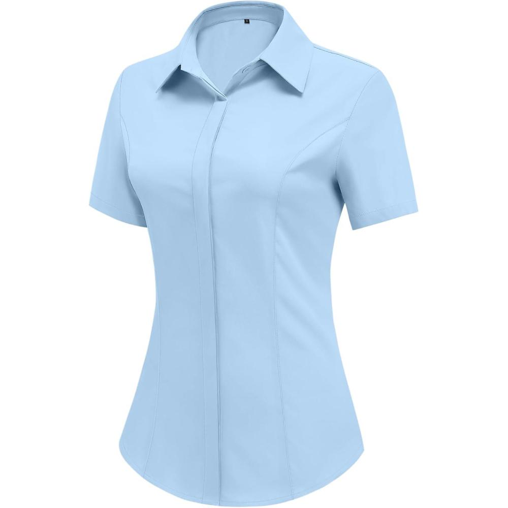 HOTOUCH Women Short Sleeve Button Down Shirts Business Work Fitted Collared Blouse Office Basic Summer Tops S-2XL(Light Blue)
