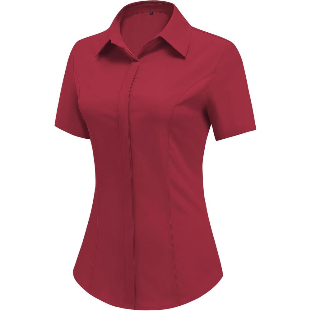 HOTOUCH Women Short Sleeve Button Down Shirts Business Work Fitted Collared Blouse Office Basic Summer Tops S-2XL(Wine Red)