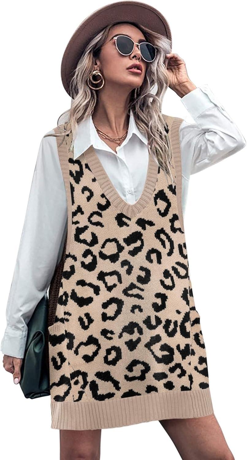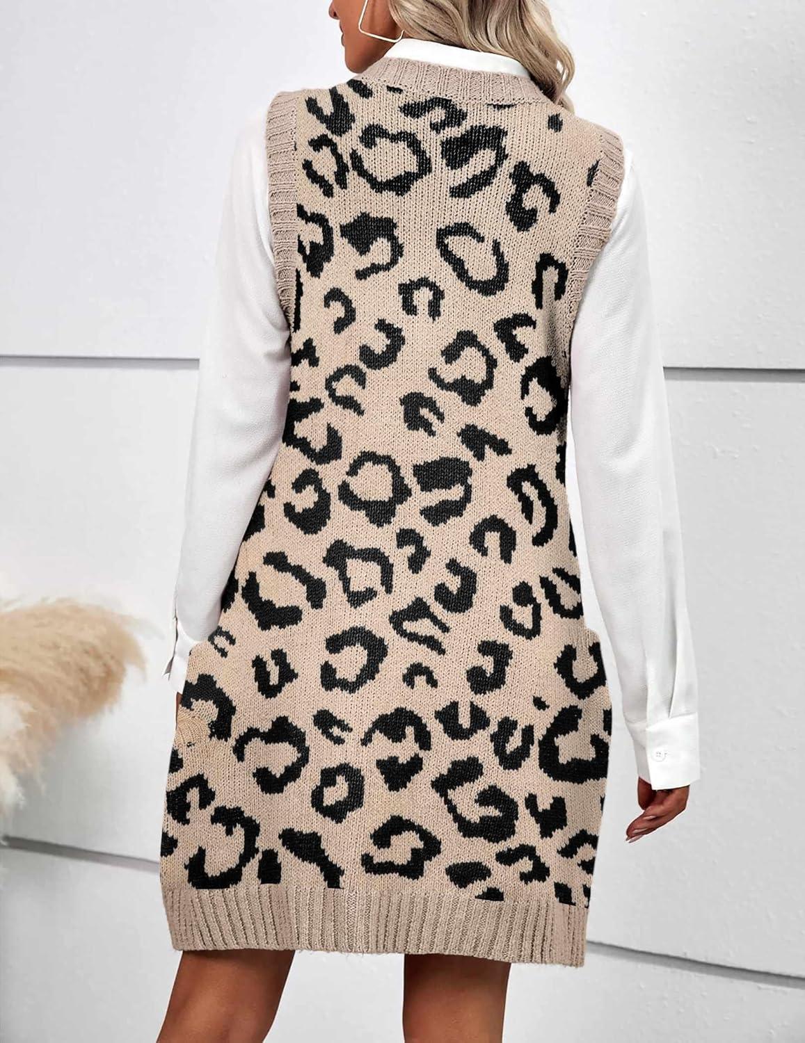 HOTOUCH Women Sweater Vest Oversized V Neck Sleeveless Knit Pullover Ribbed Vest Dress with Pockets(Cheetah Print)