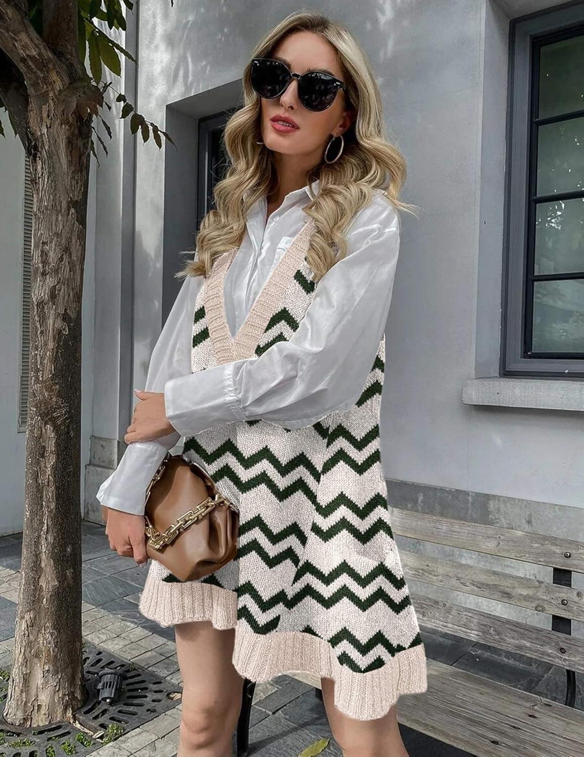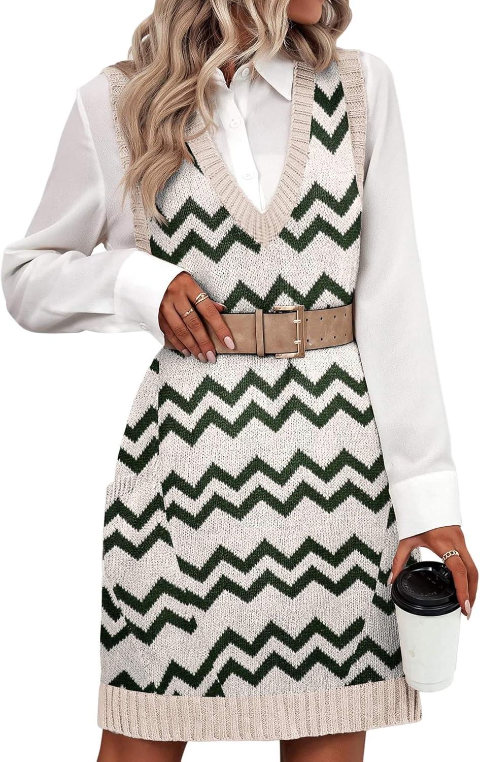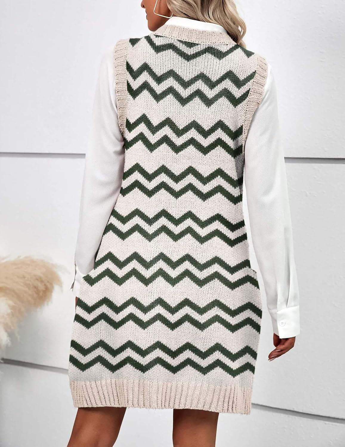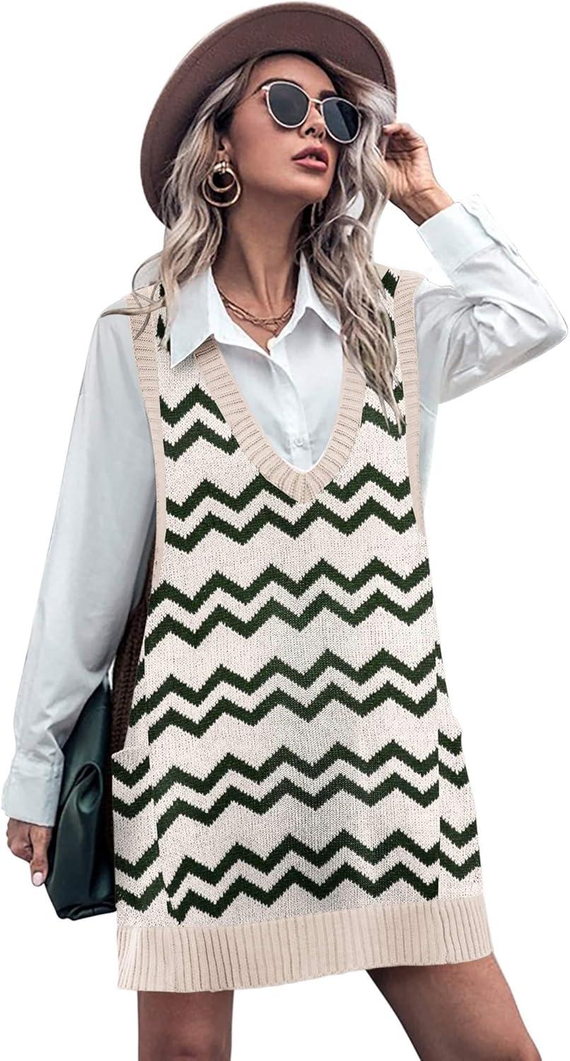 HOTOUCH Women Sweater Vest Oversized V Neck Sleeveless Knit Pullover Ribbed Vest Dress with Pockets(Green Stripe)