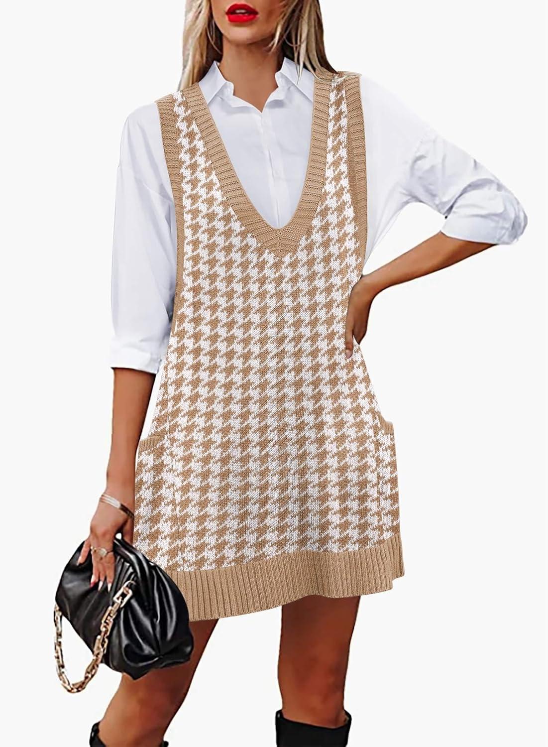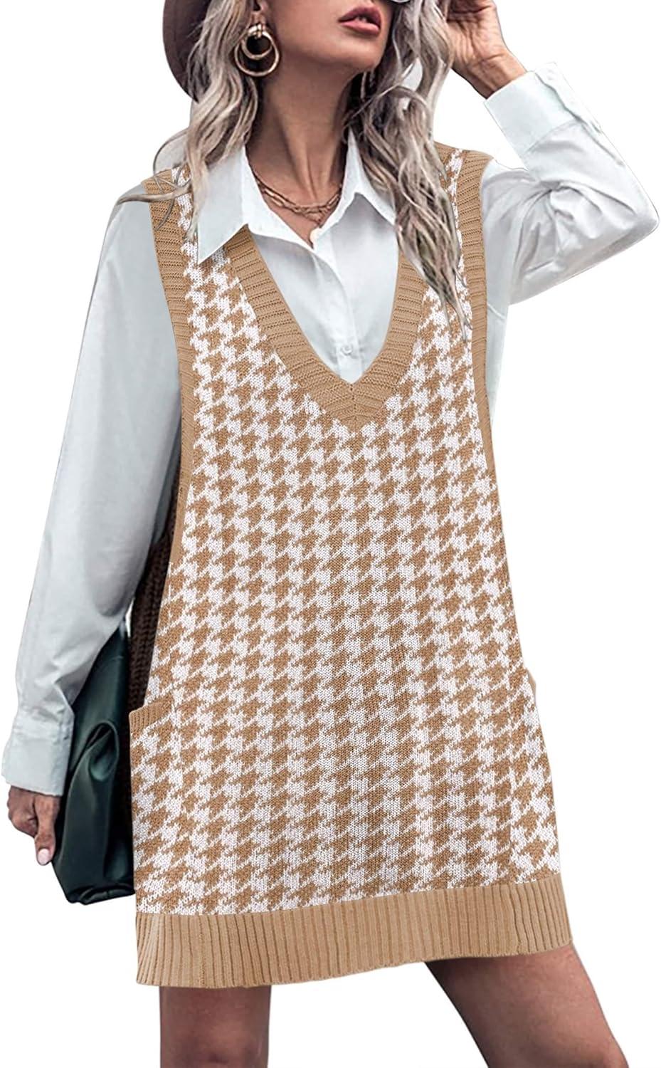 HOTOUCH Women Sweater Vest Oversized V Neck Sleeveless Knit Pullover Ribbed Vest Dress with Pockets(Houndstooth 01)