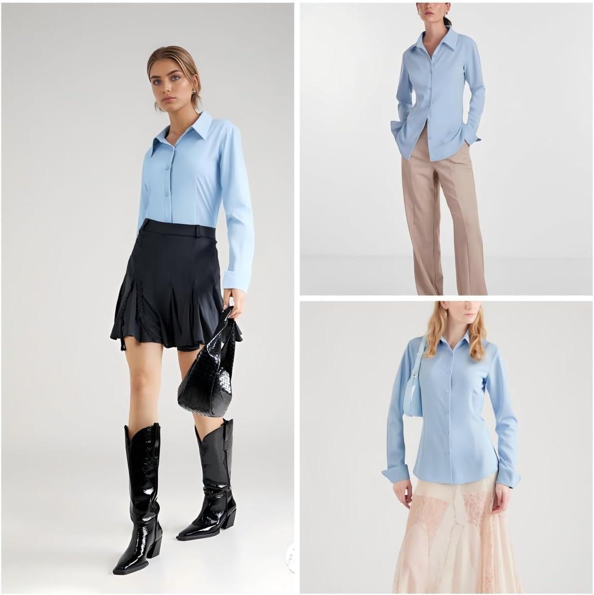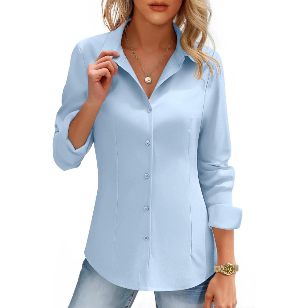 HOTOUCH Women's Button Down Shirts Long Sleeve Dress Shirt Slim Fitted Work Tops Collared Dressy Casual Business Blouses(Light Blue)