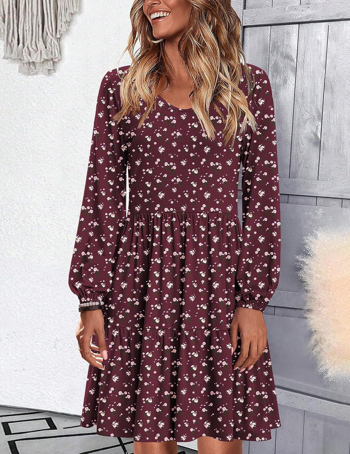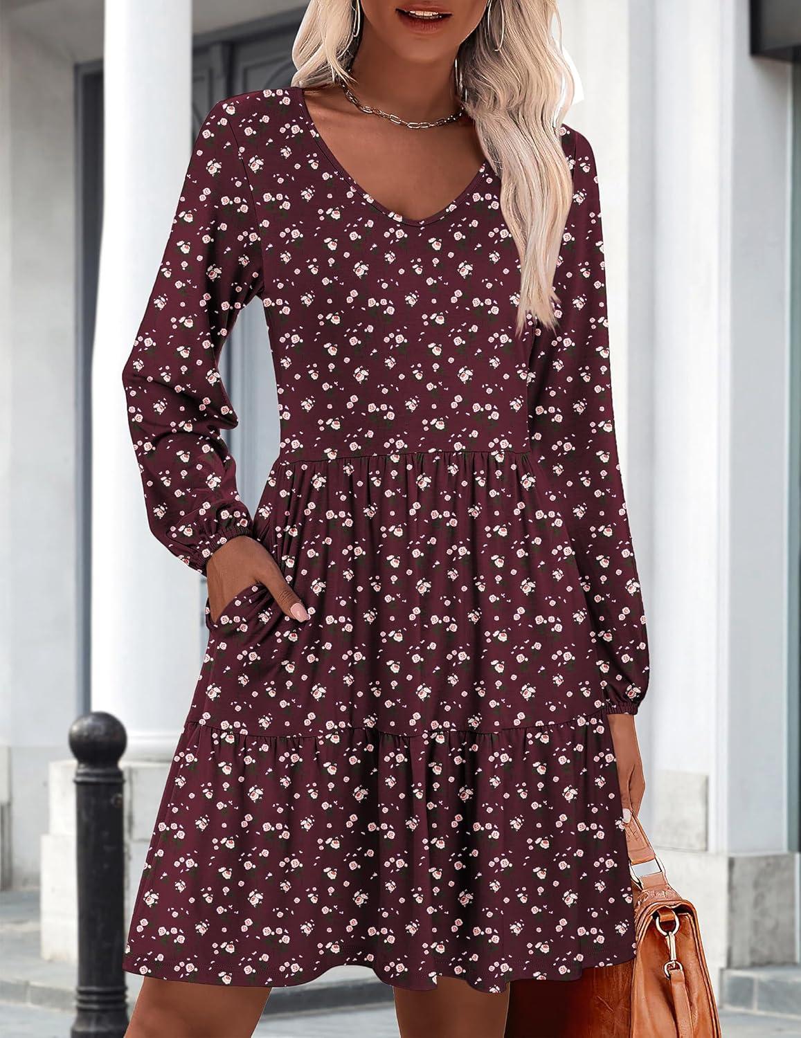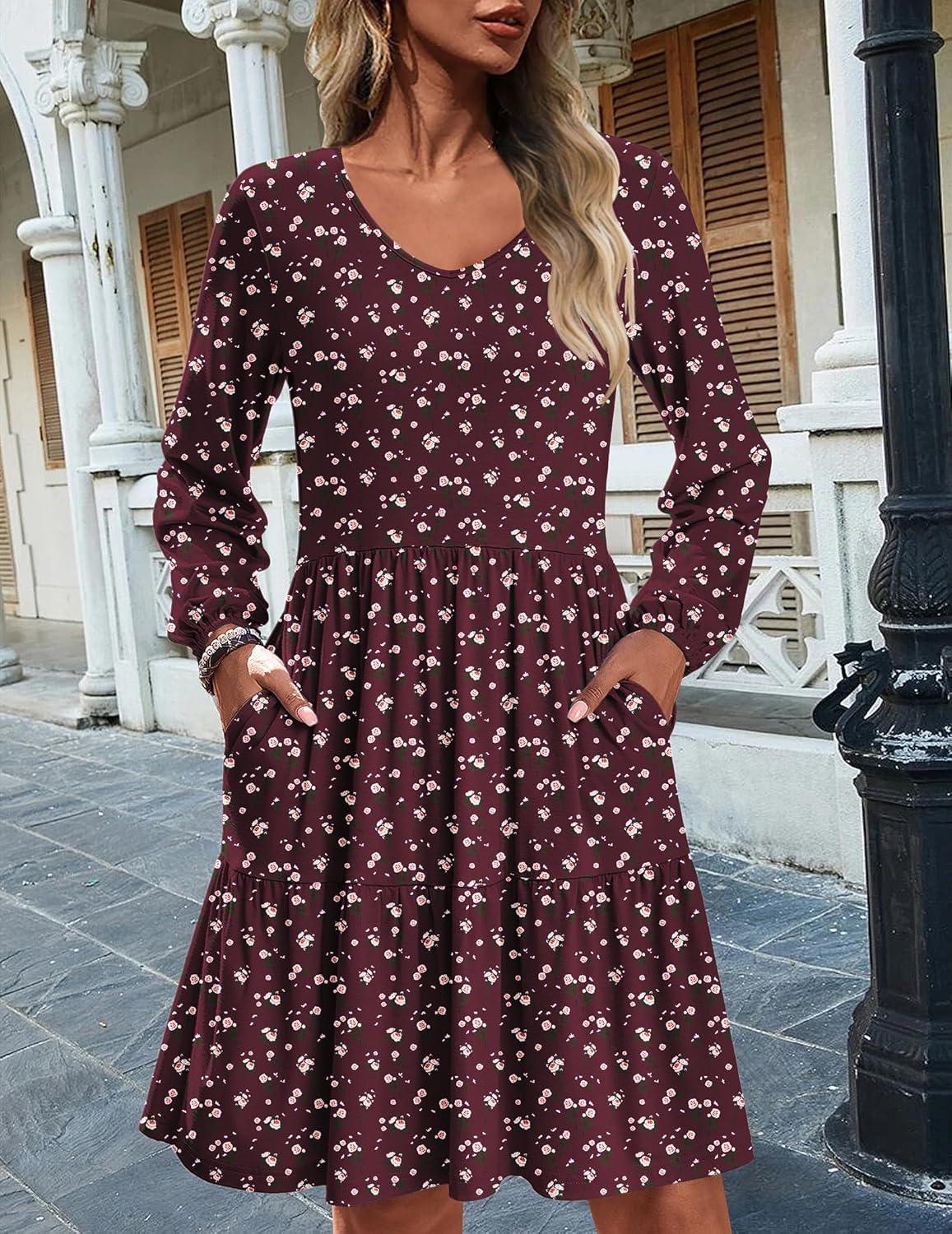 HOTOUCH Womens Casual A Line Dress V Neck Tiered Long Sleeve Fit Swing Dress with Pockets Loose Ruffled Dresses(Red Floral-02)