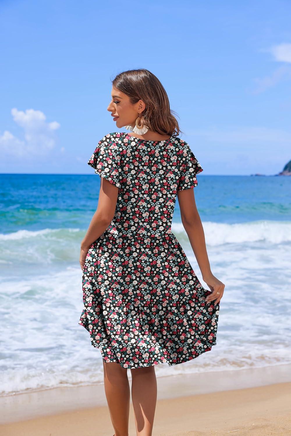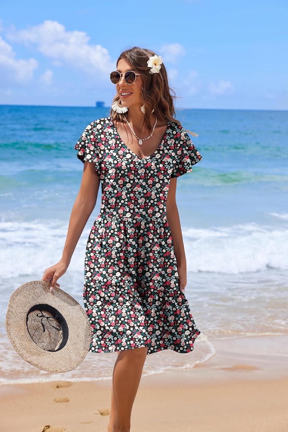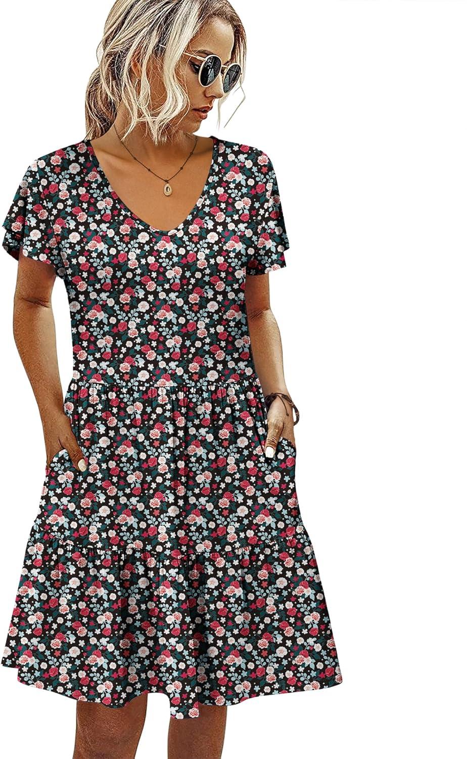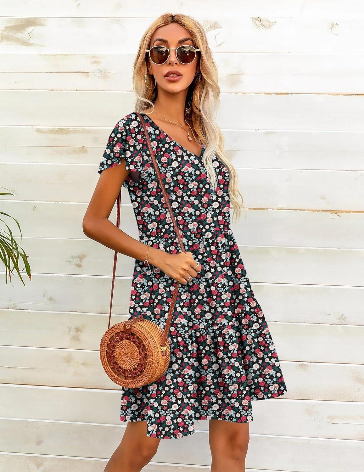 HOTOUCH Women's Casual Summer Dress with Pockets V Neck Ruffle Sleeve A-Line Dresses(Black Floral-printed)