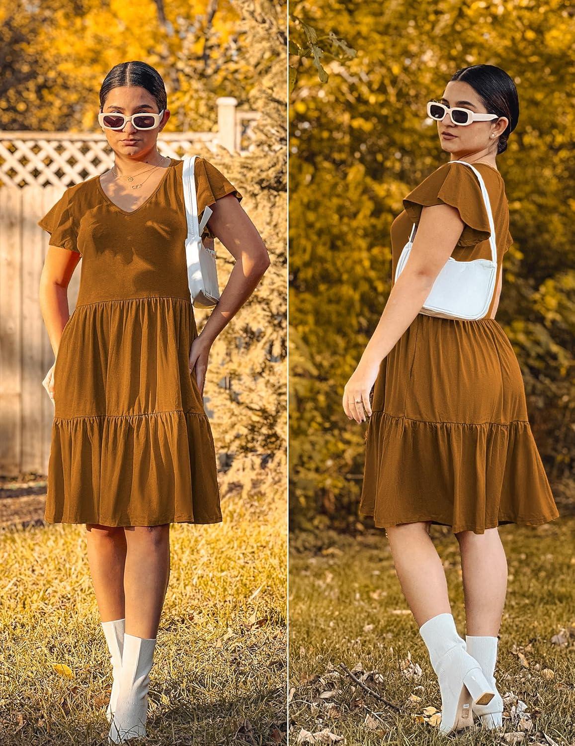 HOTOUCH Women’s Casual Summer Dress with Pockets V Neck Ruffle Sleeve A-Line Dresses(Brown)