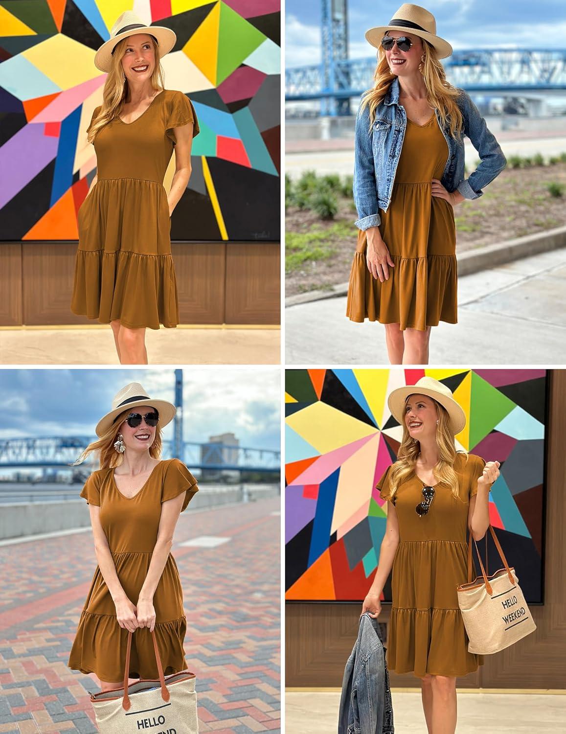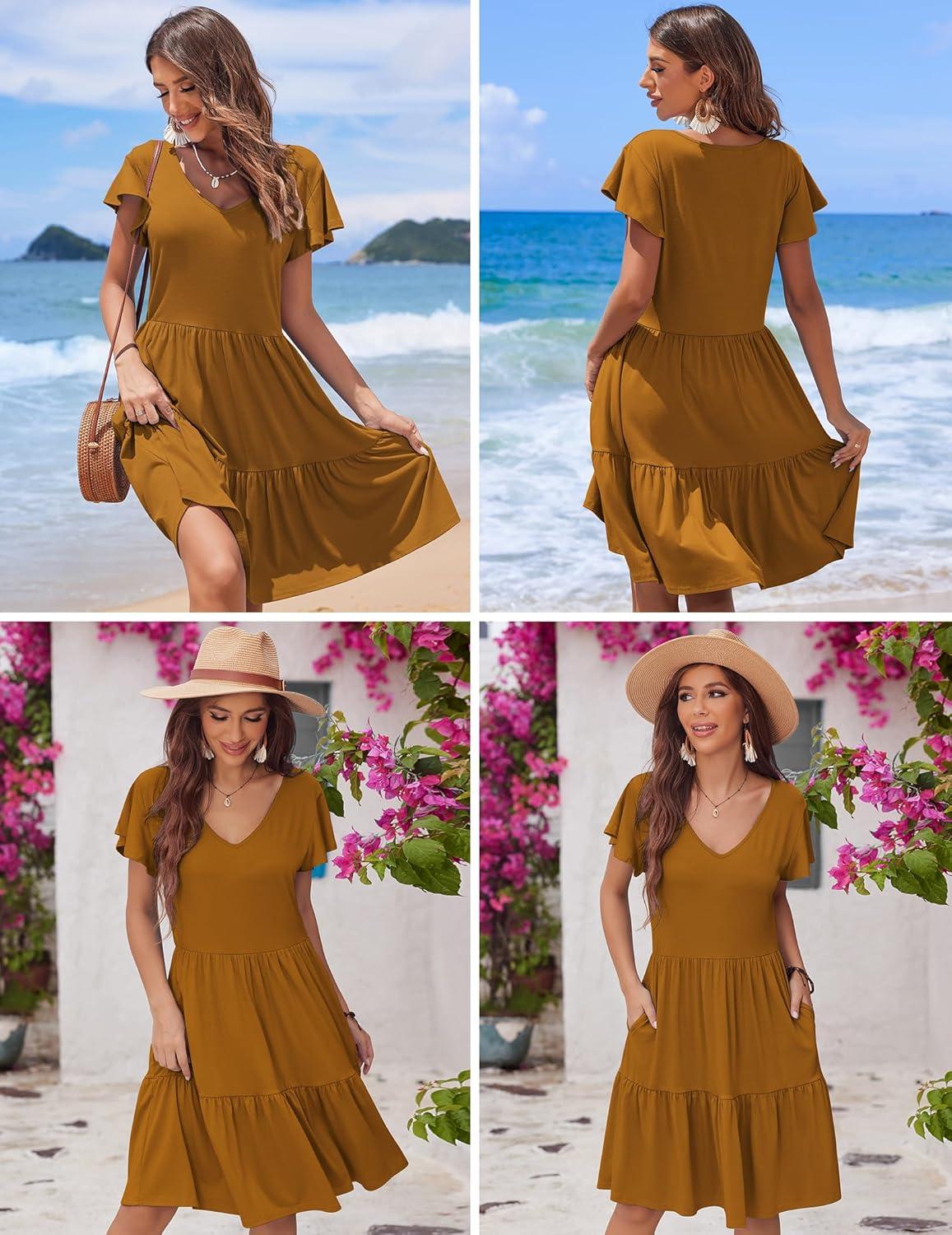 imageHOTOUCH Womens Casual Summer Dress with Pockets V Neck Ruffle Sleeve ALine DressesBrown