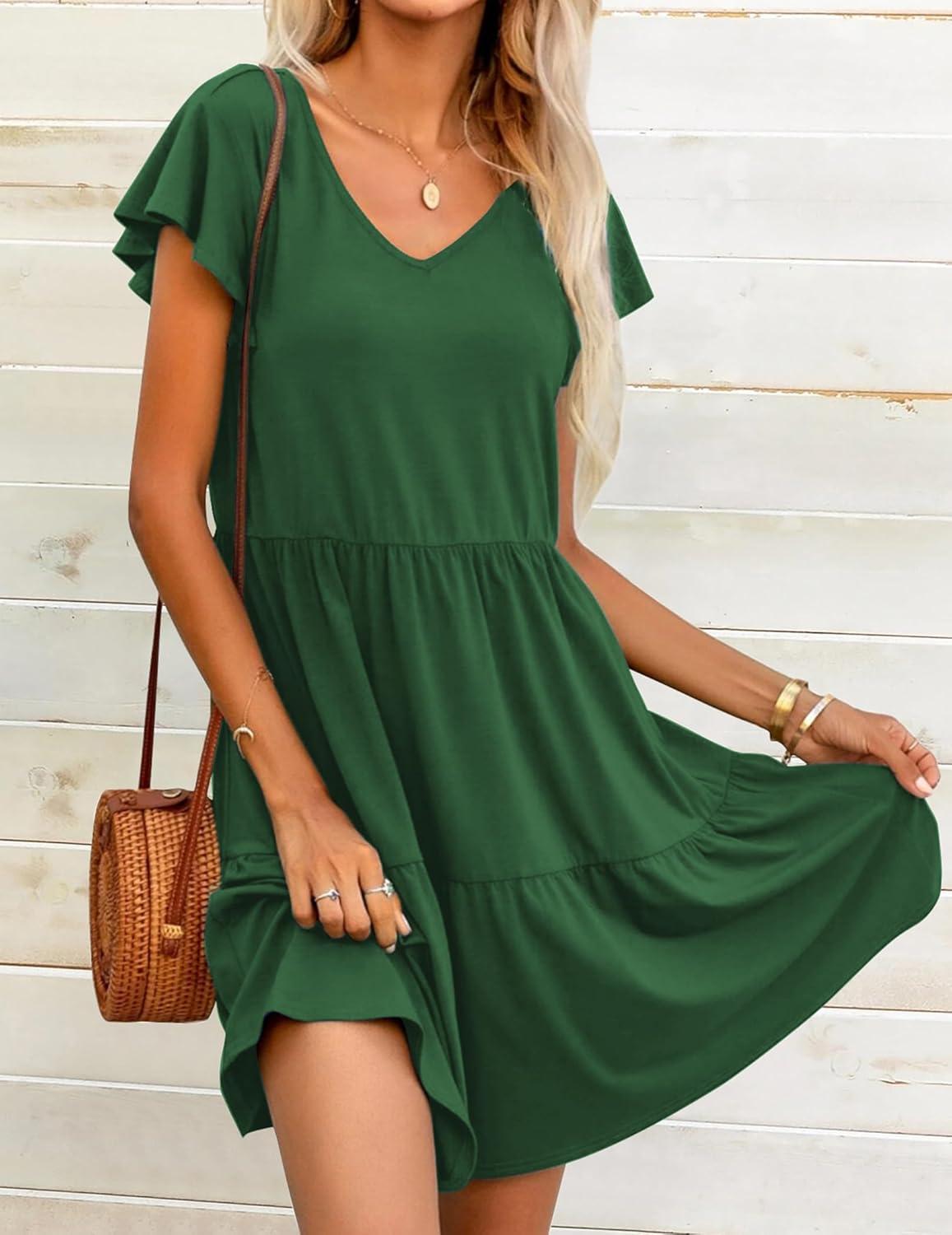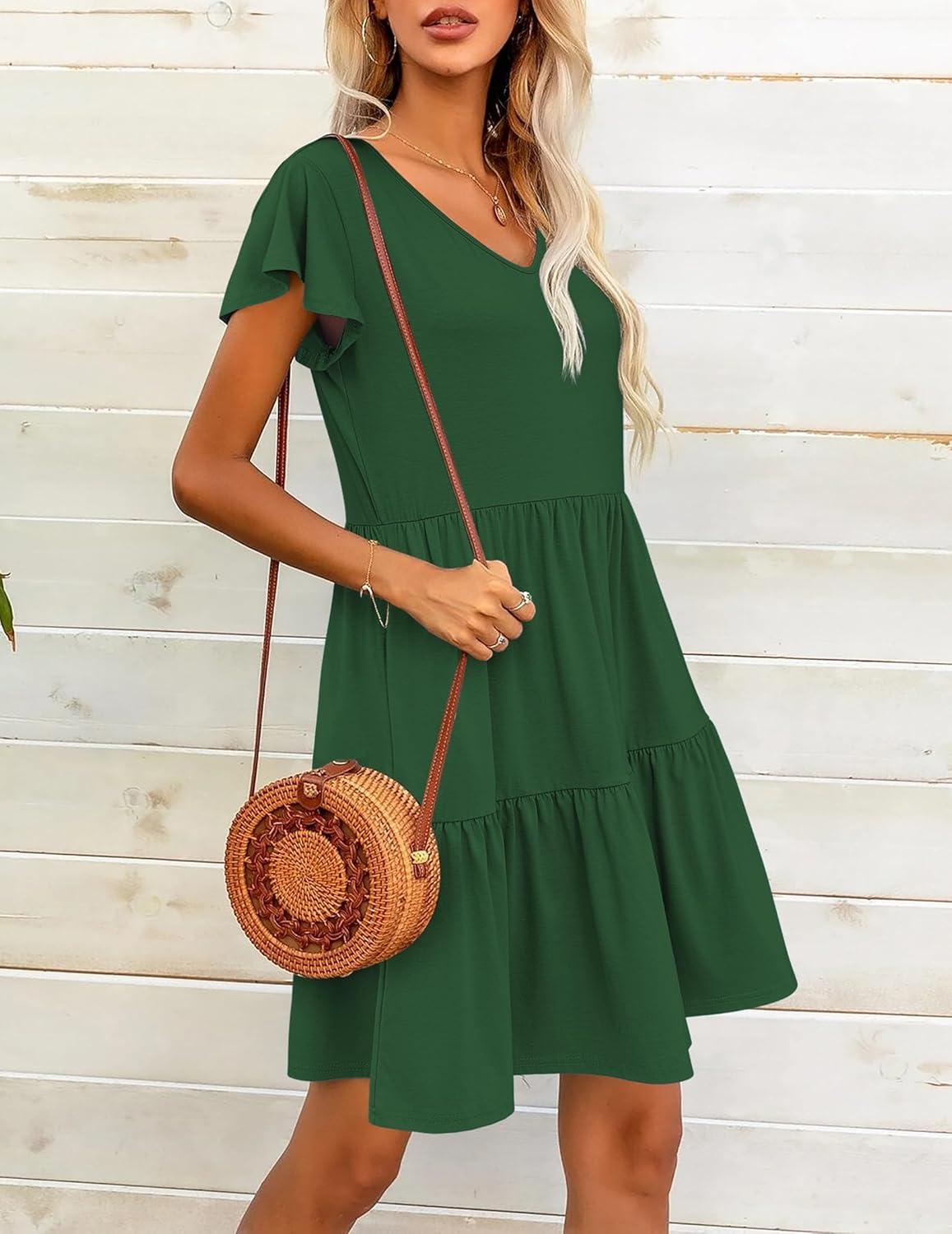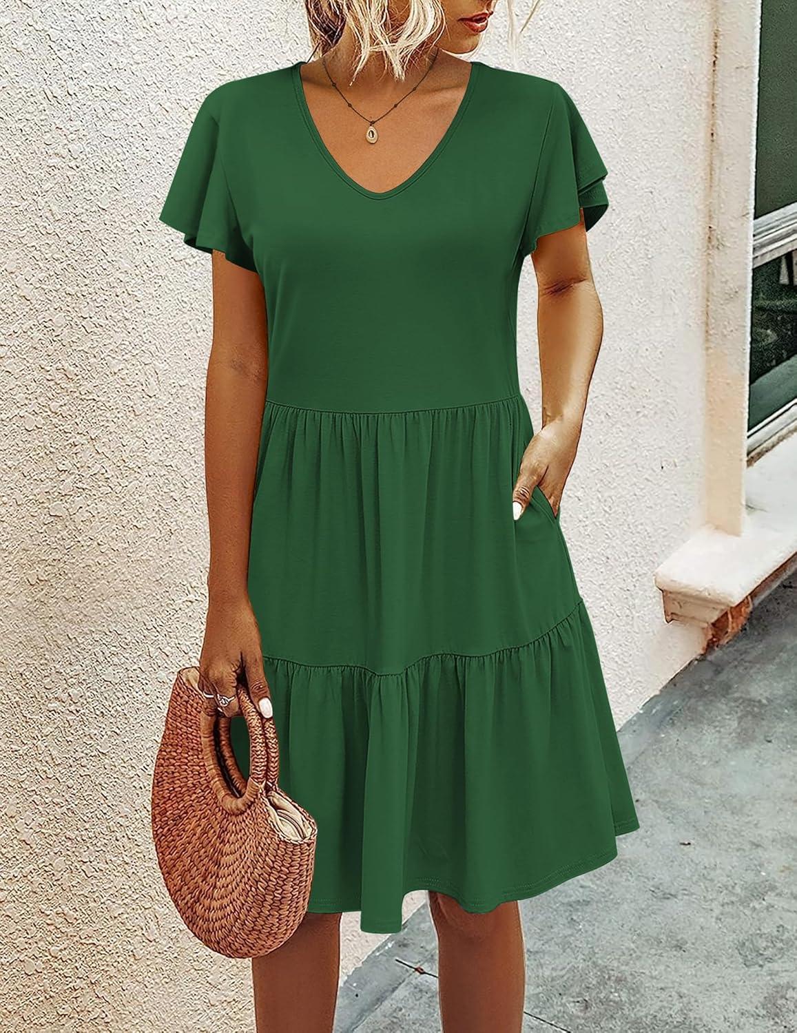 HOTOUCH Women's Casual Summer Dress with Pockets V Neck Ruffle Sleeve A-Line Dresses(Dark Green)