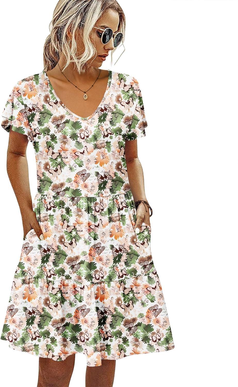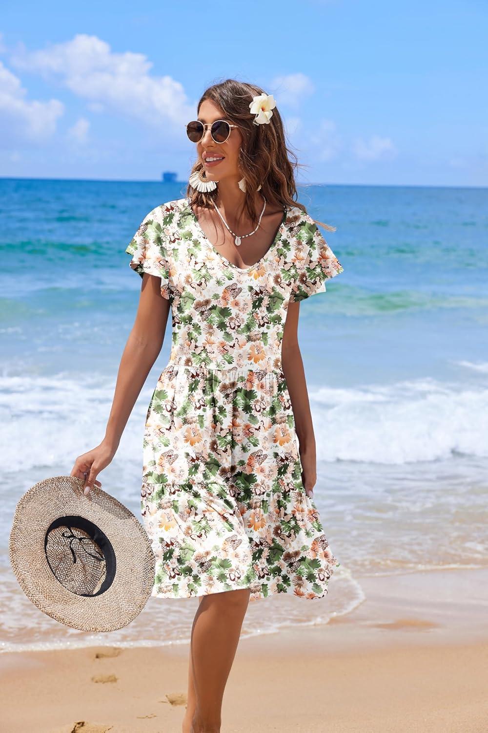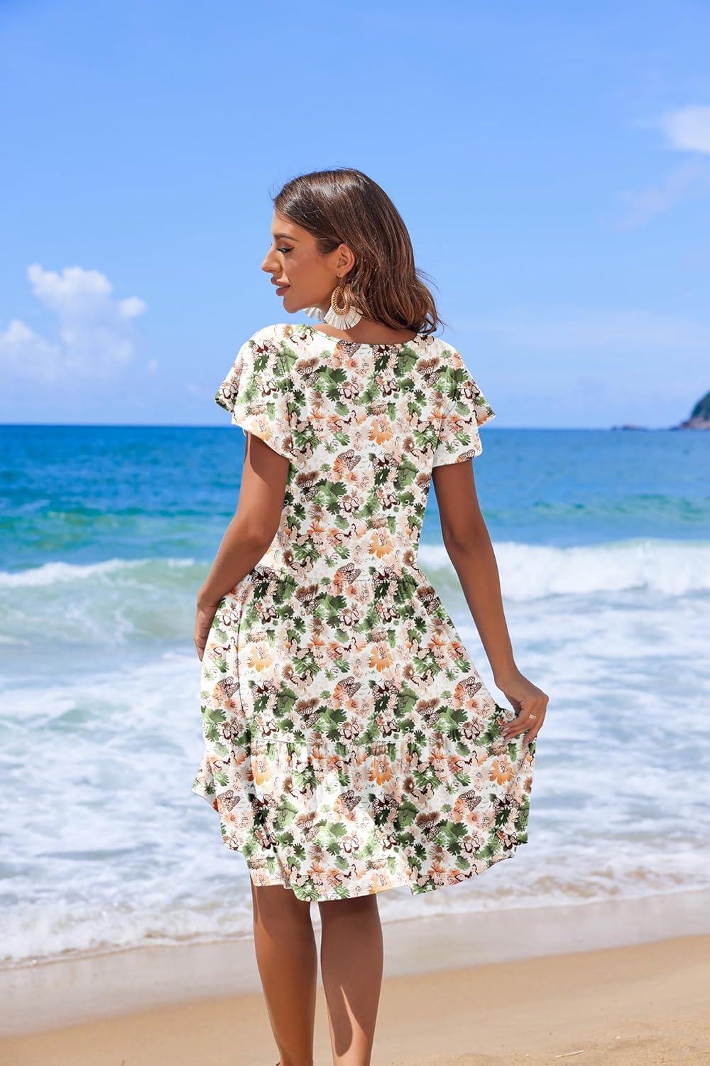 HOTOUCH Women's Casual Summer Dress with Pockets V Neck Ruffle Sleeve A-Line Dresses(Floral-printed-2)