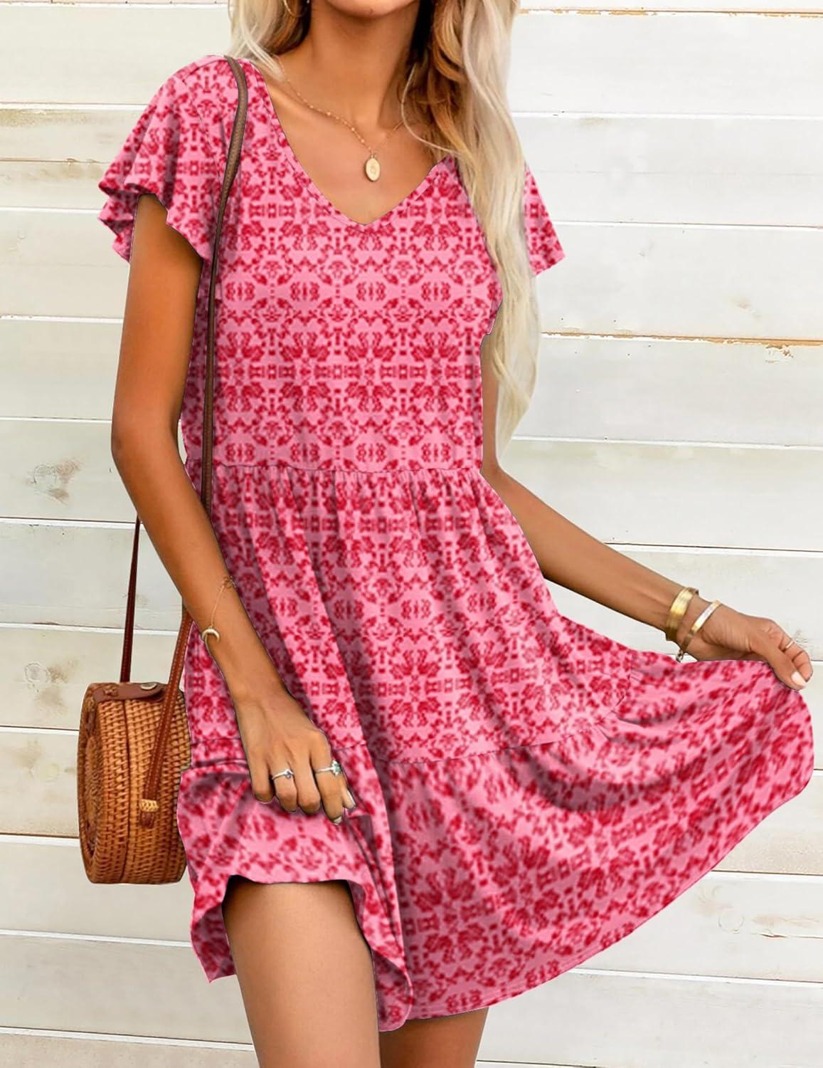 HOTOUCH Women's Casual Summer Dress with Pockets V Neck Ruffle Sleeve A-Line Dresses(Printed Red)