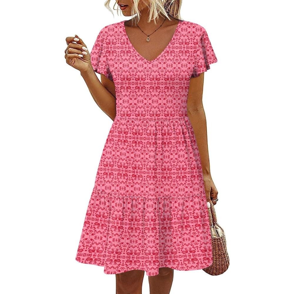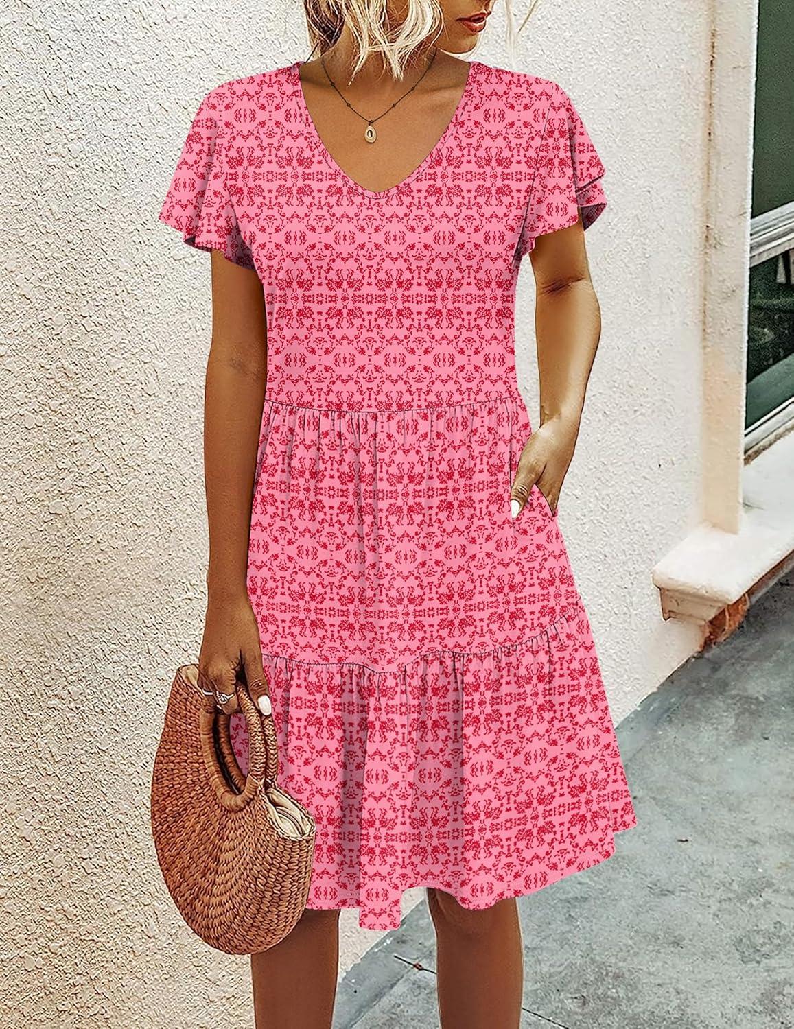 HOTOUCH Women’s Casual Summer Dress with Pockets V Neck Ruffle Sleeve A-Line Dresses(Printed Red)