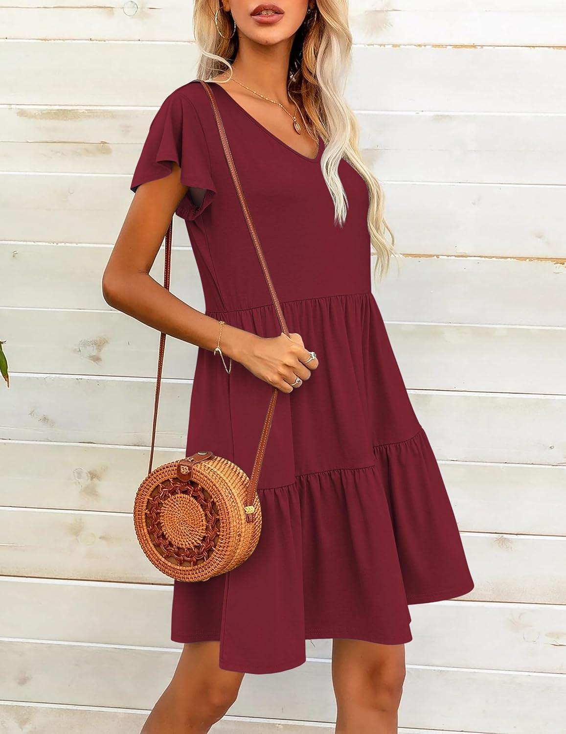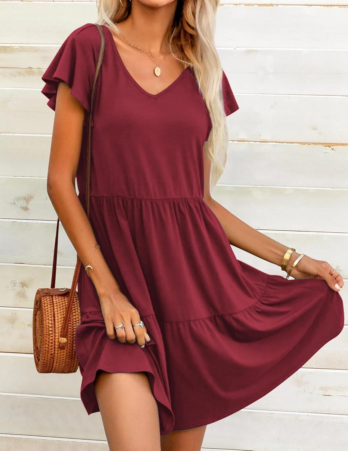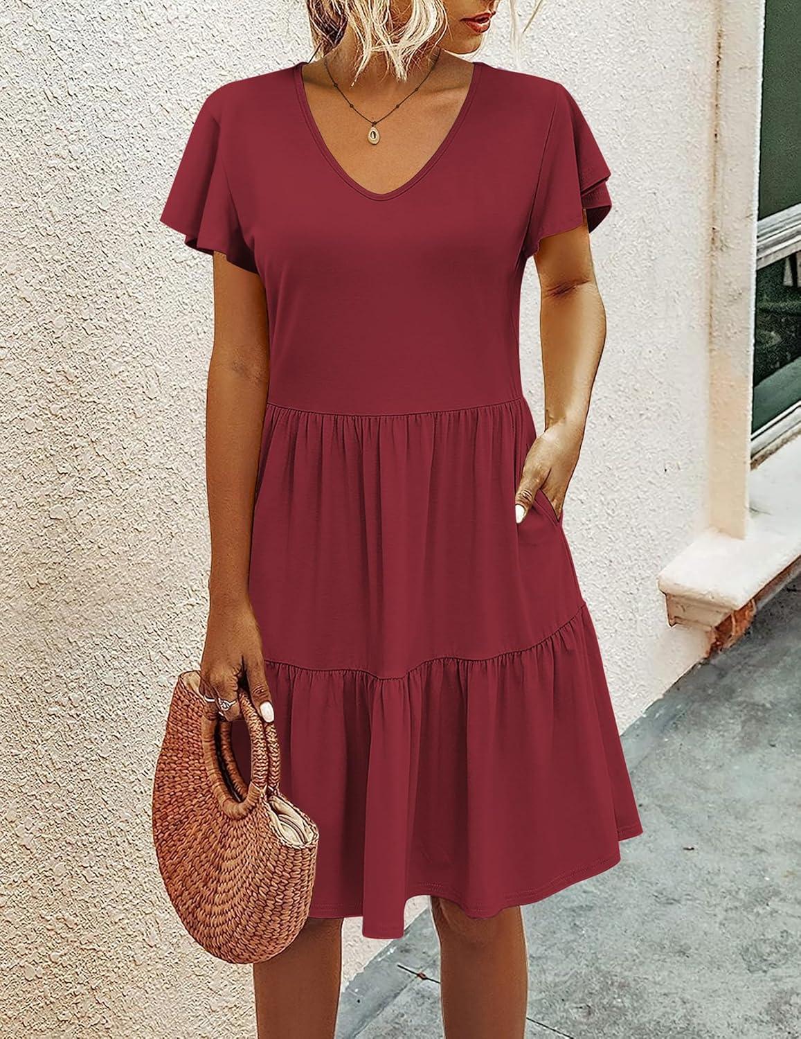 HOTOUCH Women’s Casual Summer Dress with Pockets V Neck Ruffle Sleeve A-Line Dresses(Wine Red)