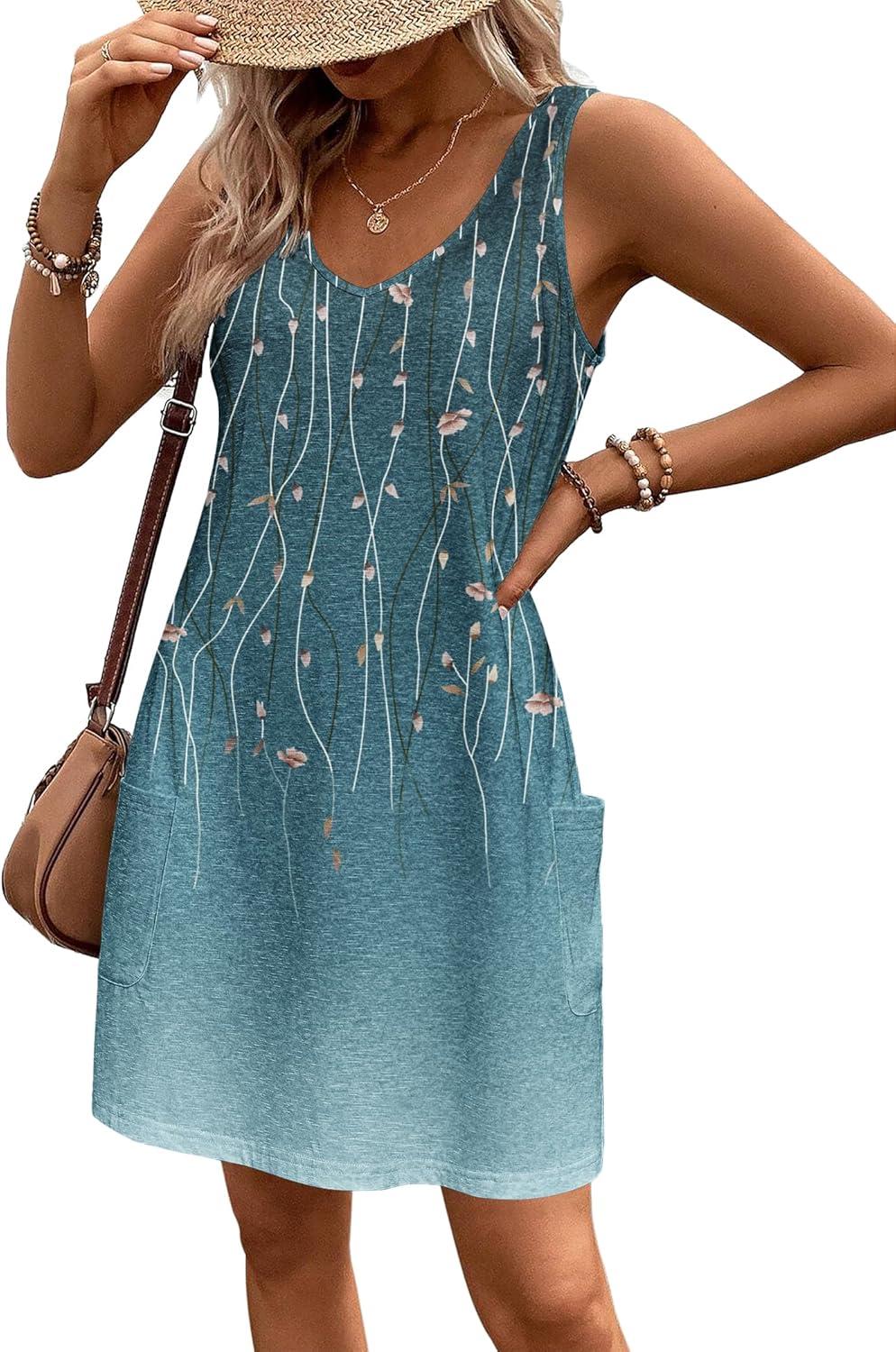 imageHOTOUCH Womens Casual Sundress with Pockets Summer Beach Dress Floral TShirts Dress V Neck Loose Tank DressesBlue Green Floral