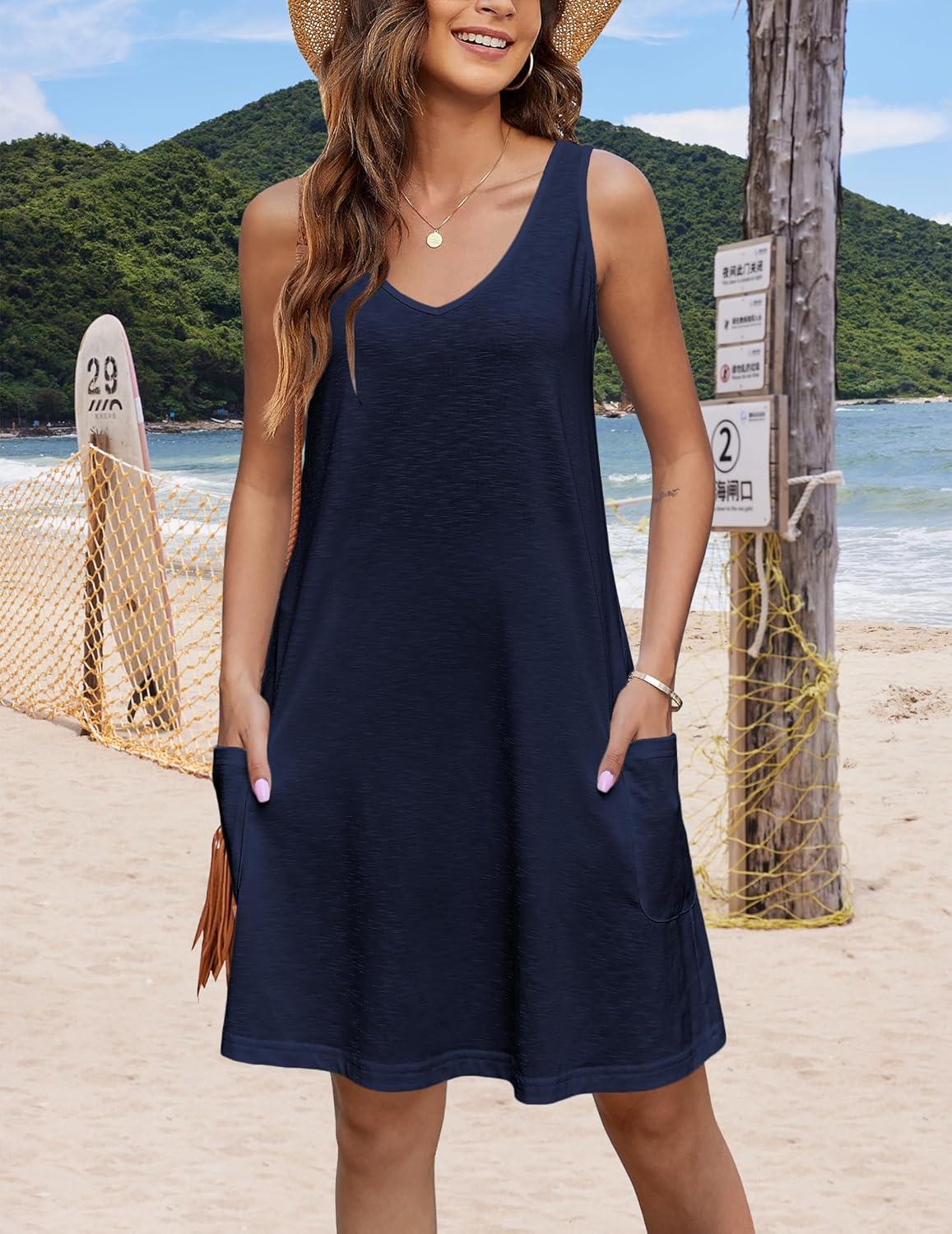 imageHOTOUCH Womens Casual Sundress with Pockets Summer Beach Dress Floral TShirts Dress V Neck Loose Tank DressesNavy Blue