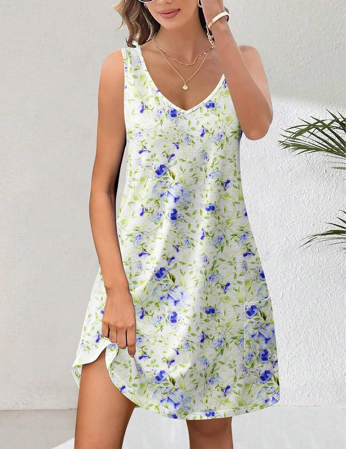 HOTOUCH Women's Casual Sundress with Pockets Summer Beach Dress Floral T-Shirts Dress V Neck Loose Tank Dresses(White Floral-02)