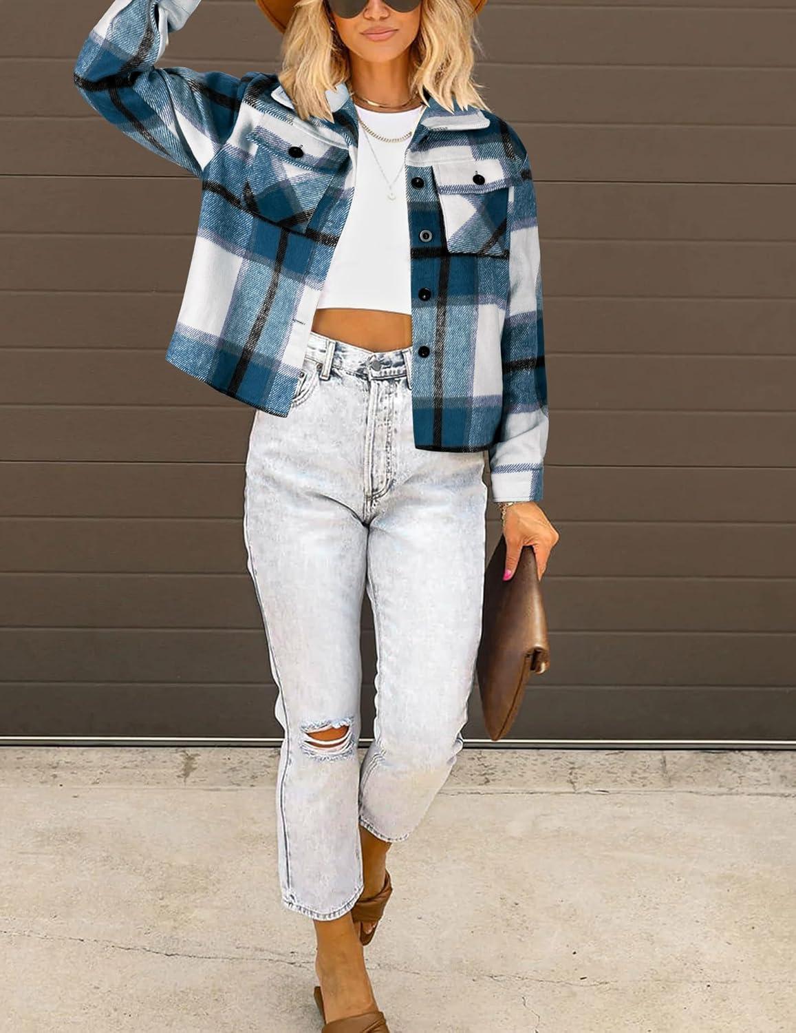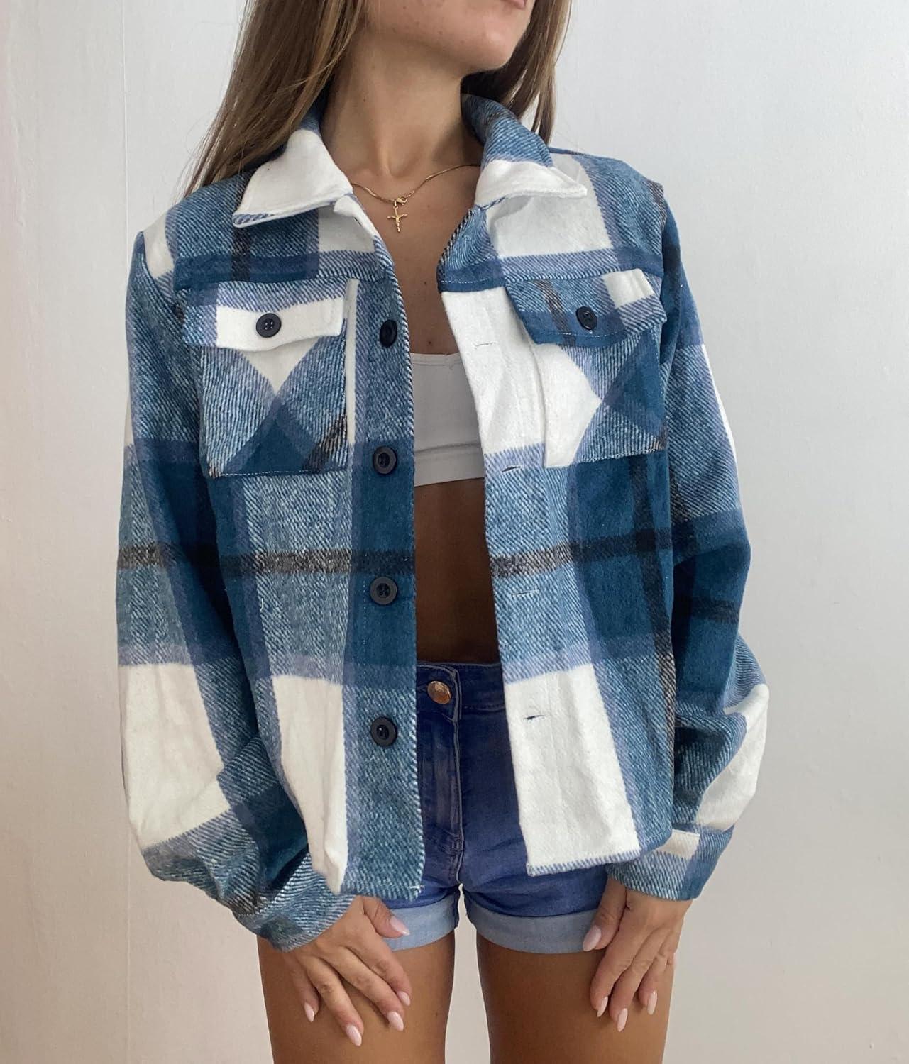 HOTOUCH Womens Flannels Fall Cropped Shacket Plaid Jacket Long Sleeve Button Down Coat 2025 Fall Fashion Trendy Outfits(Blue White Flannel)