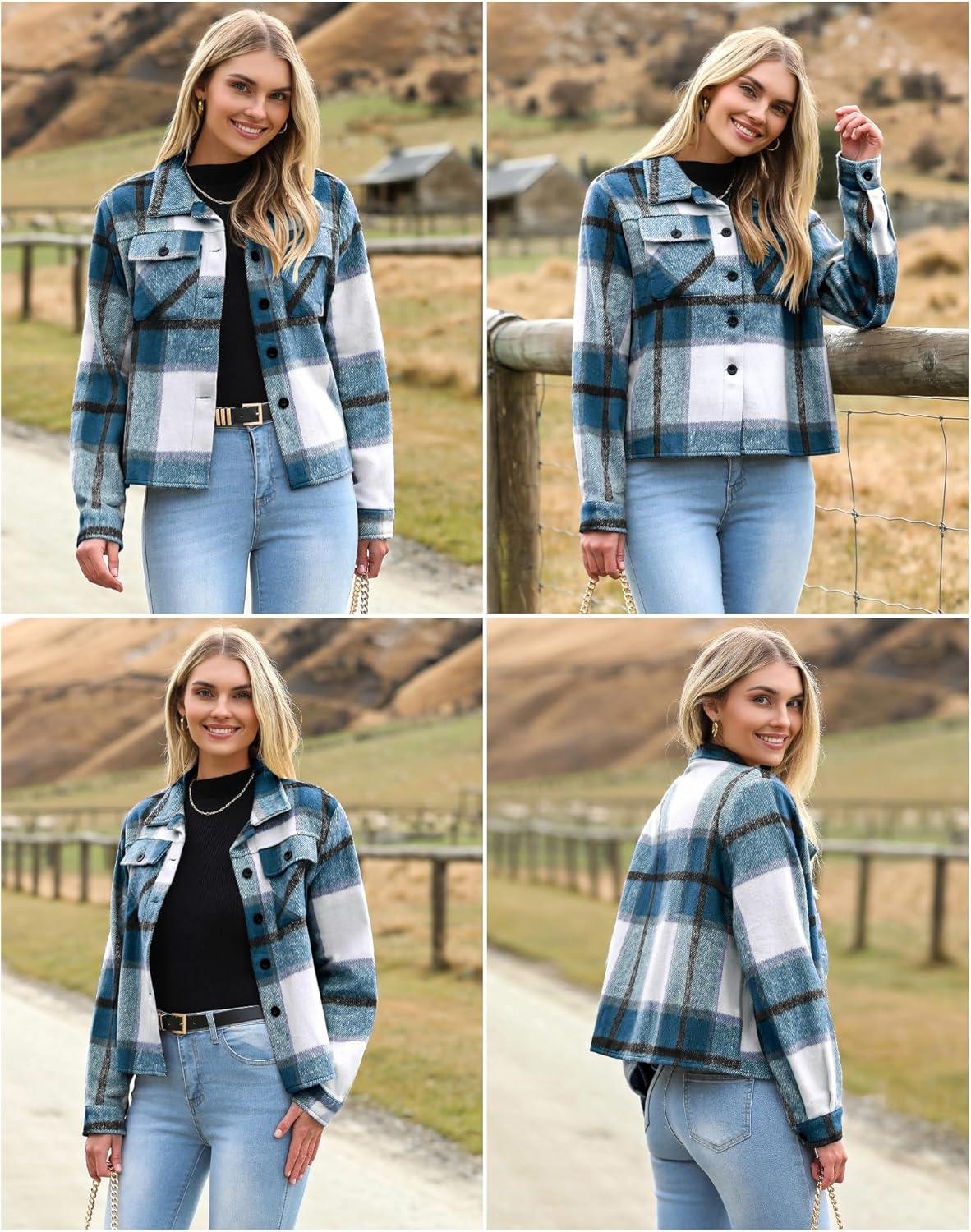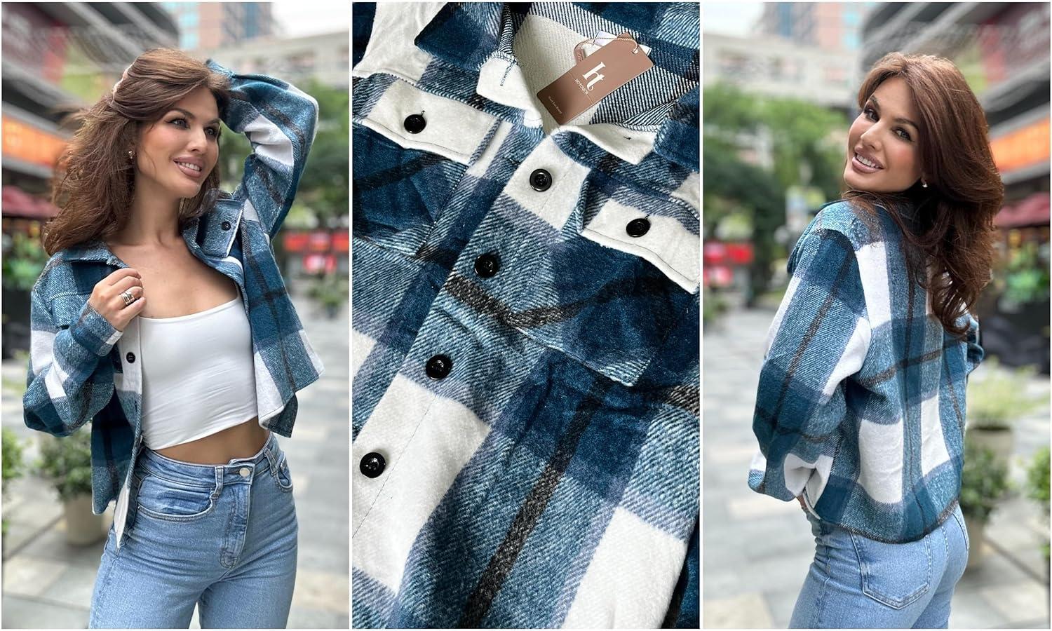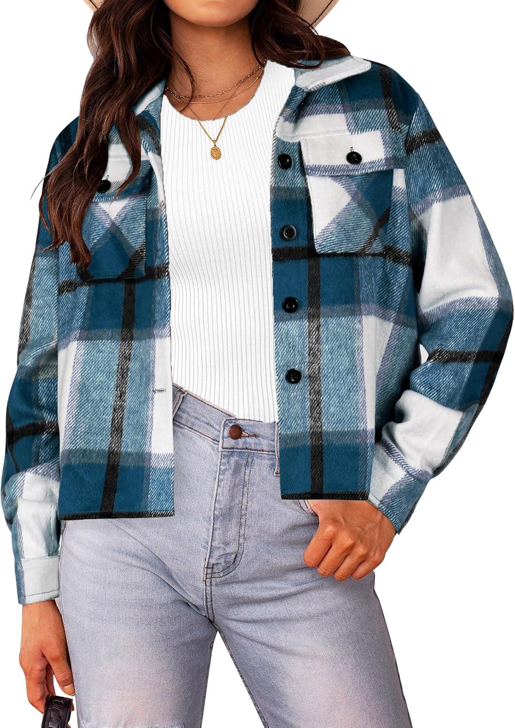 HOTOUCH Womens Flannels Fall Cropped Shacket Plaid Jacket Long Sleeve Button Down Coat 2025 Fall Fashion Trendy Outfits(Blue Black Flannel)