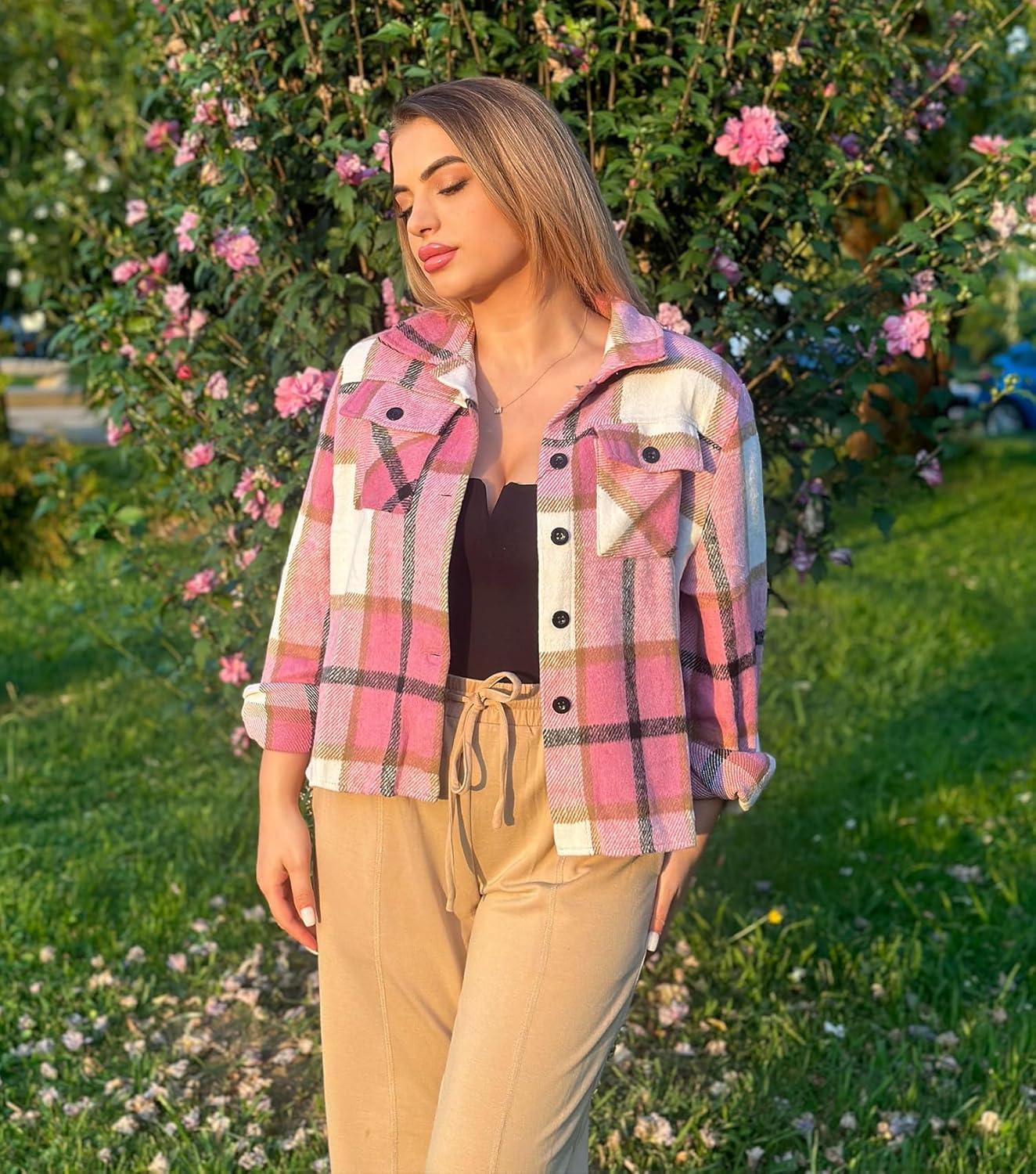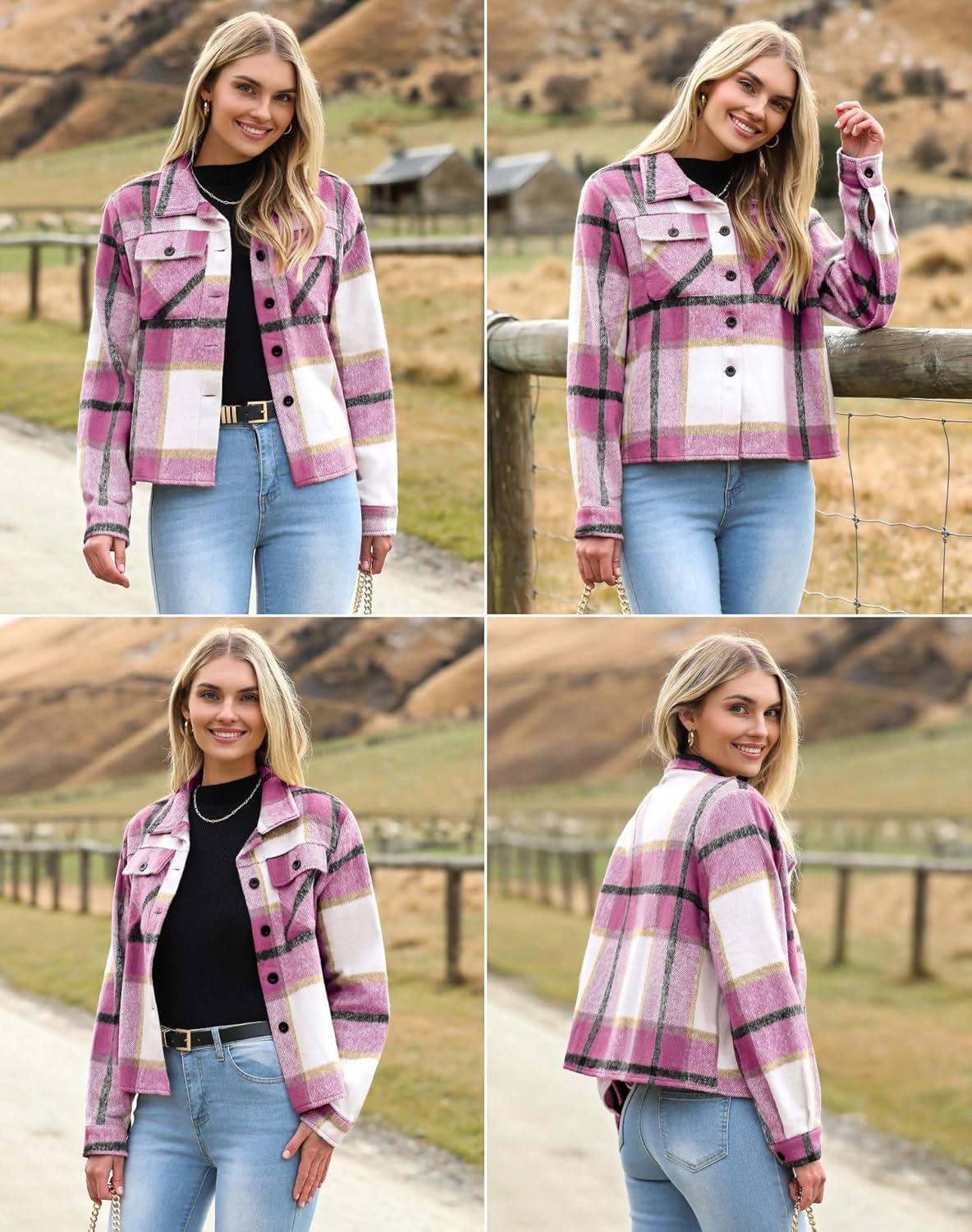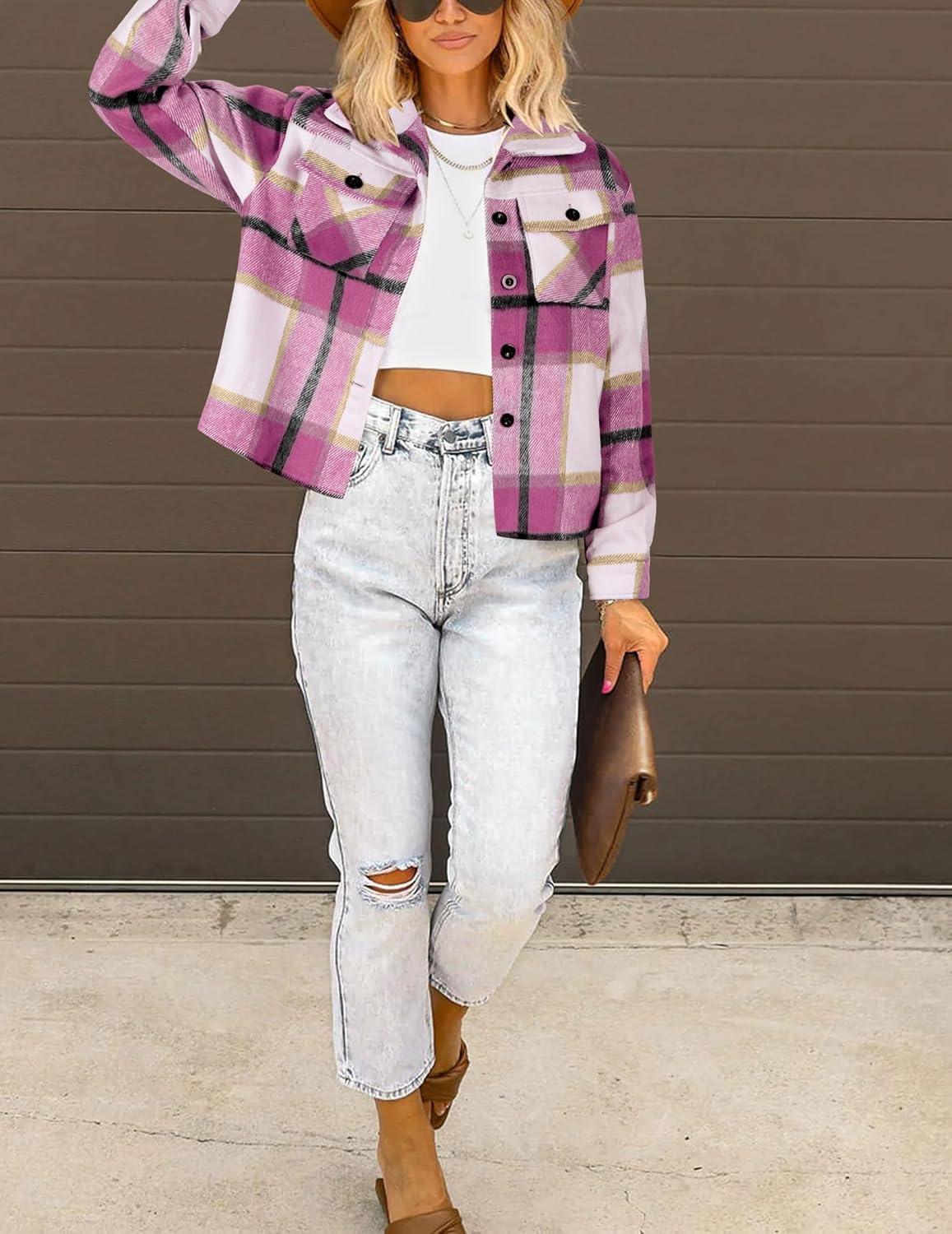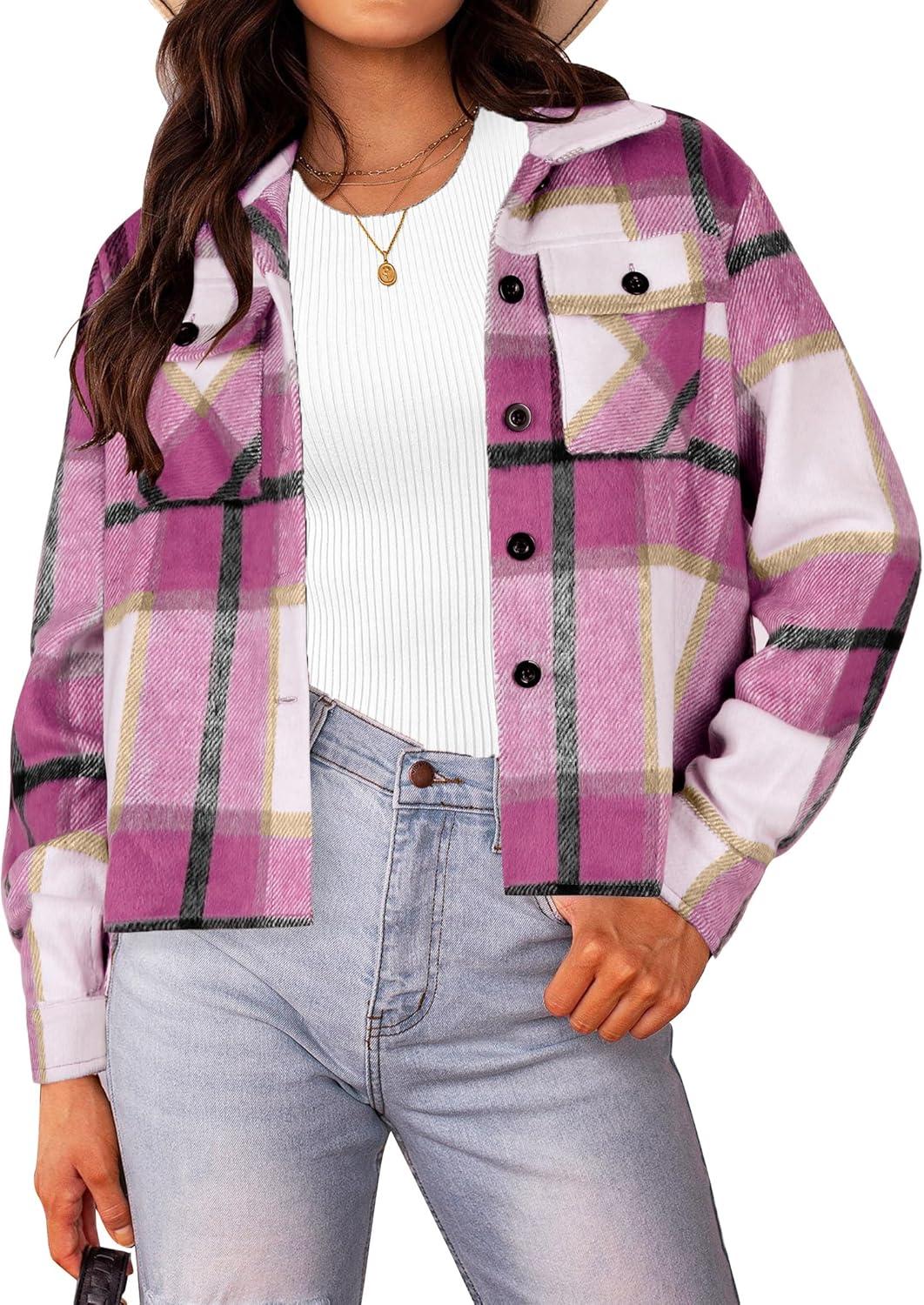 HOTOUCH Womens Flannels Fall Cropped Shacket Plaid Jacket Long Sleeve Button Down Coat 2025 Fall Fashion Trendy Outfits(Fusica Flannel)