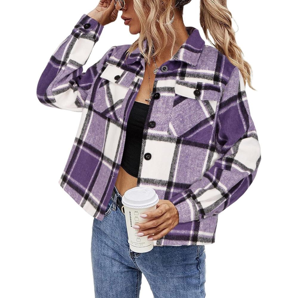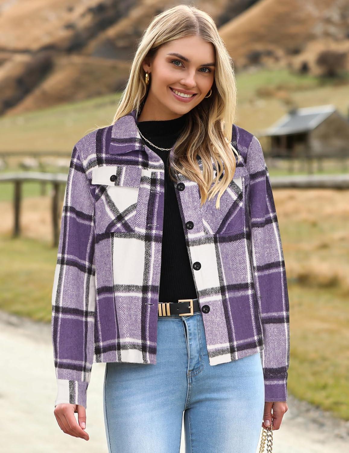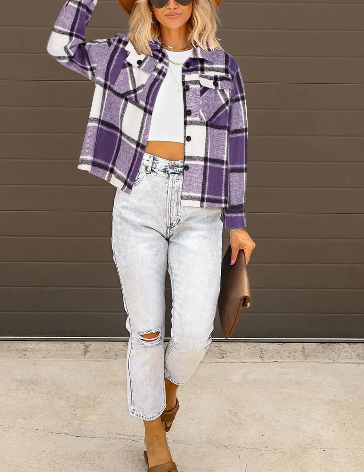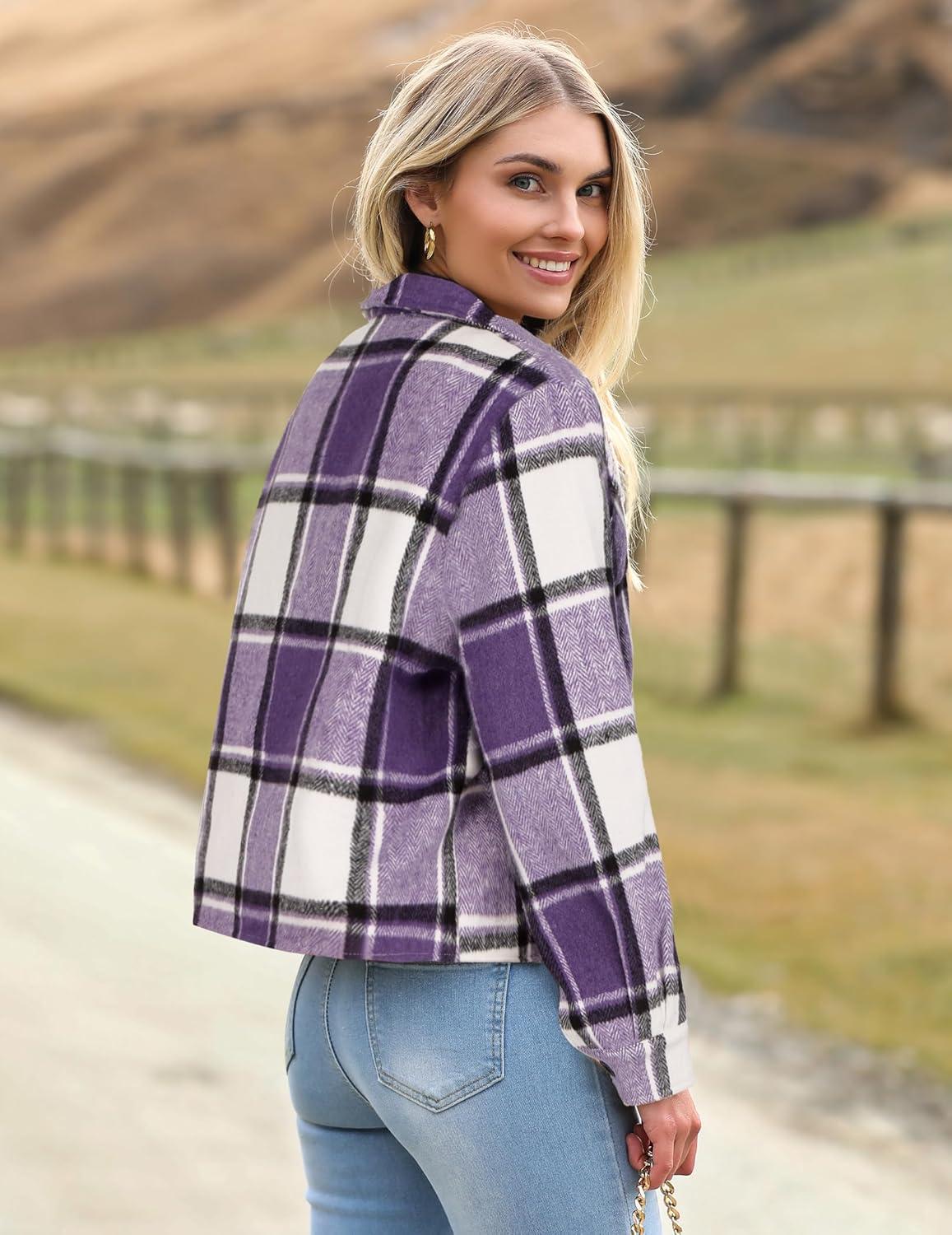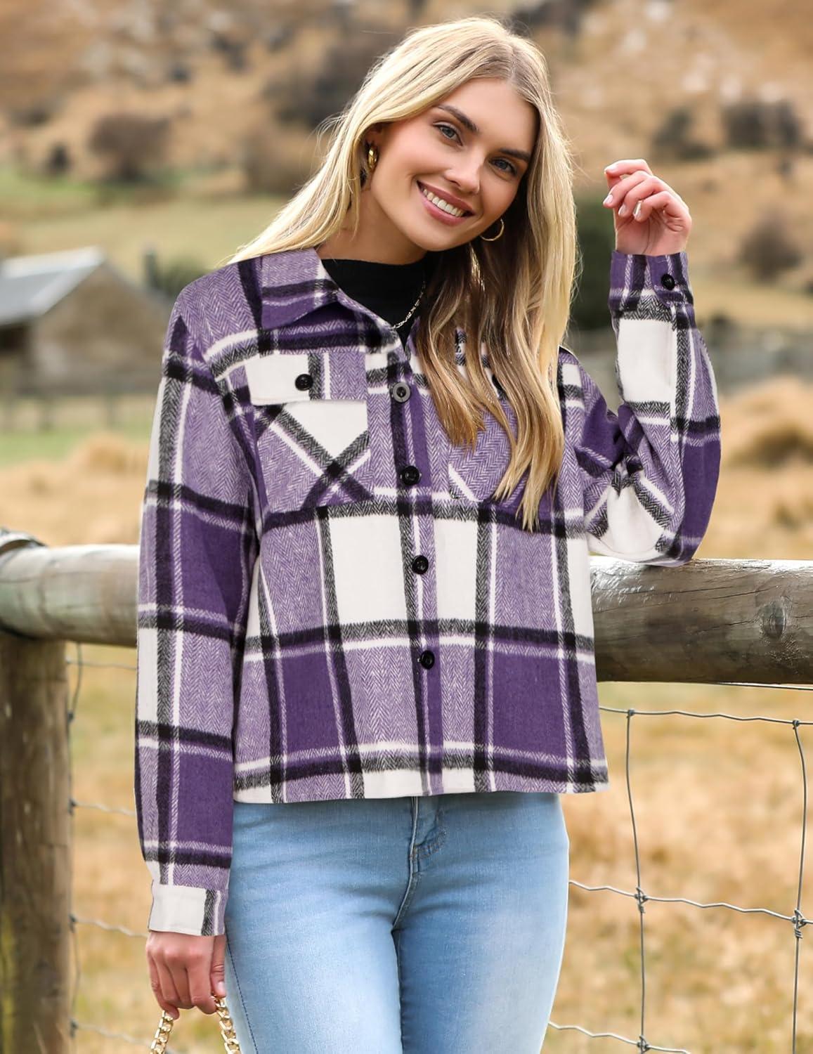 HOTOUCH Womens Flannels Fall Cropped Shacket Plaid Jacket Long Sleeve Button Down Coat 2025 Fall Fashion Trendy Outfits(Purple White Flannel)