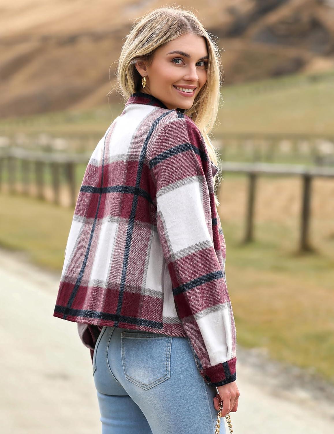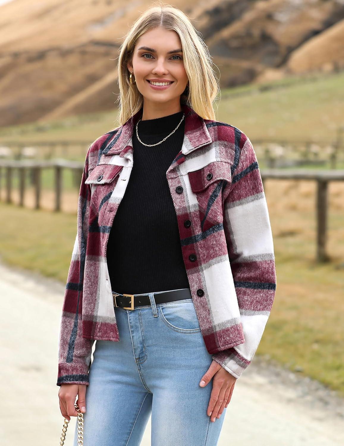 HOTOUCH Womens Flannels Fall Cropped Shacket Plaid Jacket Long Sleeve Button Down Coat 2025 Fall Fashion Trendy Outfits(Fusica Flannel)